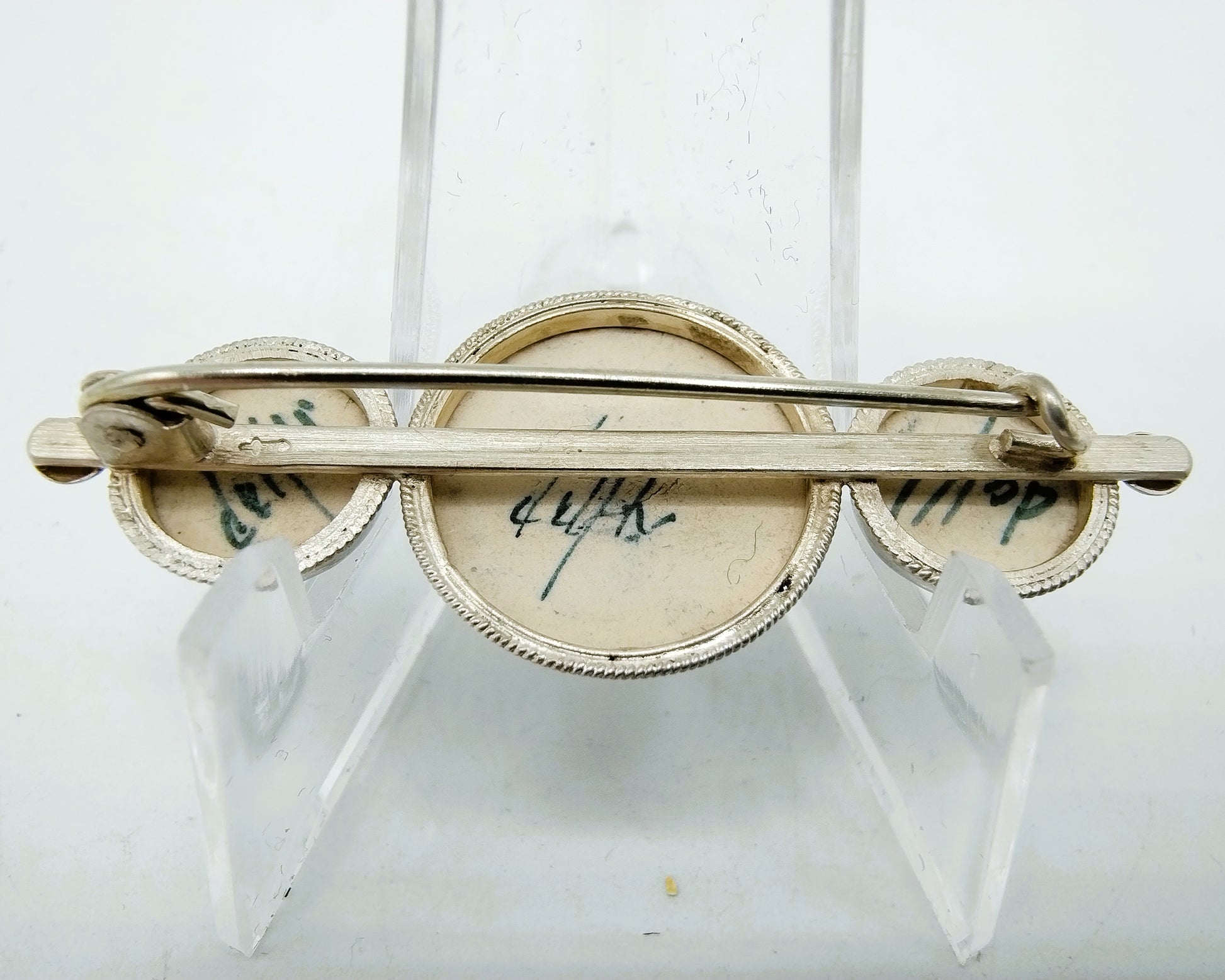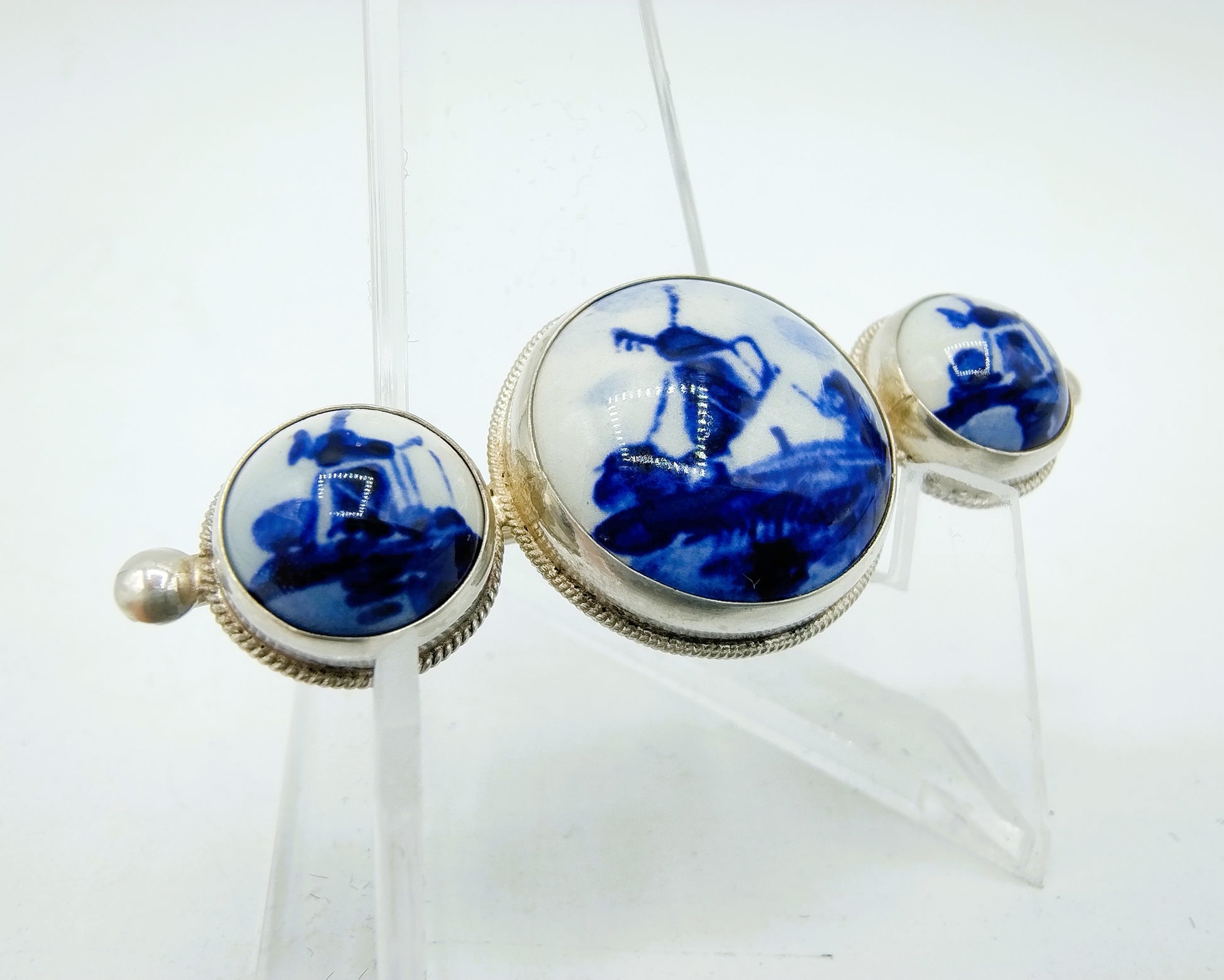 Zilveren broche met 3 Delfts blauwe keramieken afbeeldingen van een molen. Deze afbeeldingen zijn gezet in een gladde kast.