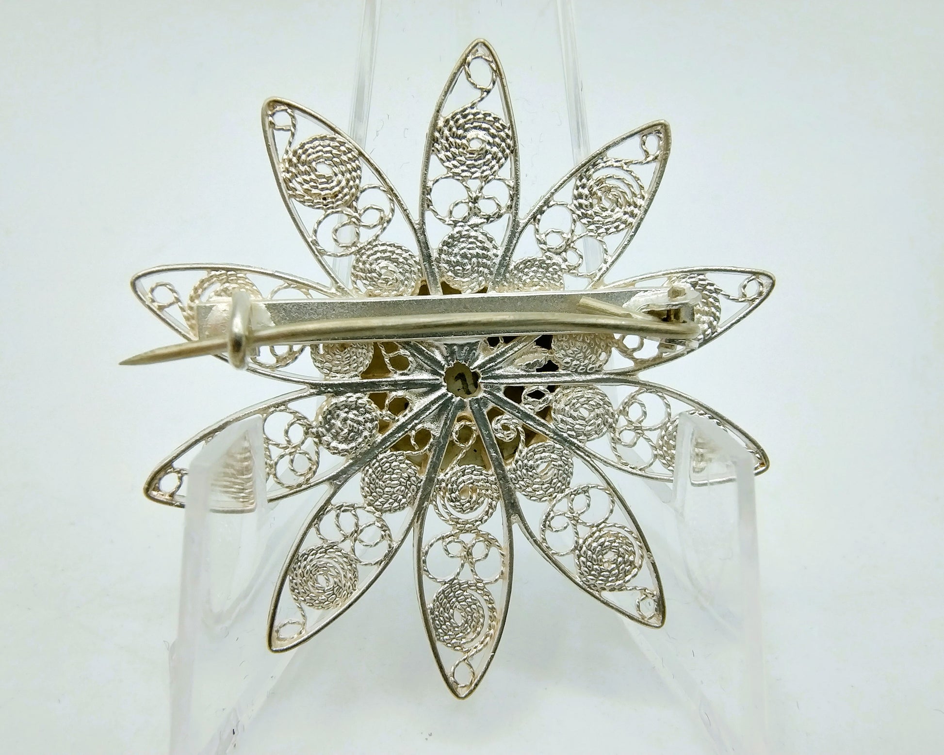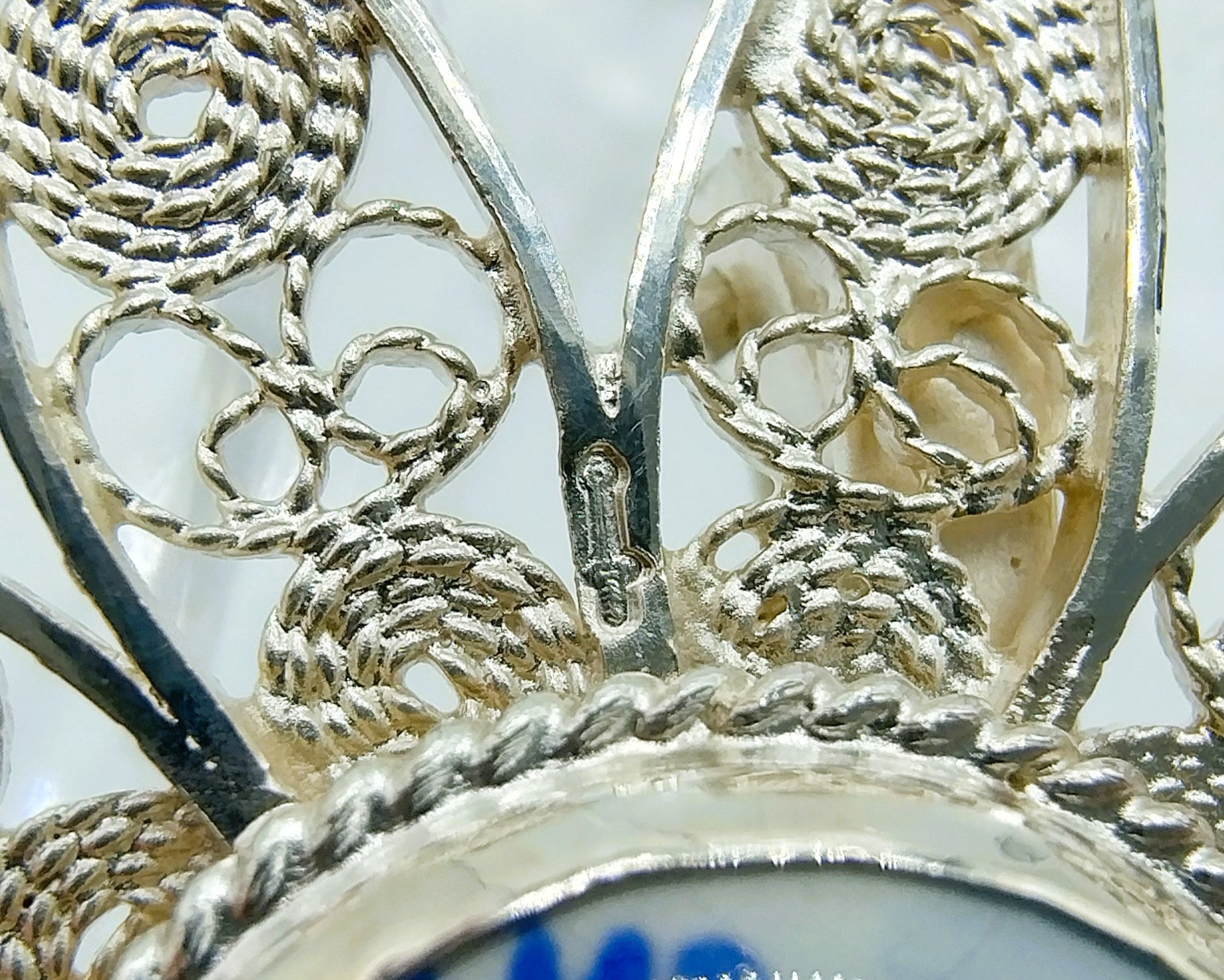 Zilveren broche met Delfts blauwe keramieken afbeelding van een molen. Deze afbeelding is gezet in een gladde kast met filigrain zilversmeedwerk.