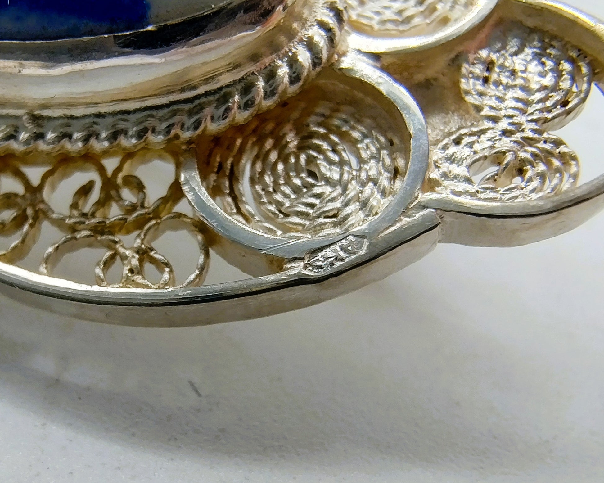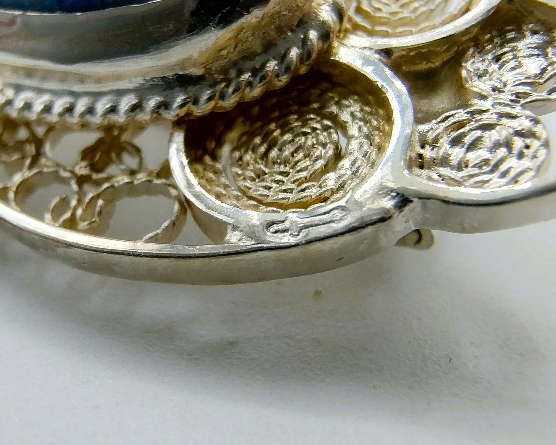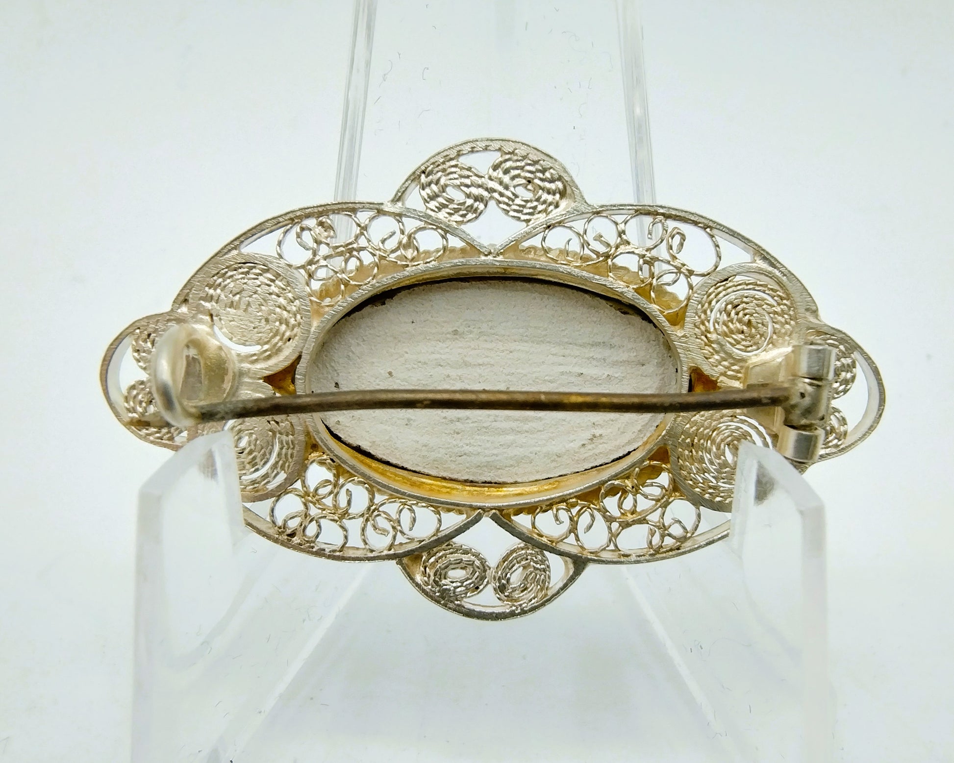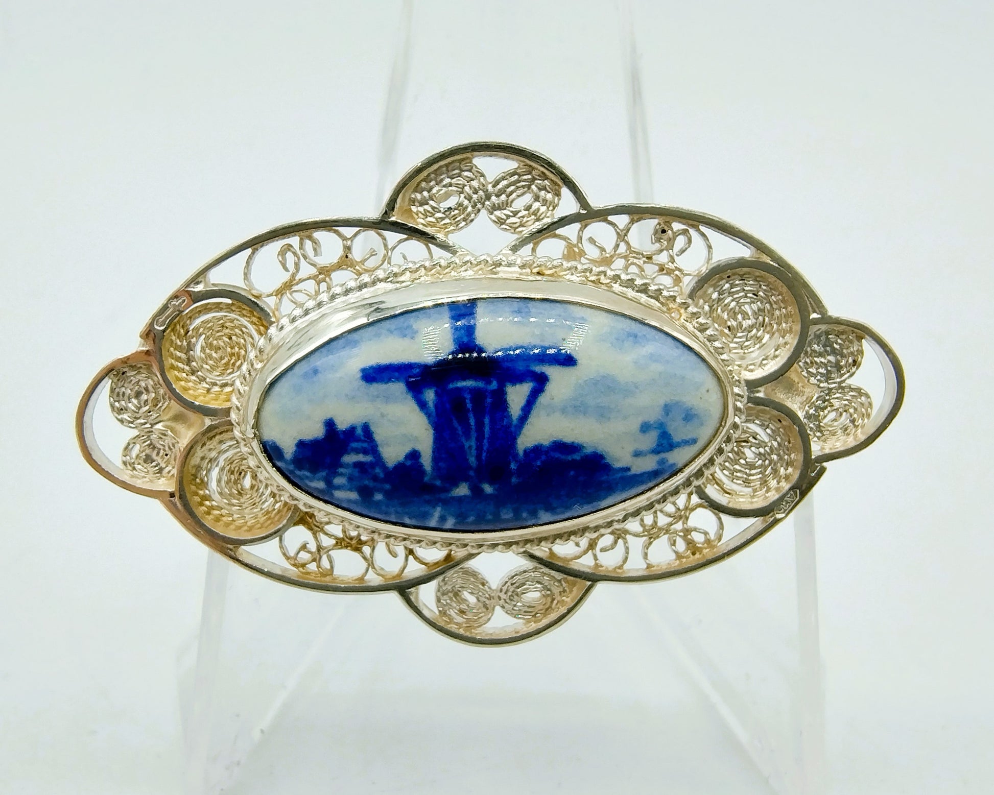 Zilveren broche met Delfts blauwe keramieken afbeelding van een molen. Deze afbeelding is gezet in een gladde kast met filigrain zilversmeedwerk.