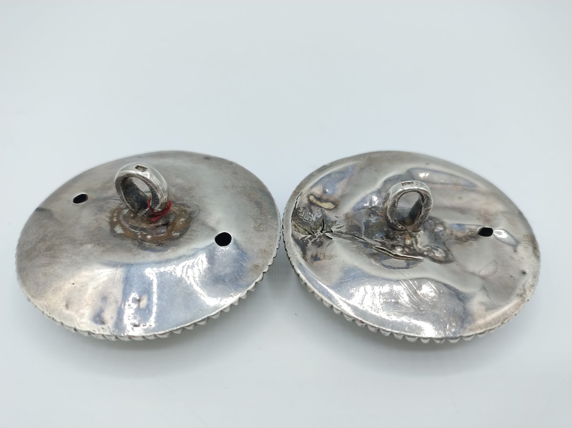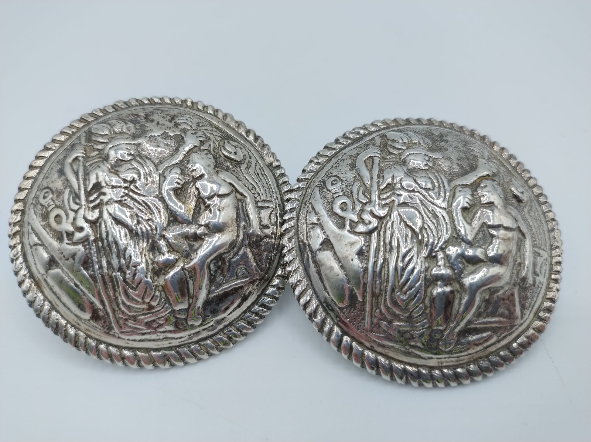 Zilveren broeksknopen met een bijbelse voorstelling. Het gaat hier om de zeldzame variant van Simson en Delila.