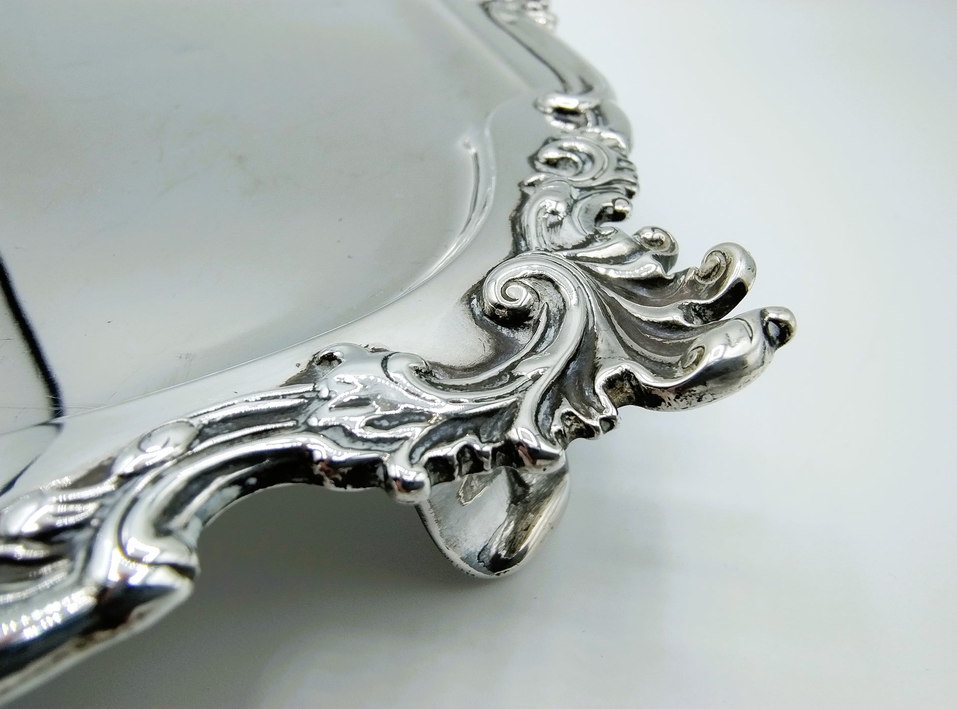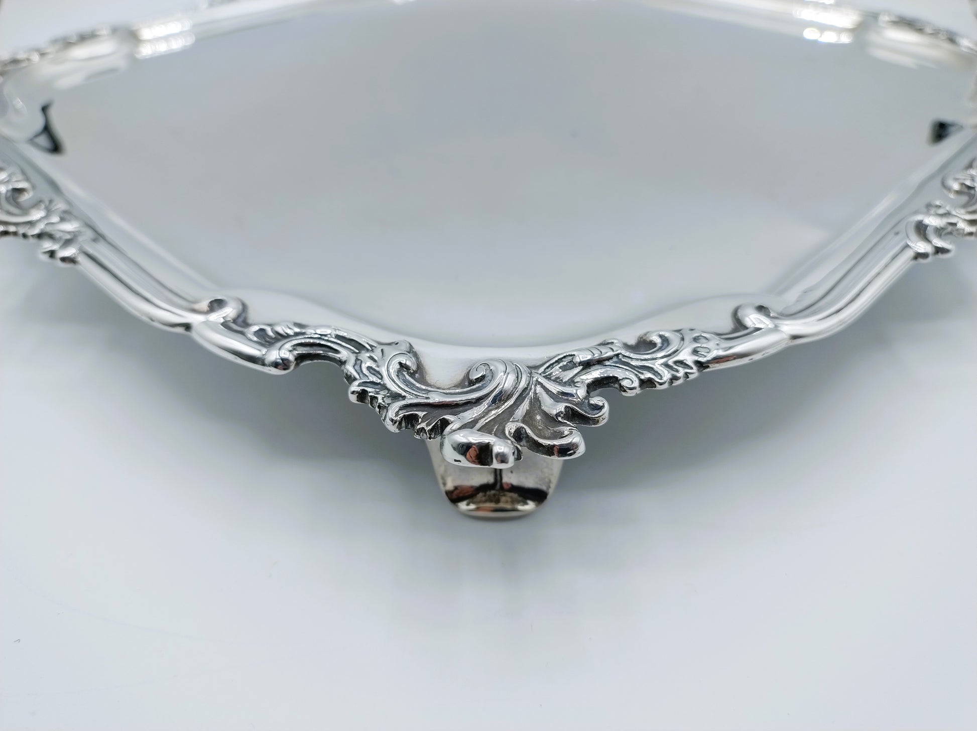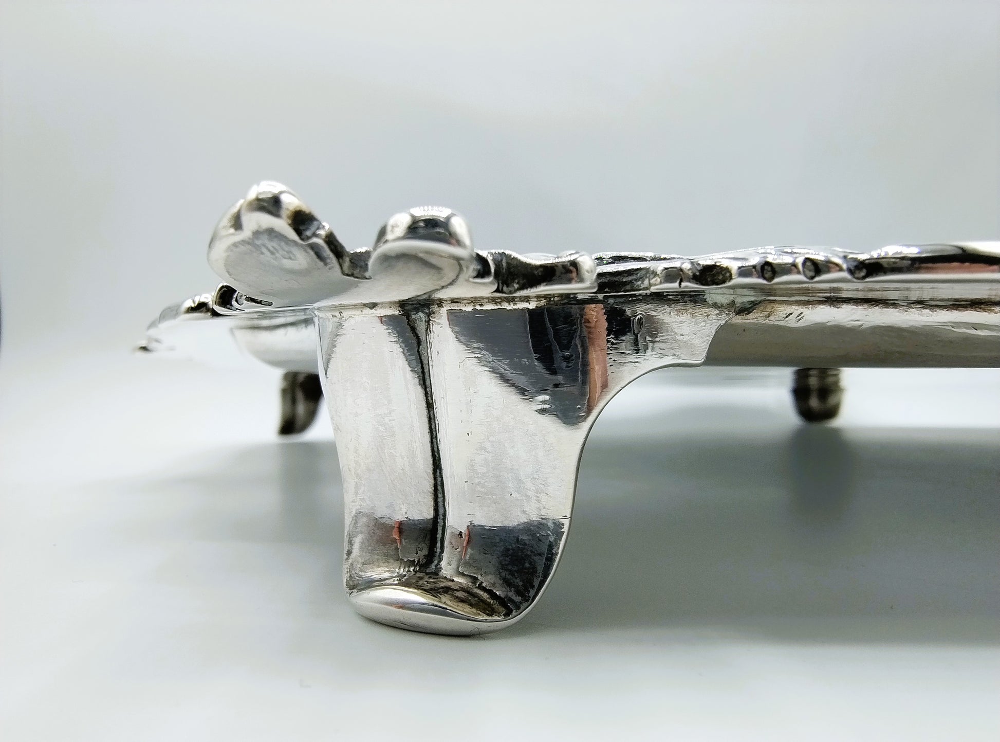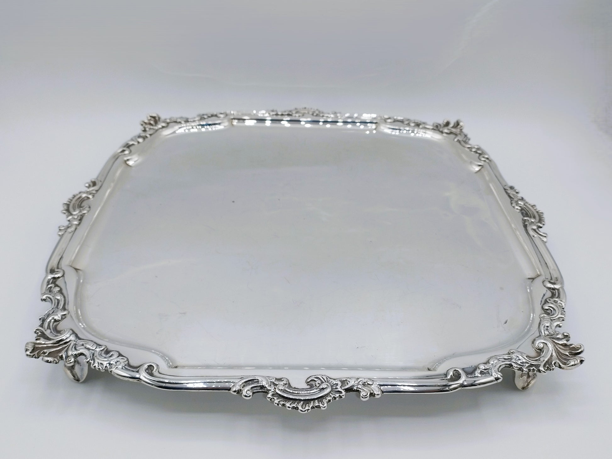 Het grote vierkante blad met afgeschuinde hoeken heeft een rijk gemodelleerde rand, fraai versierd met rocaille-ornamenten, kenmerkend voor de rococostijl. Het cabaret rust op vier paneelvormige voetjes, wat het object een statige en monumentale uitstraling geeft. De kwaliteit van het drijf- en gietwerk onderstreept het uitzonderlijke vakmanschap van Swierinck.