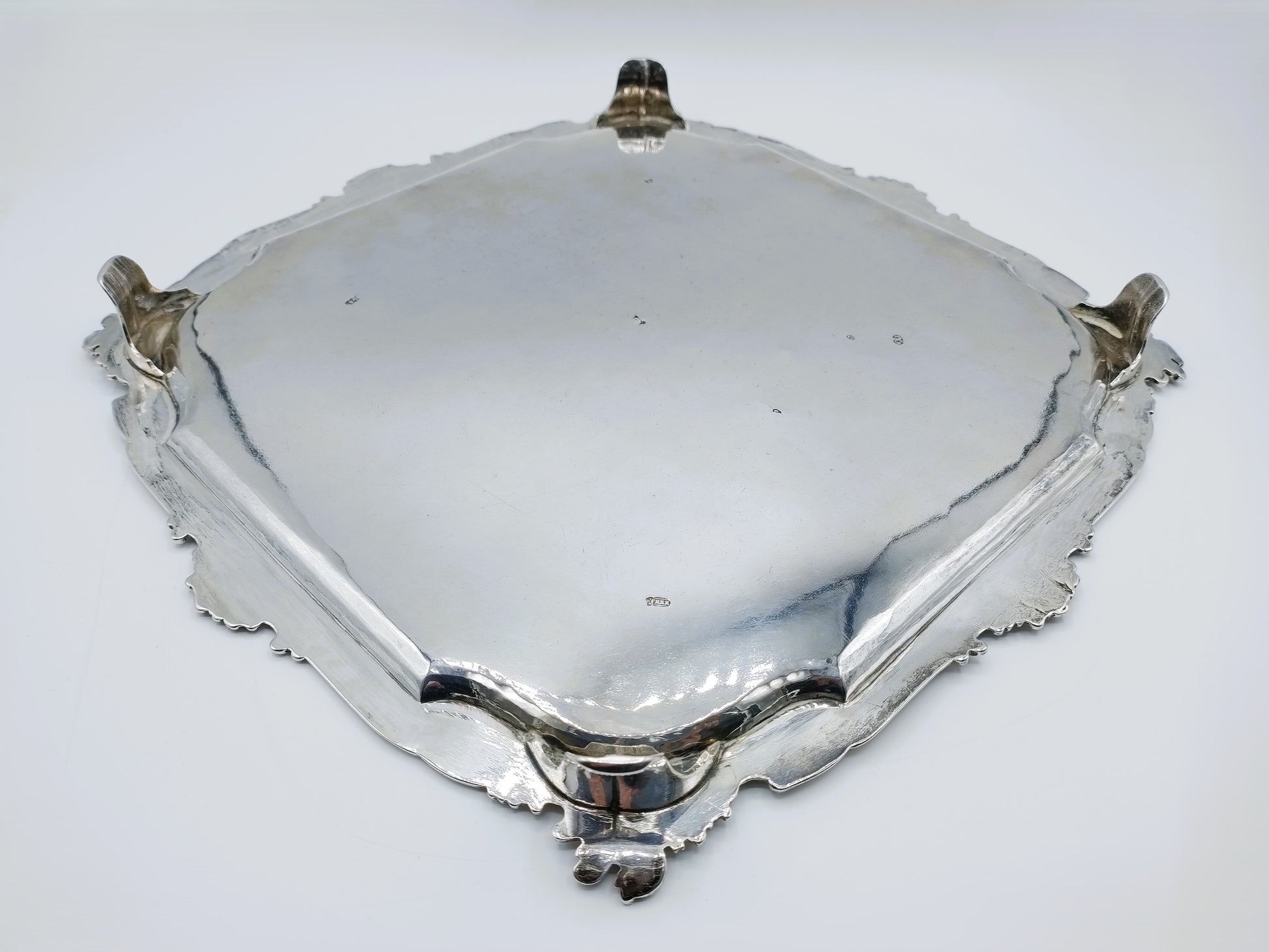 Zeer zeldzaam en museaal 18e-eeuws zilveren cabaret, vervaardigd in 1743 door de Amsterdamse zilversmid Hendrik Swierinck (1693–1771), een erkend specialist in groot zilverwerk. Dit indrukwekkende vierkante blad behoort tot de hoogwaardige Nederlandse rococo-zilversmeedkunst uit het midden van de 18e eeuw.