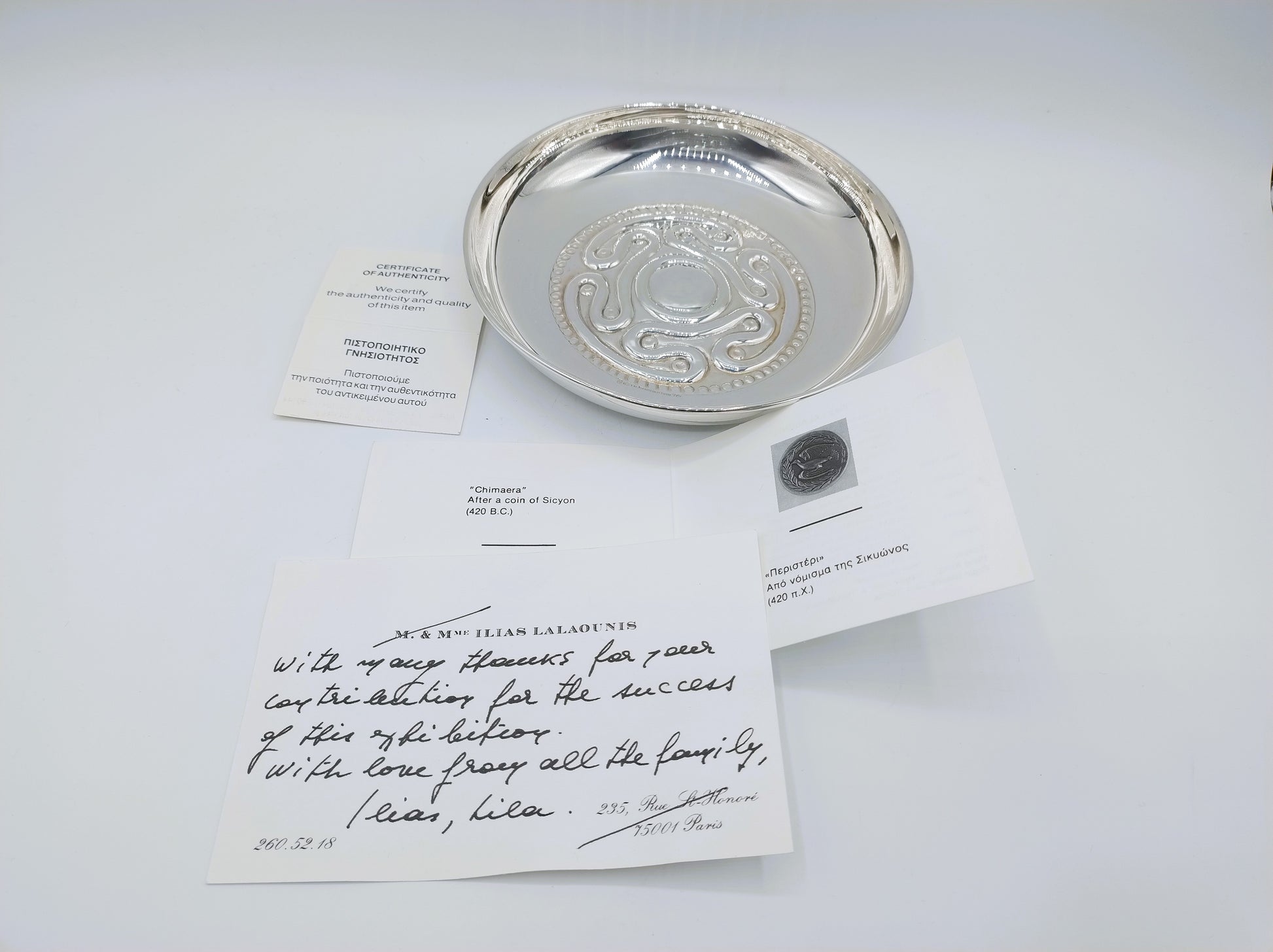 Een bijzonder verzamelobject van de gerenommeerde Griekse ontwerper Ilias Lalaounis. Dit verfijnde zilveren bord is geïnspireerd op de mythische figuur Chimera, een iconisch wezen uit de Griekse mythologie dat symbool staat voor kracht, fantasie en mysterie.