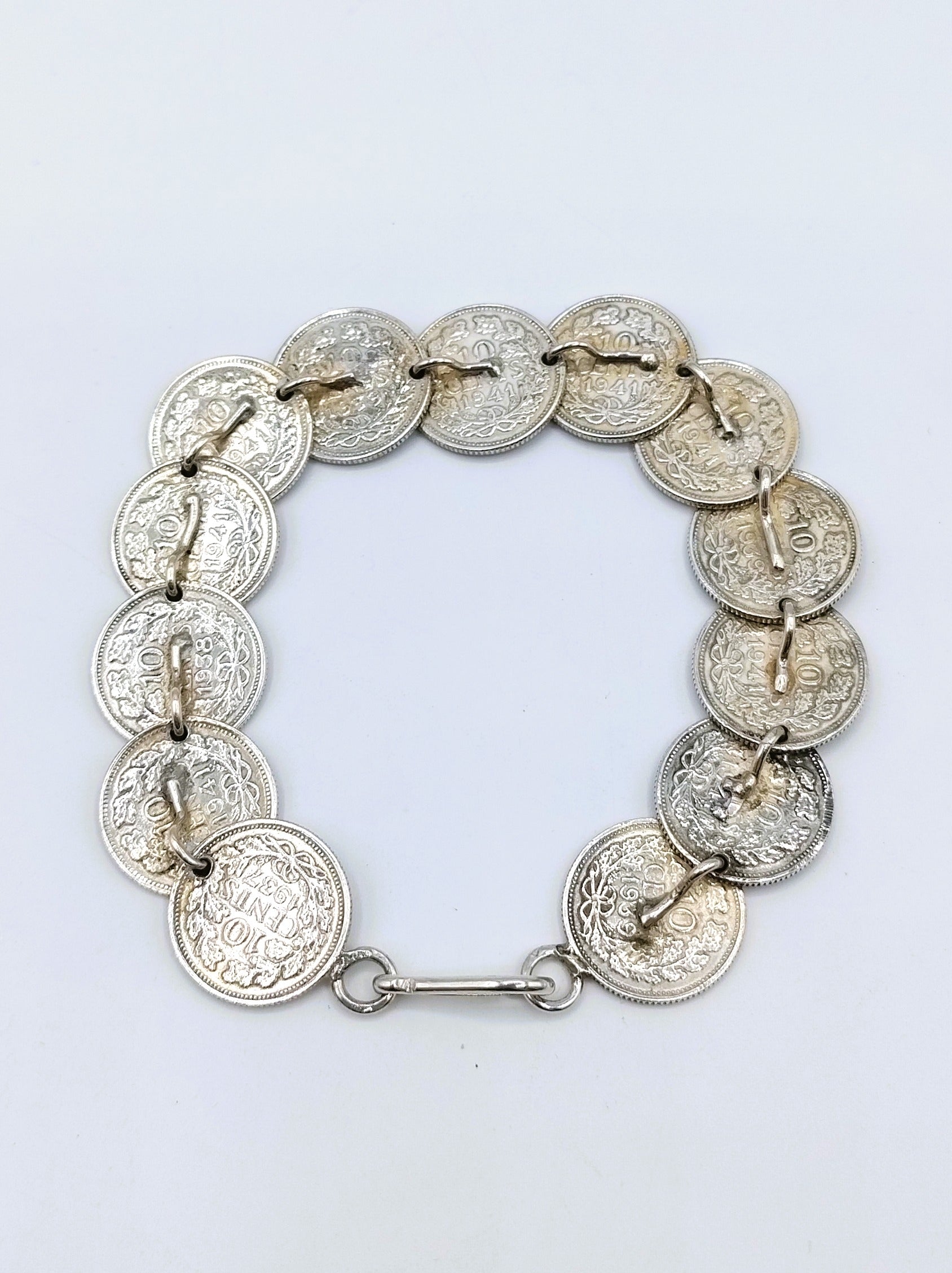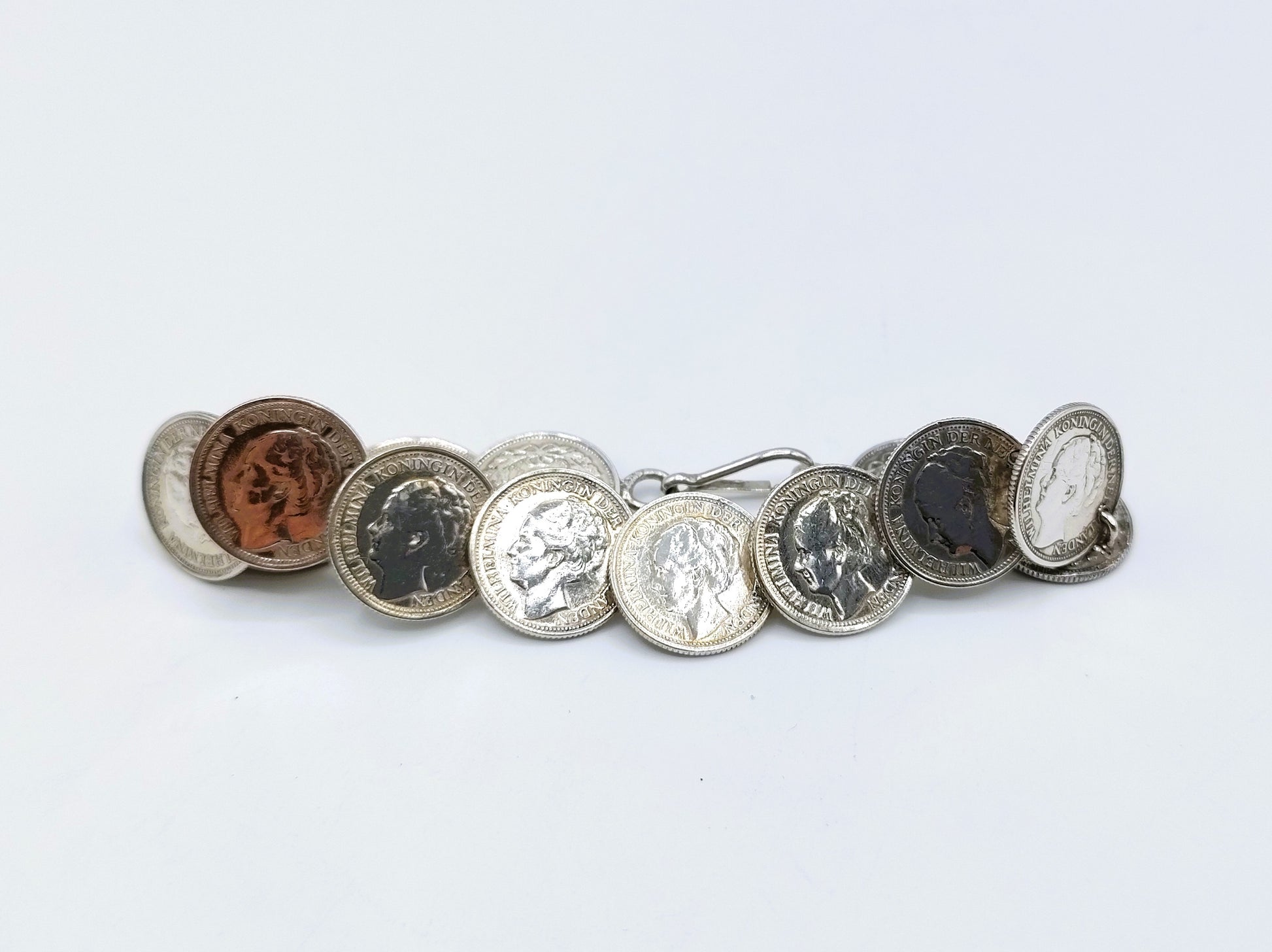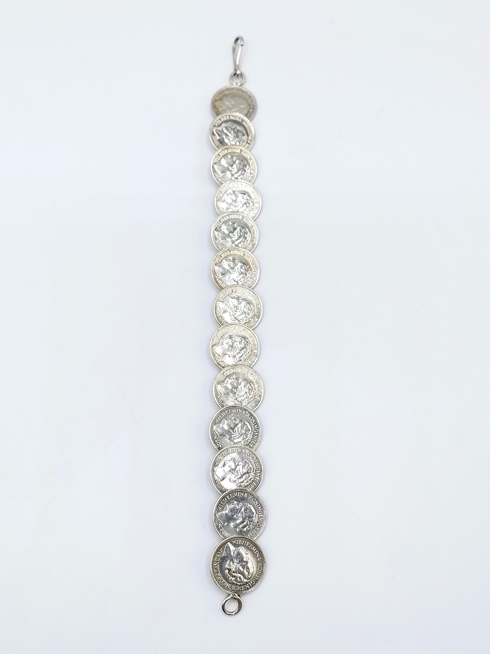 Zilveren dubbeltjes armband met munten van Wilhelmina. De munten dateren tussen 1937 en 1941. In totaal zijn er 13 dubbeltjes verwerkt in de armband.