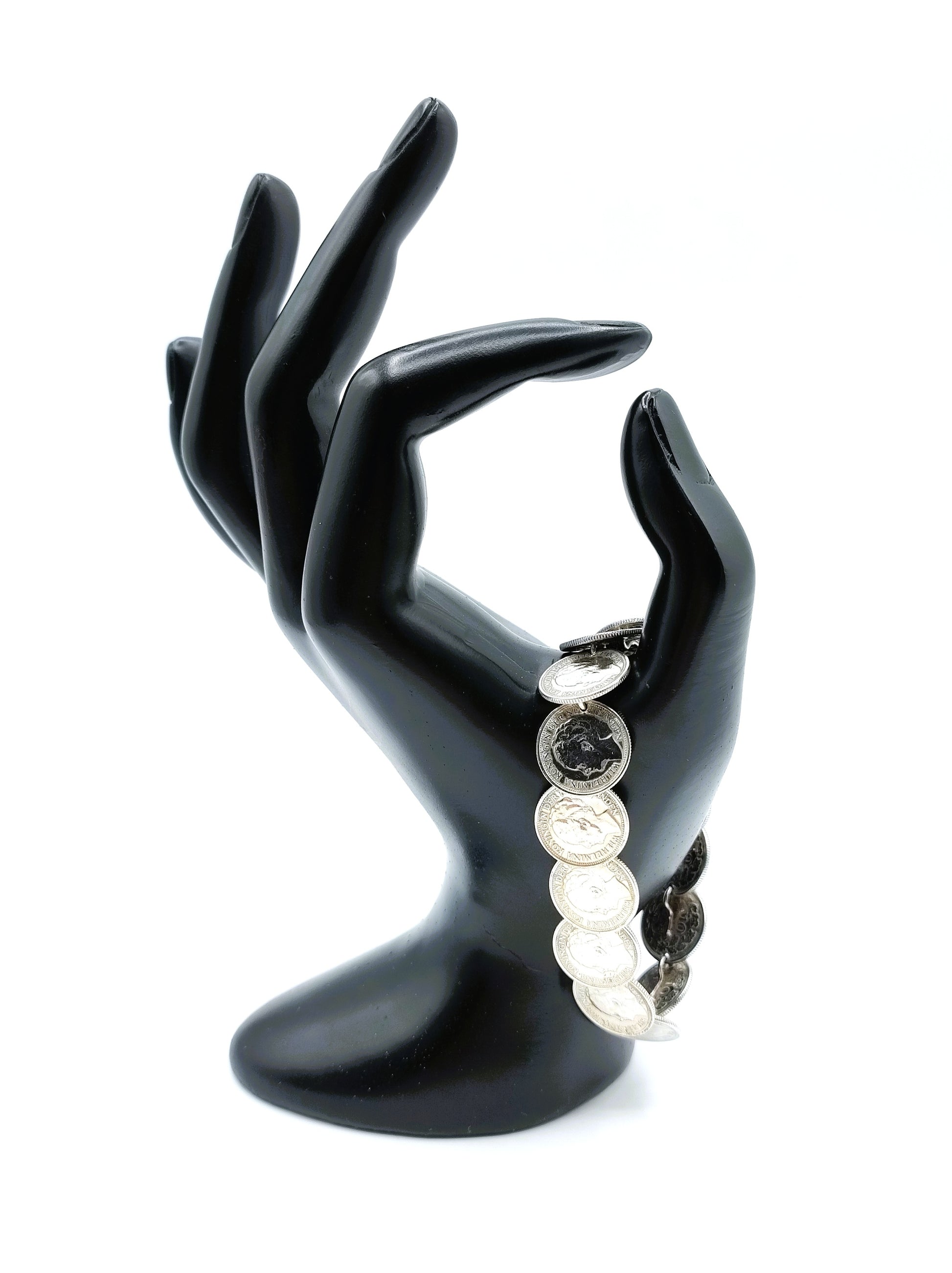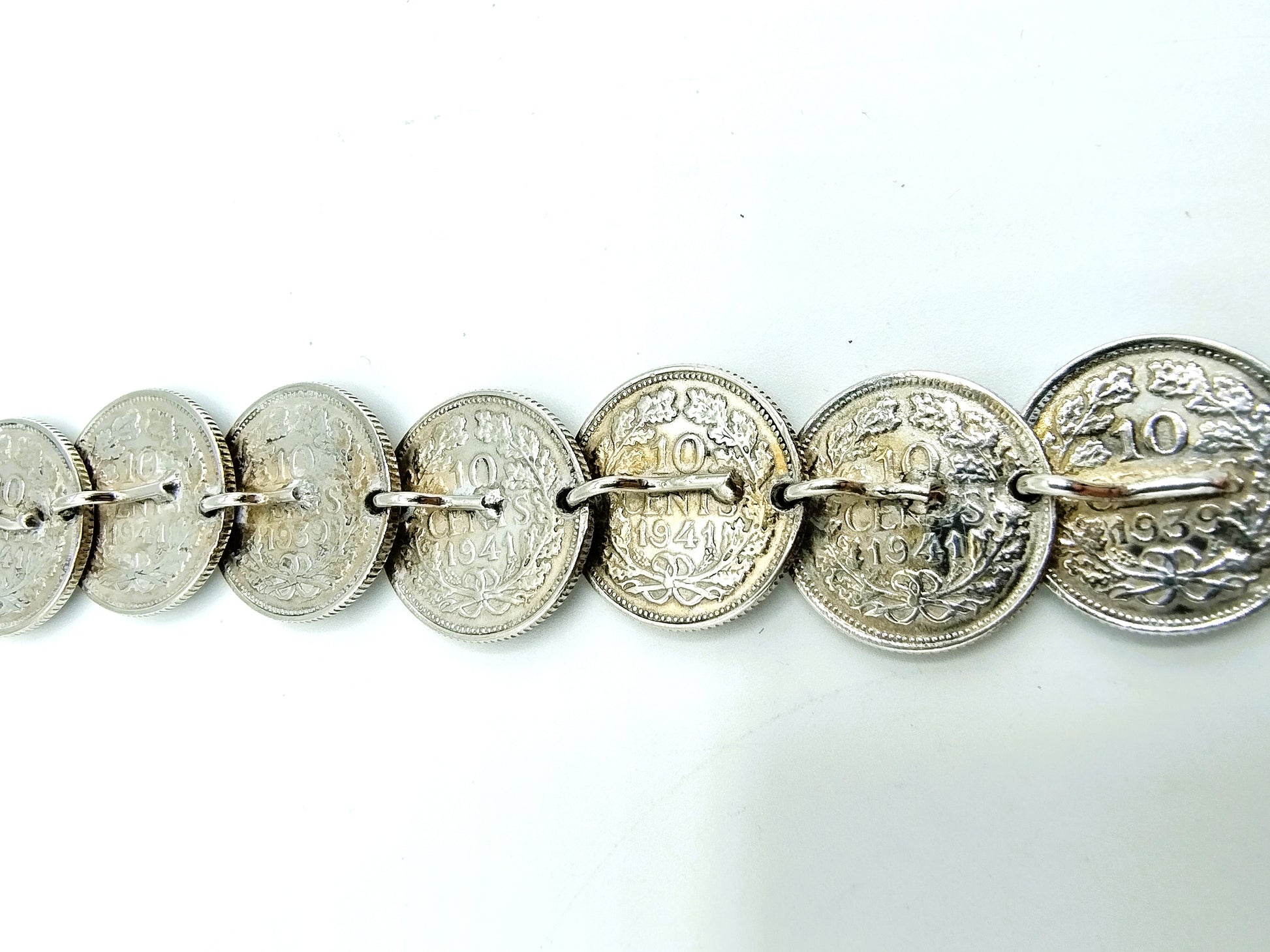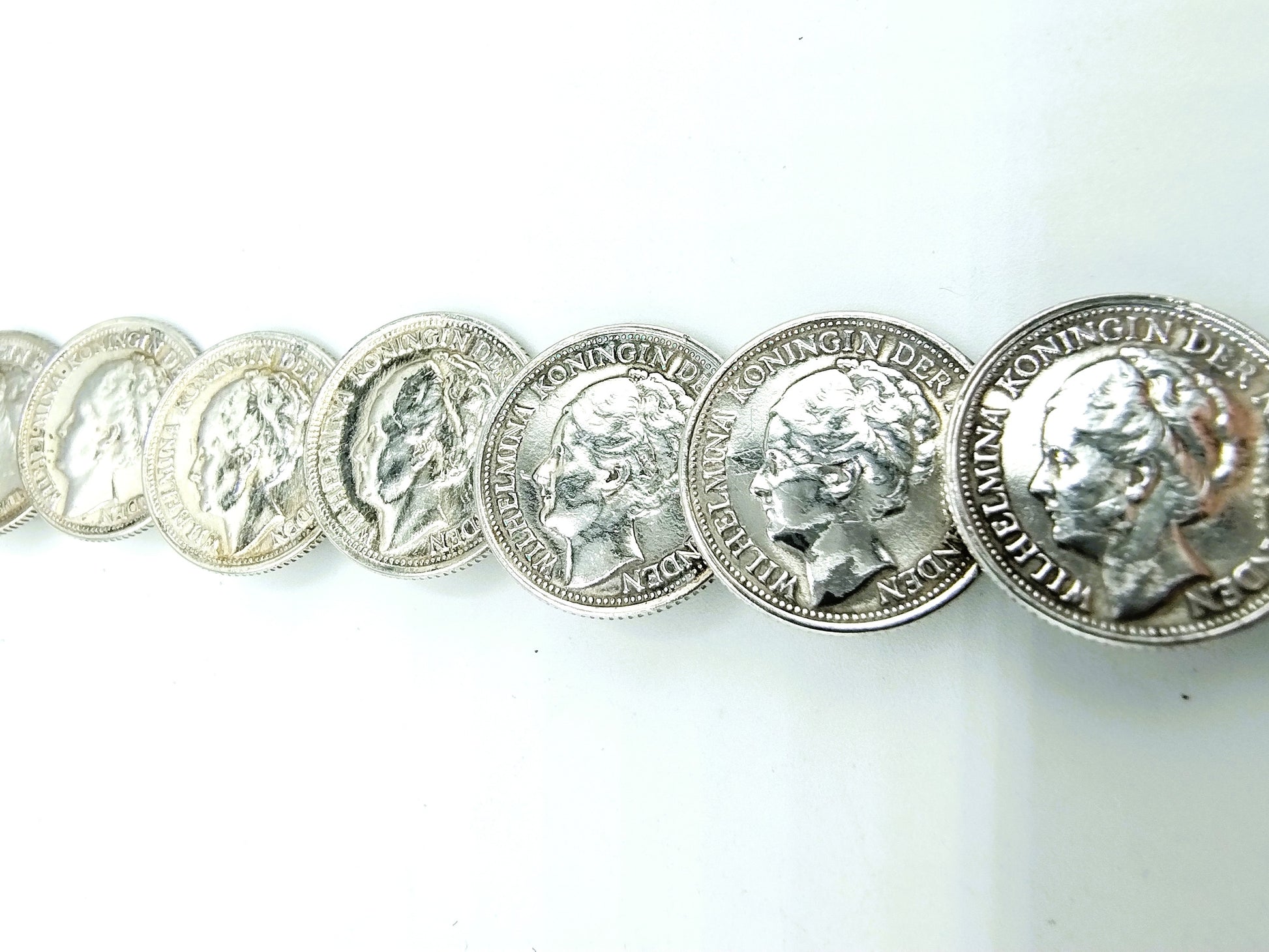 Zilveren dubbeltjes armband met munten van Wilhelmina. De munten dateren tussen 1937 en 1941. In totaal zijn er 13 dubbeltjes verwerkt in de armband.