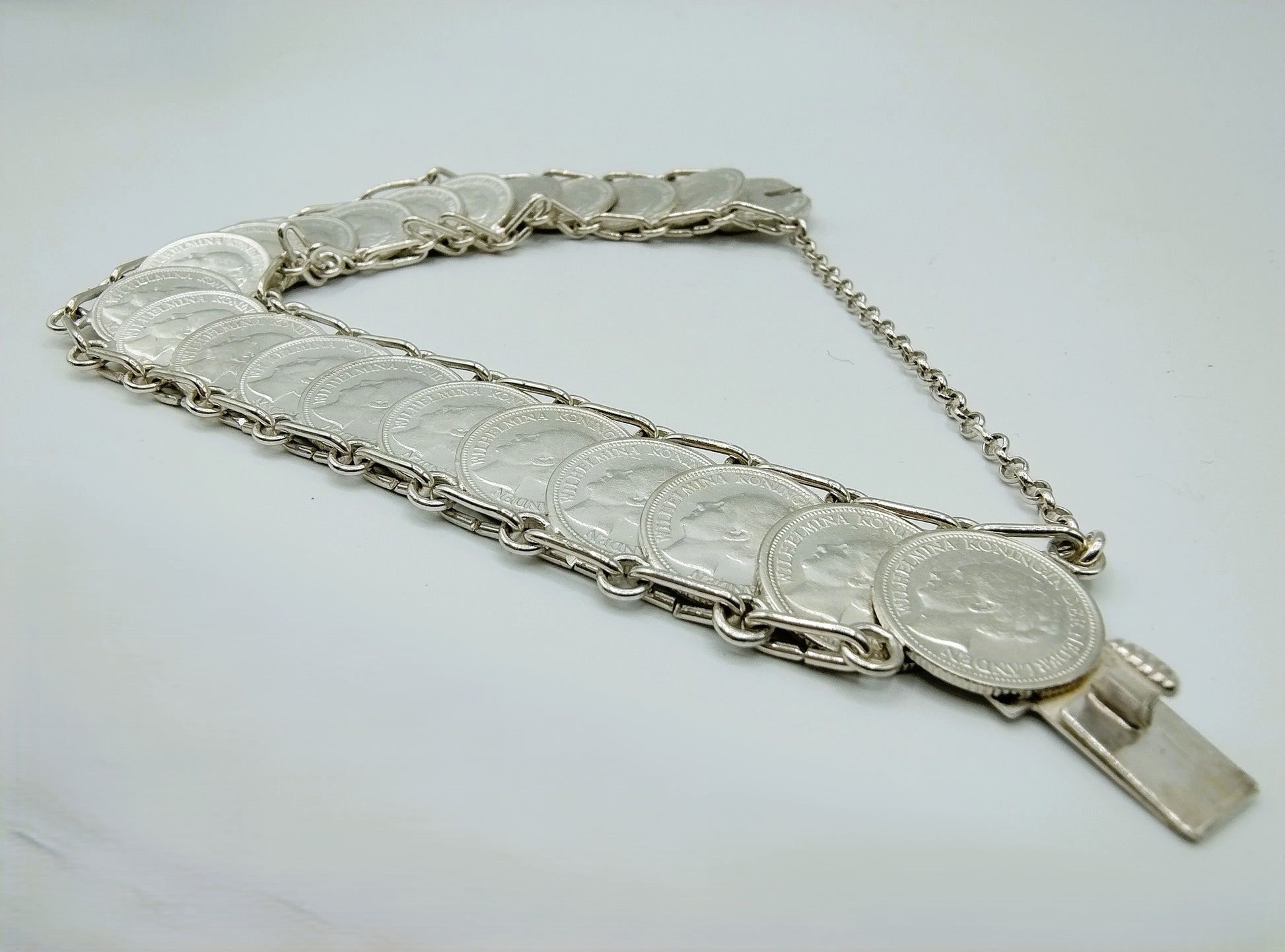 Zilveren dubbeltjes armband met munten van Wilhelmina.