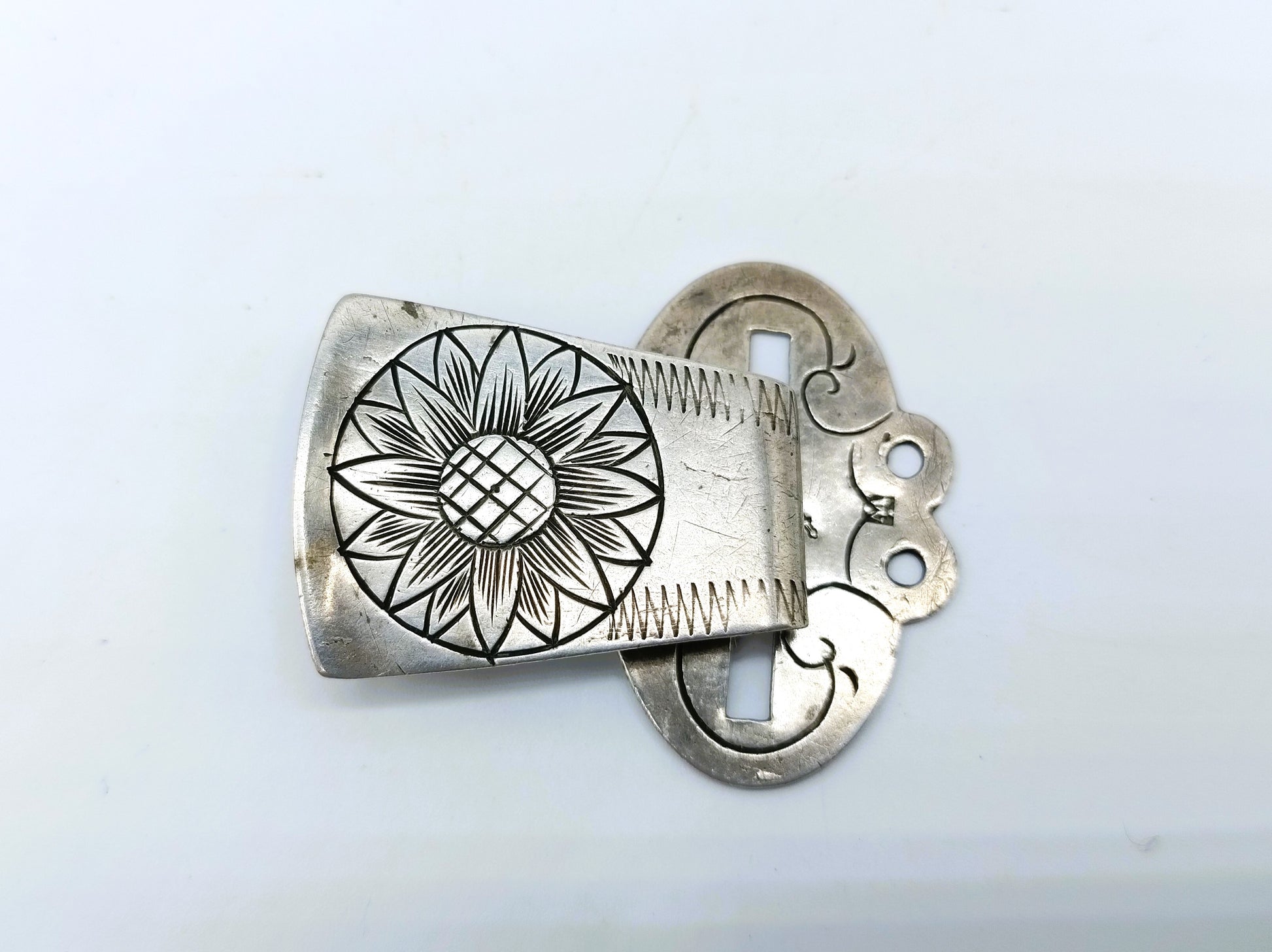 Een met bloem gegraveerde zilveren schorthaak of omslagdoeksluiting ook wel faaljehaak genoemd. Gemaakt door de zilversmid Cornelis Wendels uit Middelburg. Deze zilversmid was werkzaam tussen 1828 en 1849.