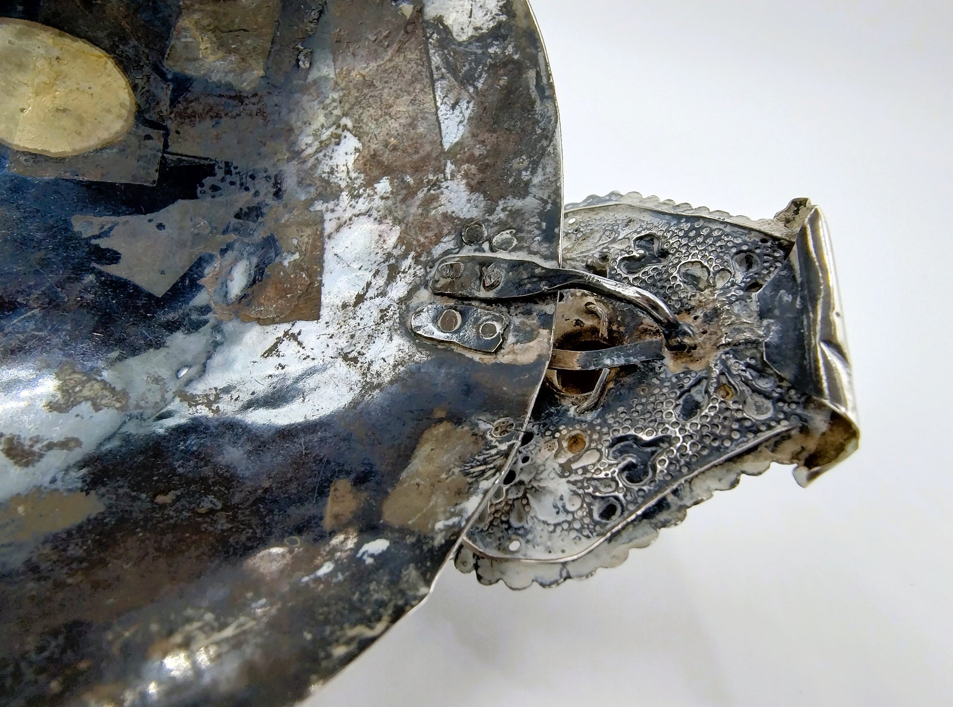 Het oorijzer is in gebruikte conditie. Het oorijzer werd dagelijks gedragen en dit is terug te zien in het stuk. Verschillende reparaties en restauraties zijn er geweest.