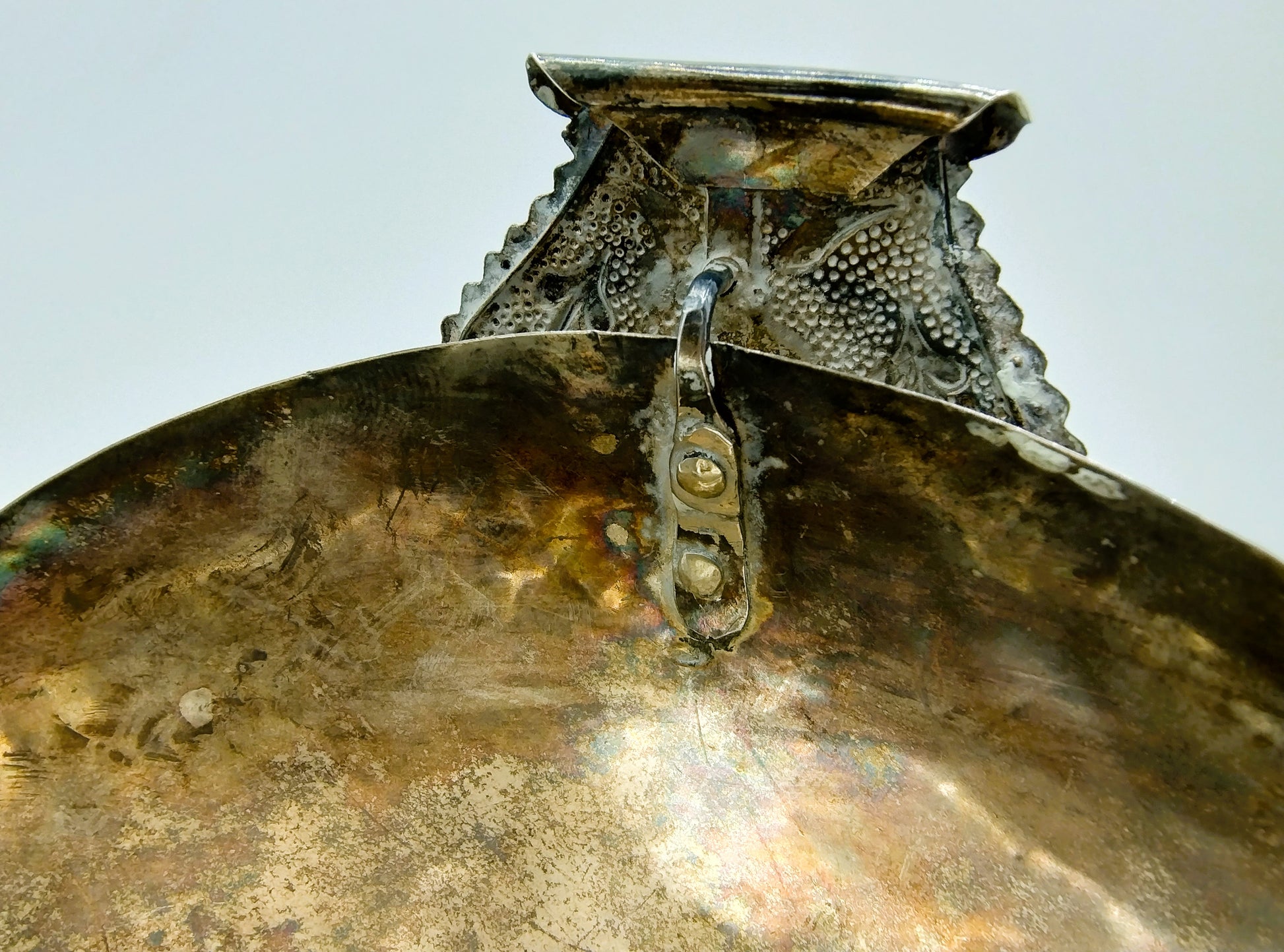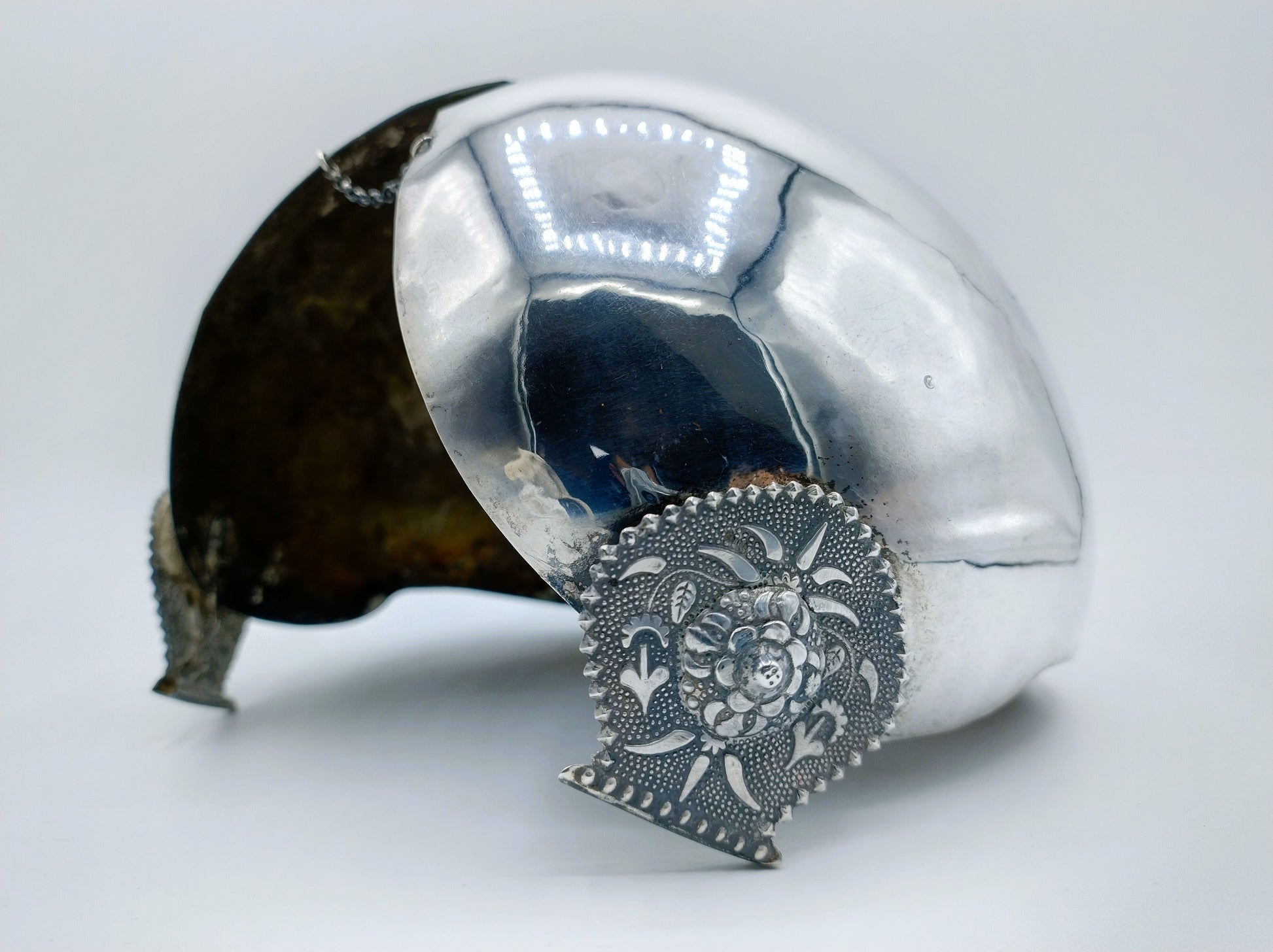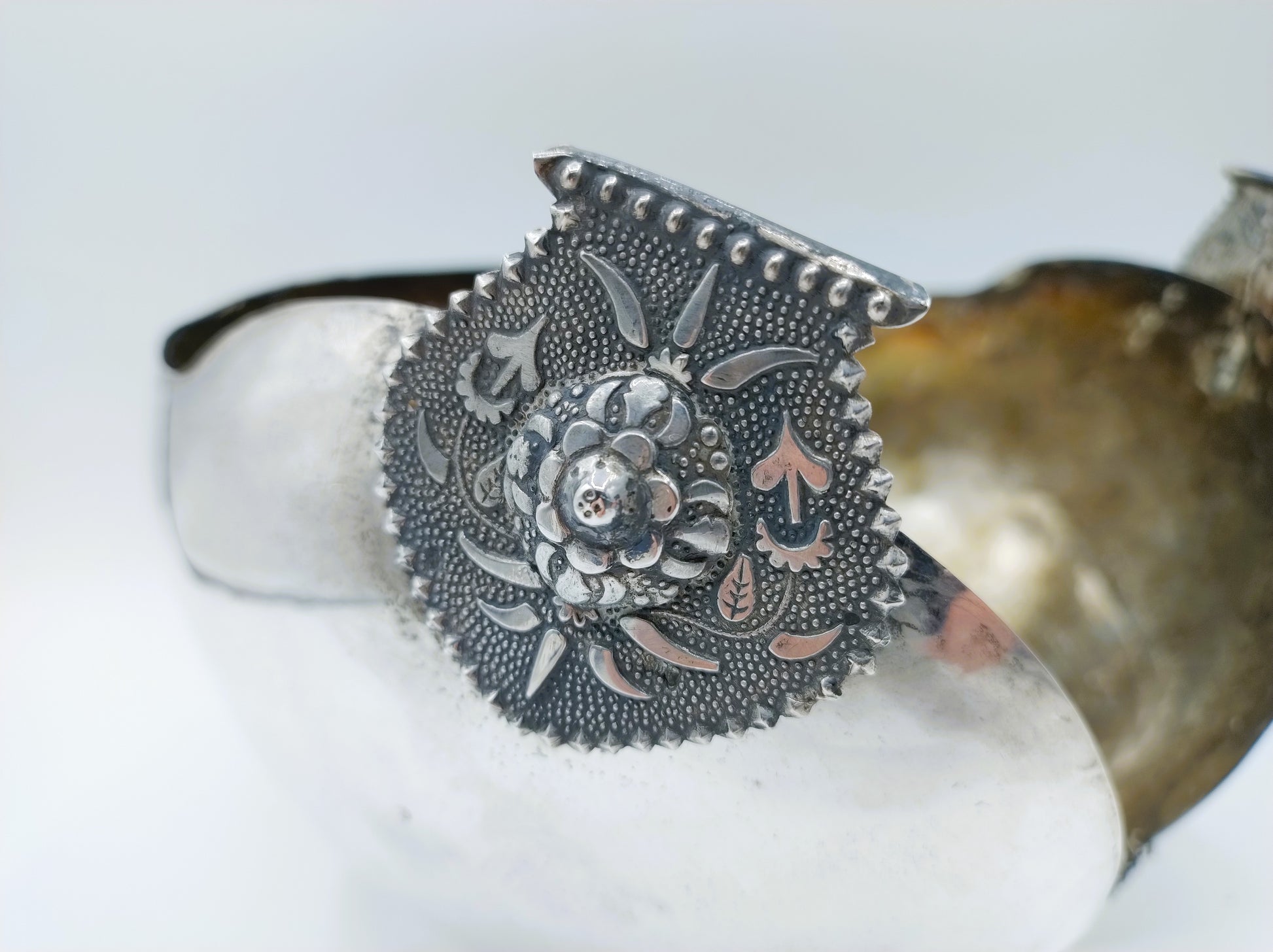 Fries zilveren oorijzer voorzien van twee zilveren boekstukken. Het oorijzer is gemaakt door de zilversmid F. Hofman uit Kollum. Hij was werkzaam van 1853 tot 1890.
