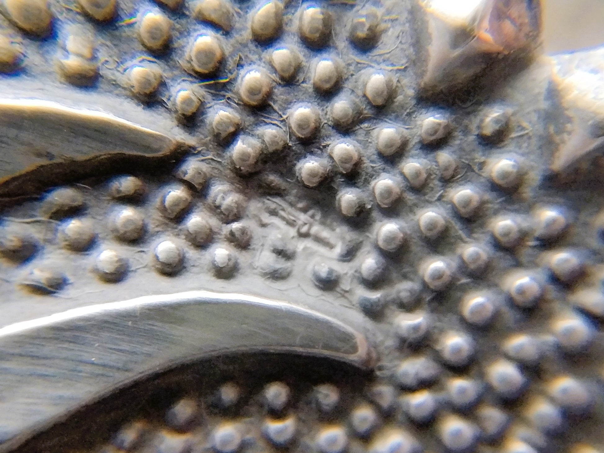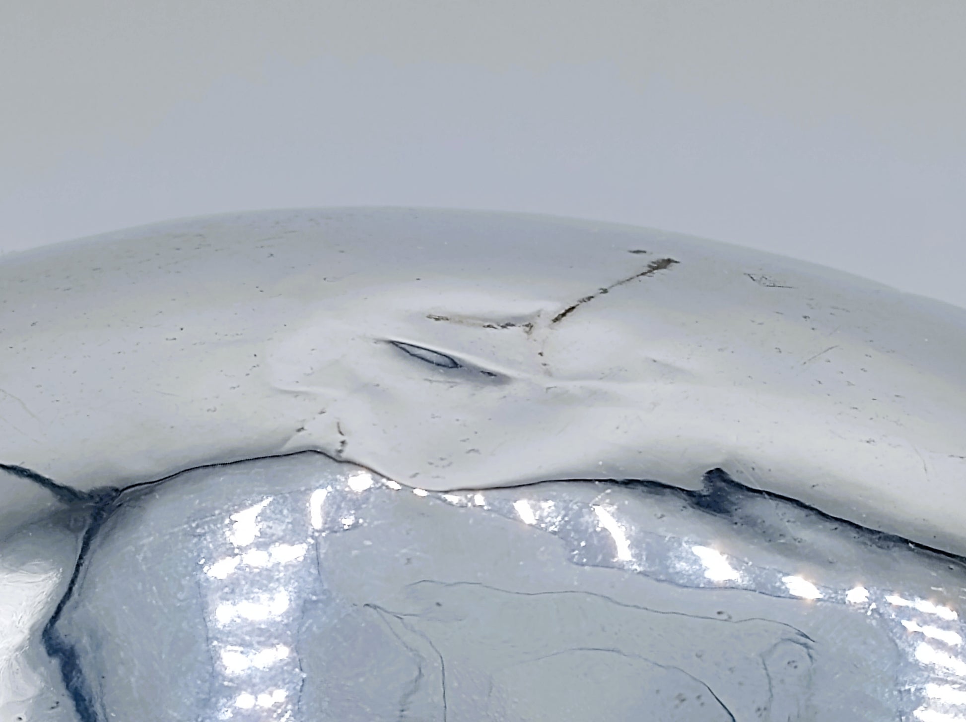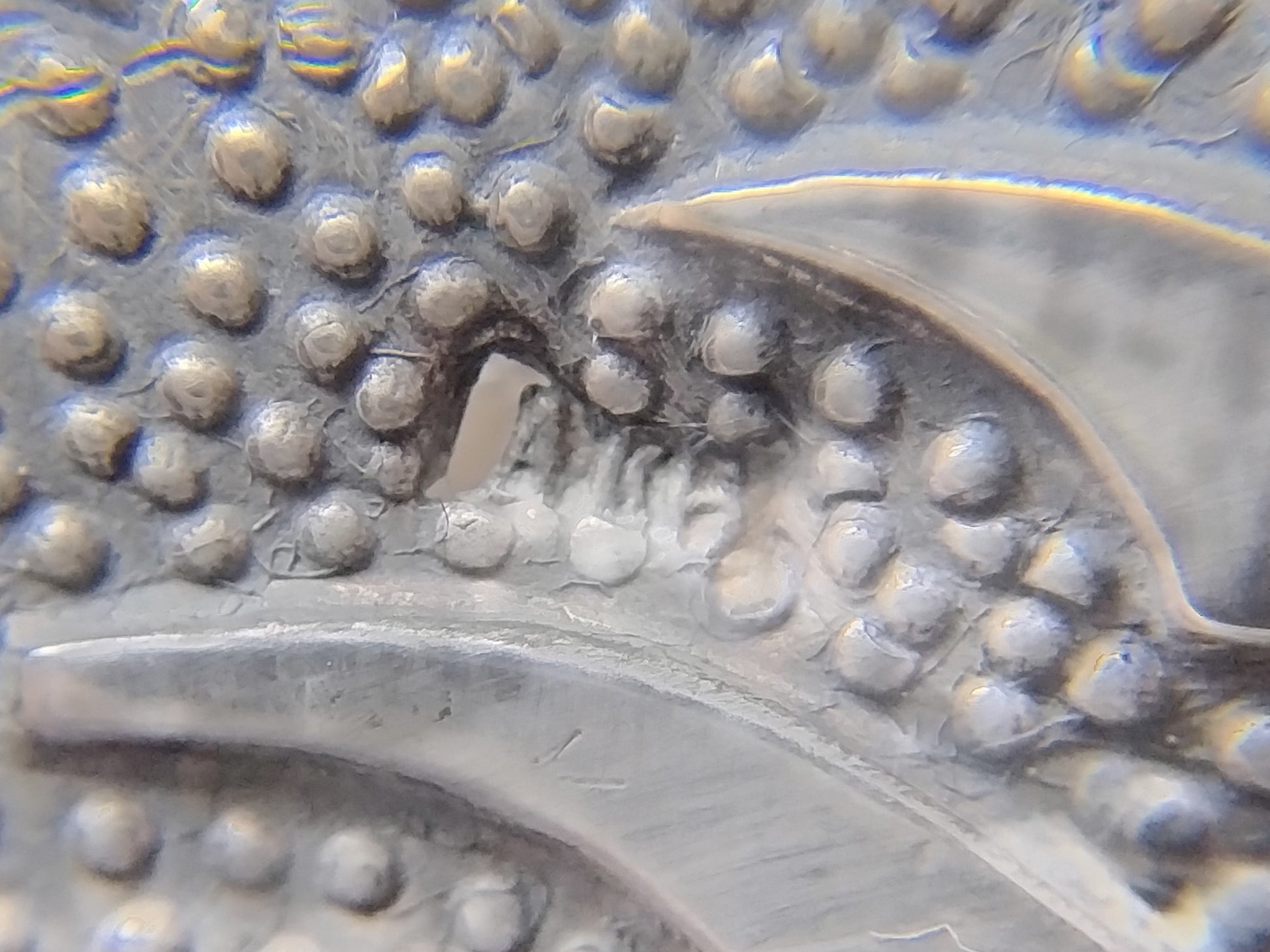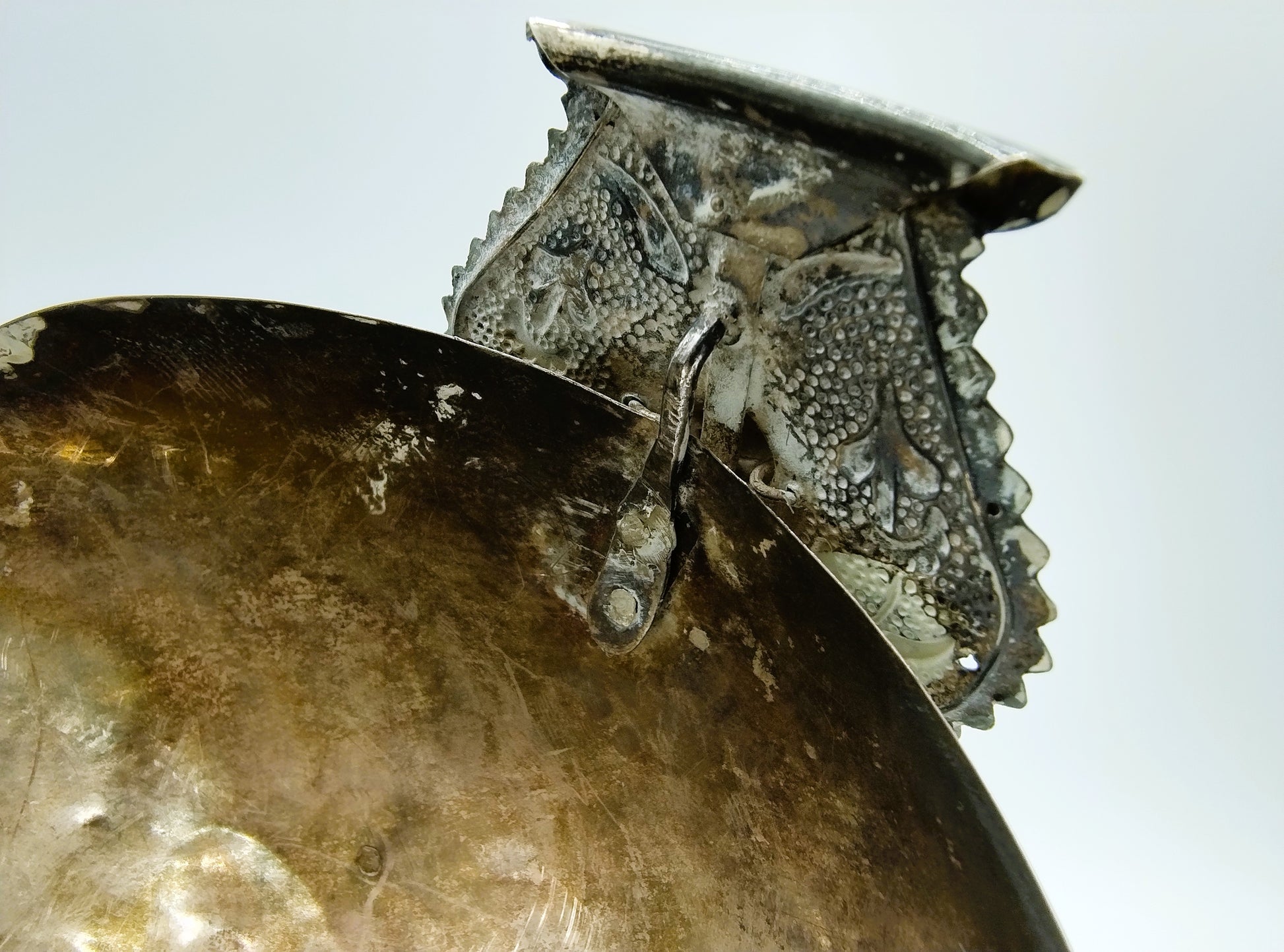 Het oorijzer heeft leeftijdsgebonden gebruikssporen, waaronder een deukje, zie de foto.