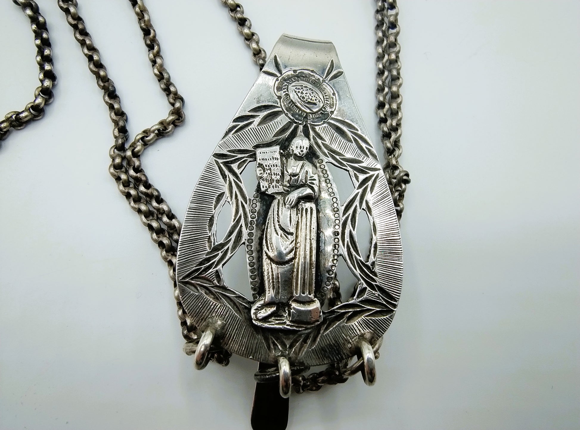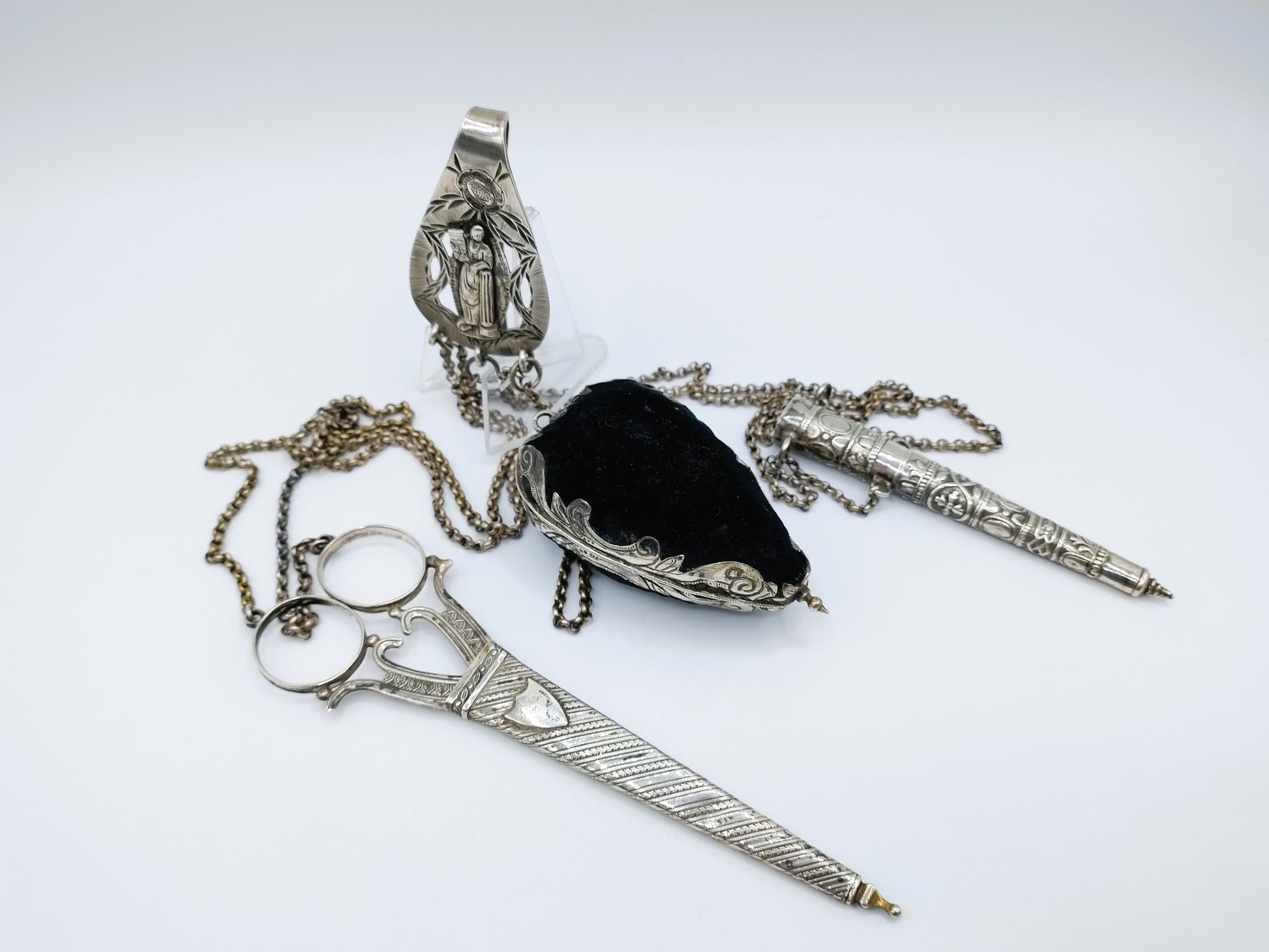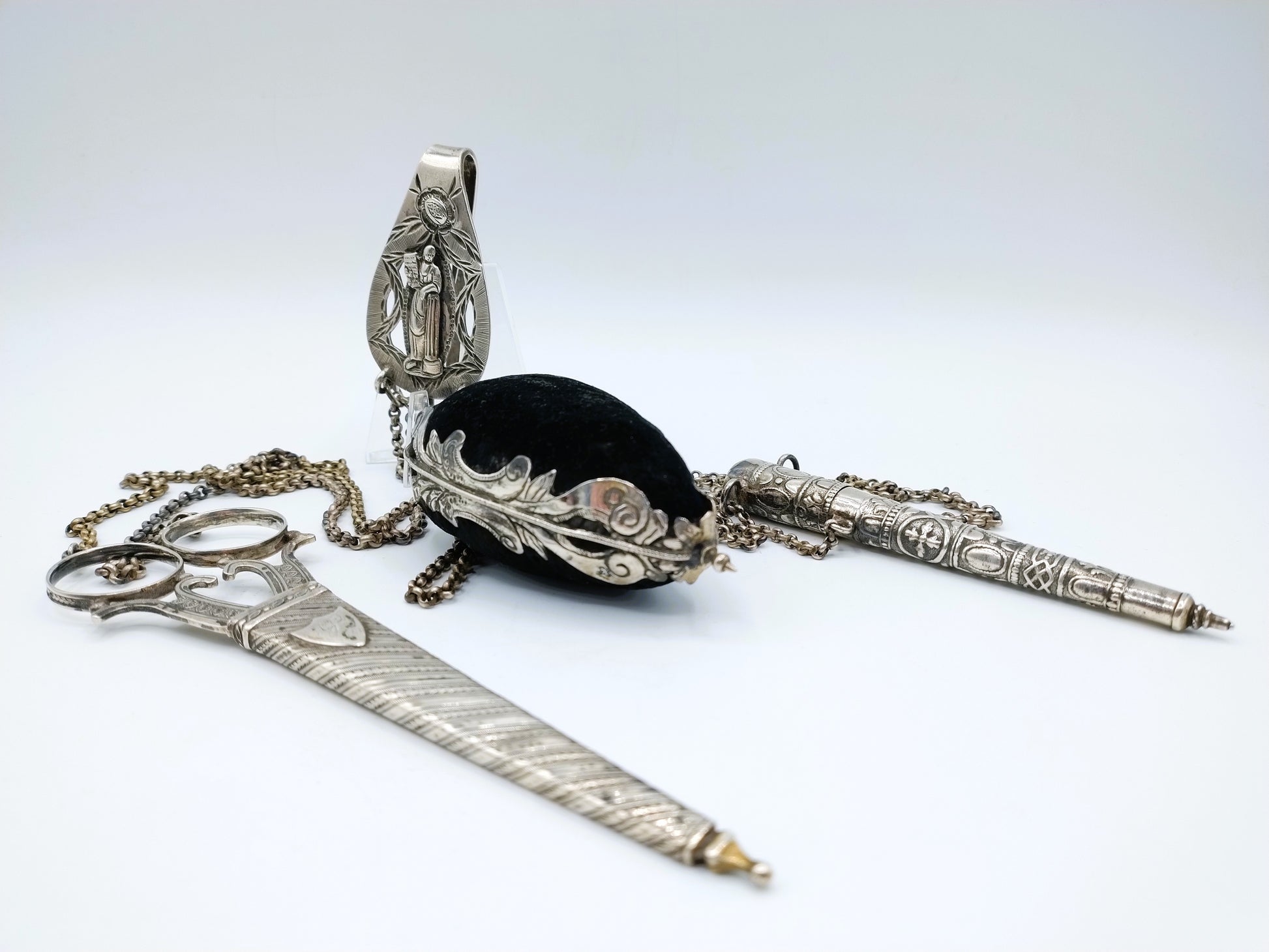 Friese chatelaine bestaande uit een schaar, speldenkussen en naaldenkoker gemaakt door onder andere: