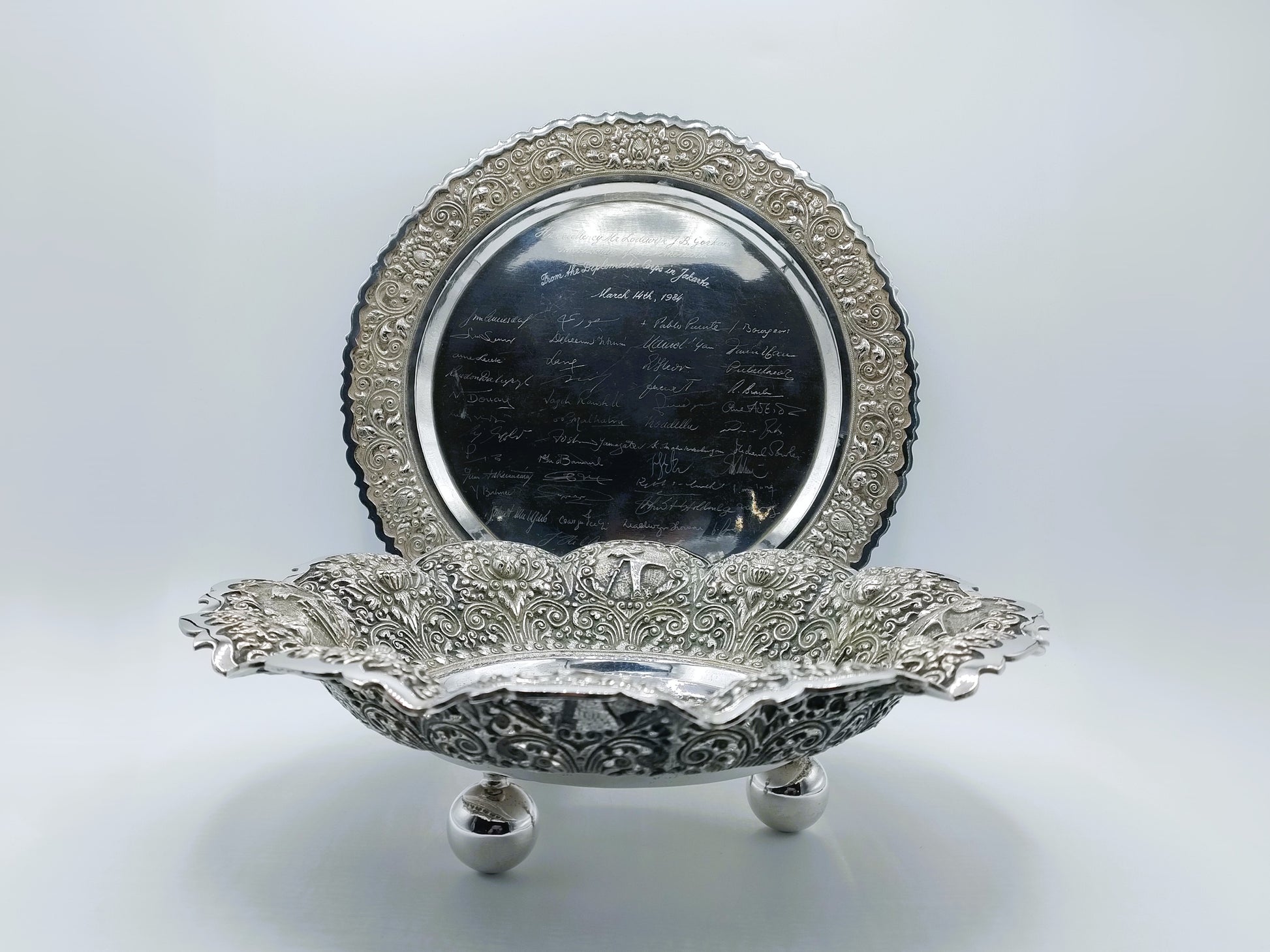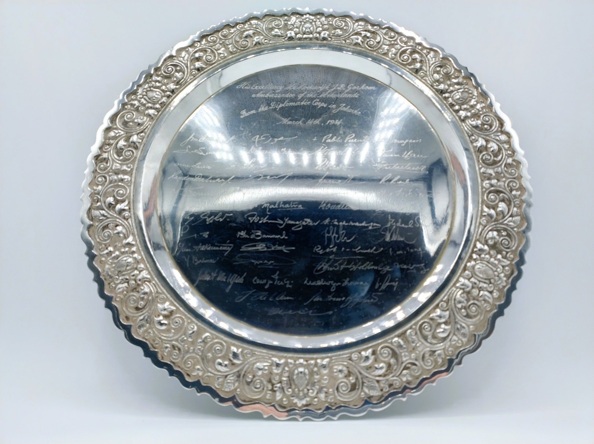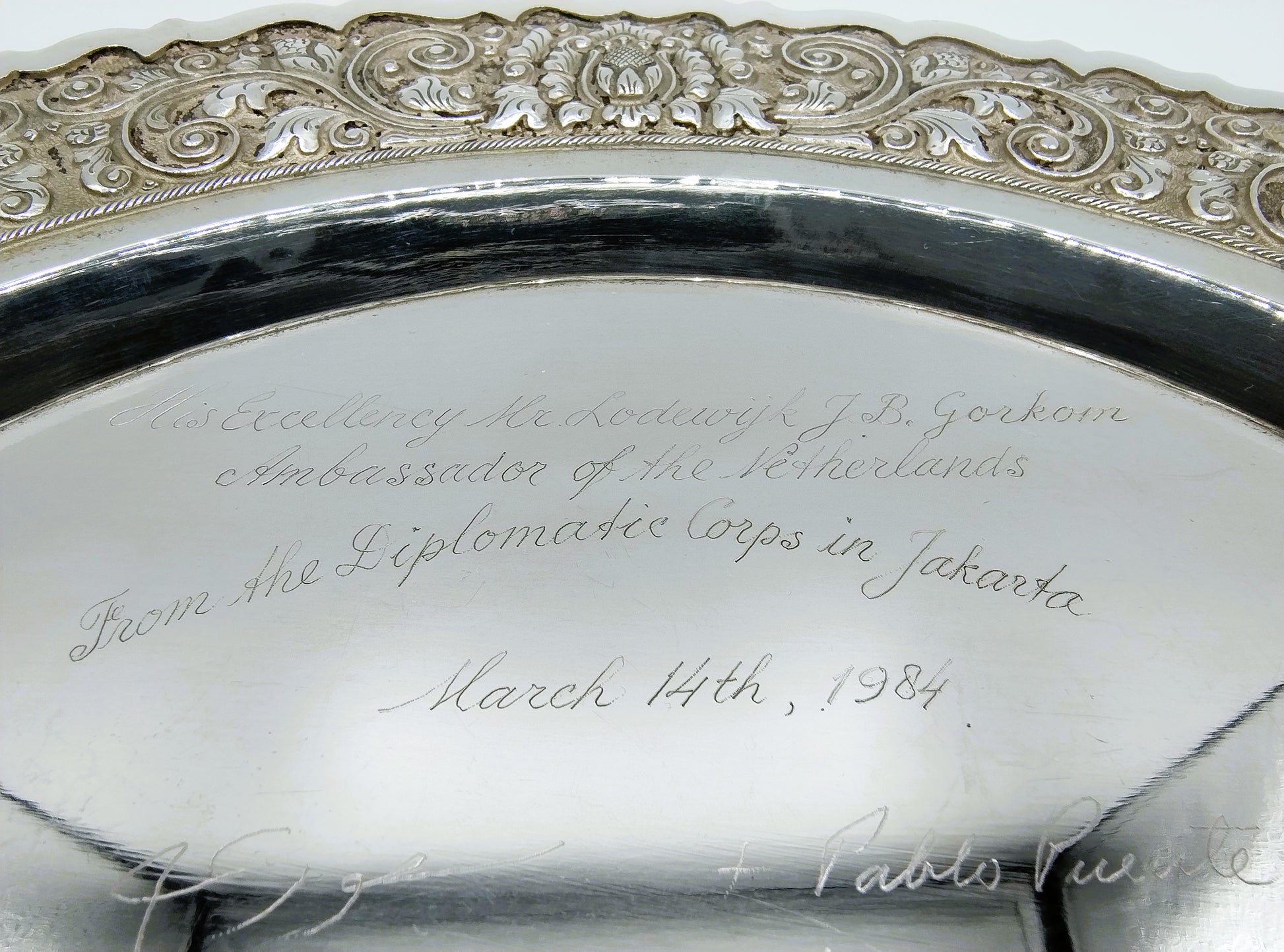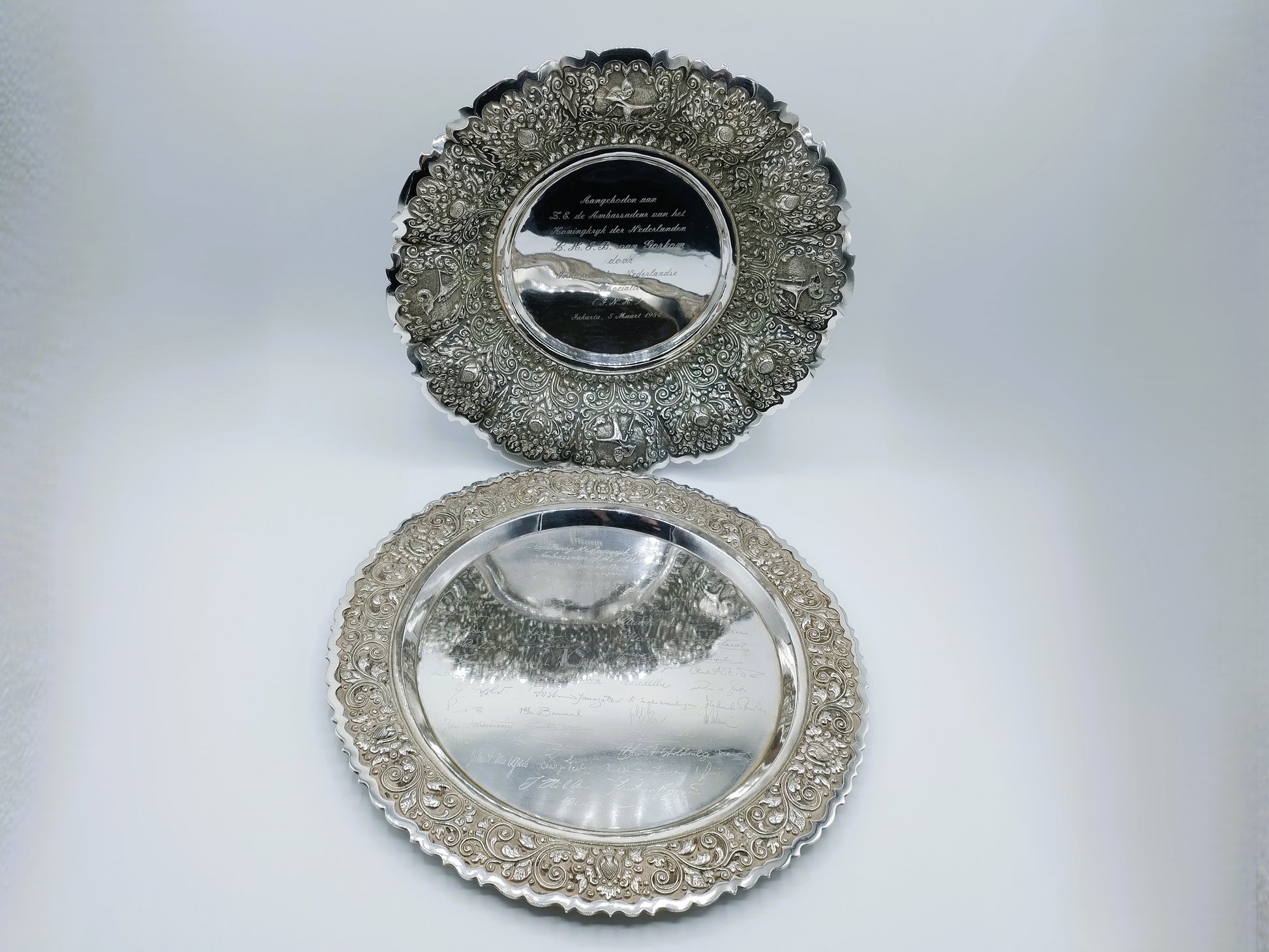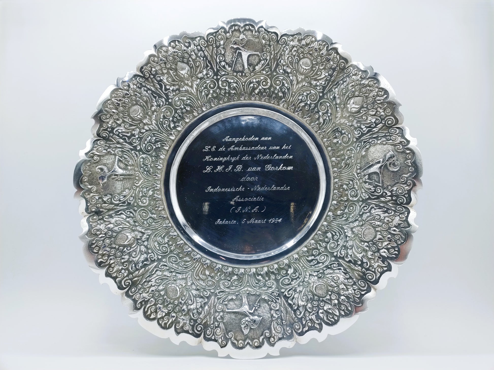 Grote djokja zilveren fruitschaal en groot djokja zilveren bord, beide zijn in het verleden als geschenk gegeven aan de Nederlandse Ambassadeur J.B. Gorkom in Indonesië in 1984.