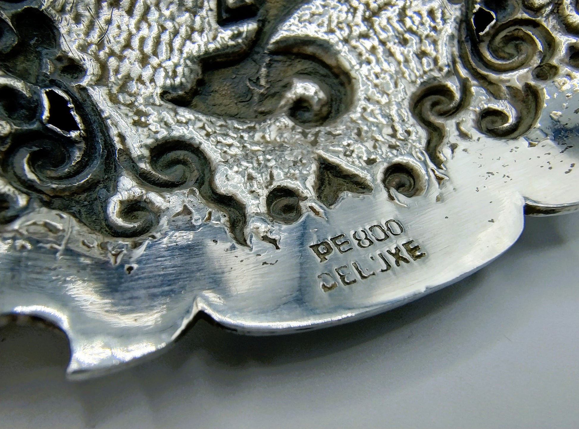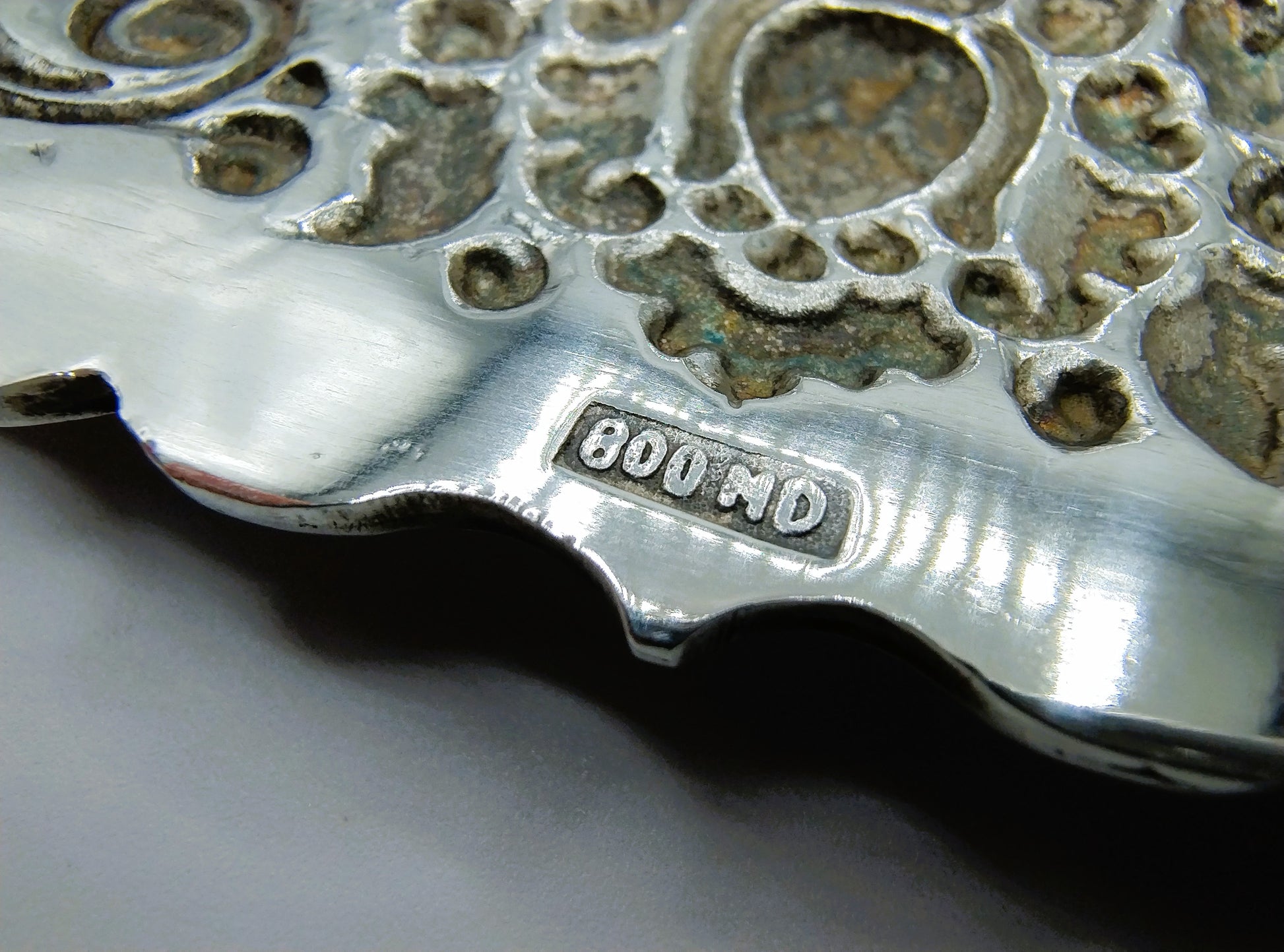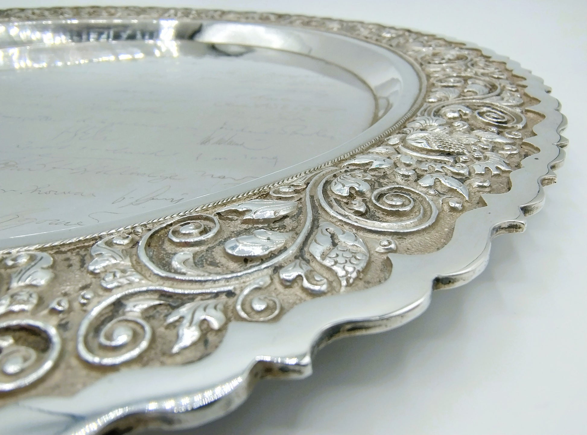 Bord: Gewicht: 558 gram. Diameter: 30 cm. Hoogte: 2 cm. Gekeurd met 800 MD voor 3e gehalte zilver.