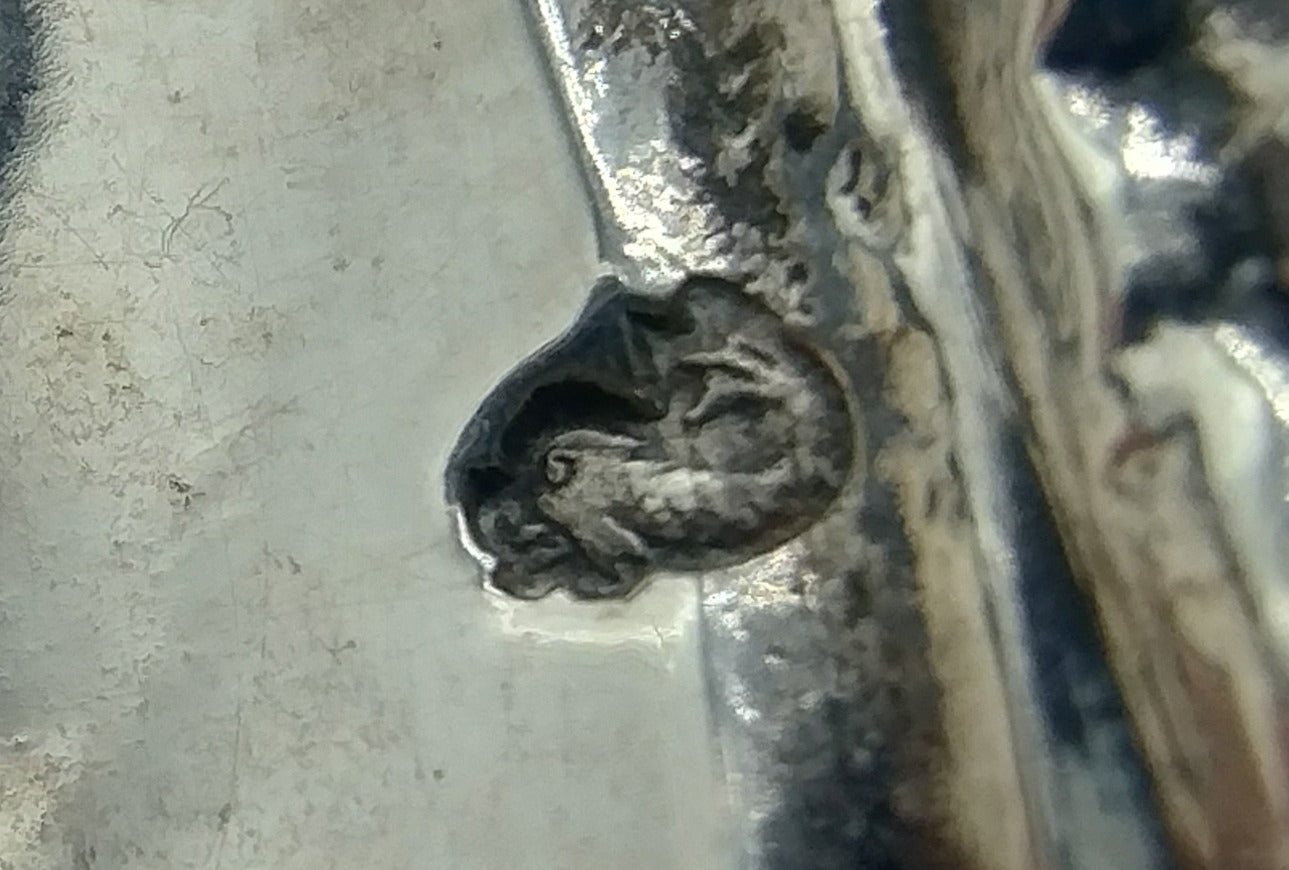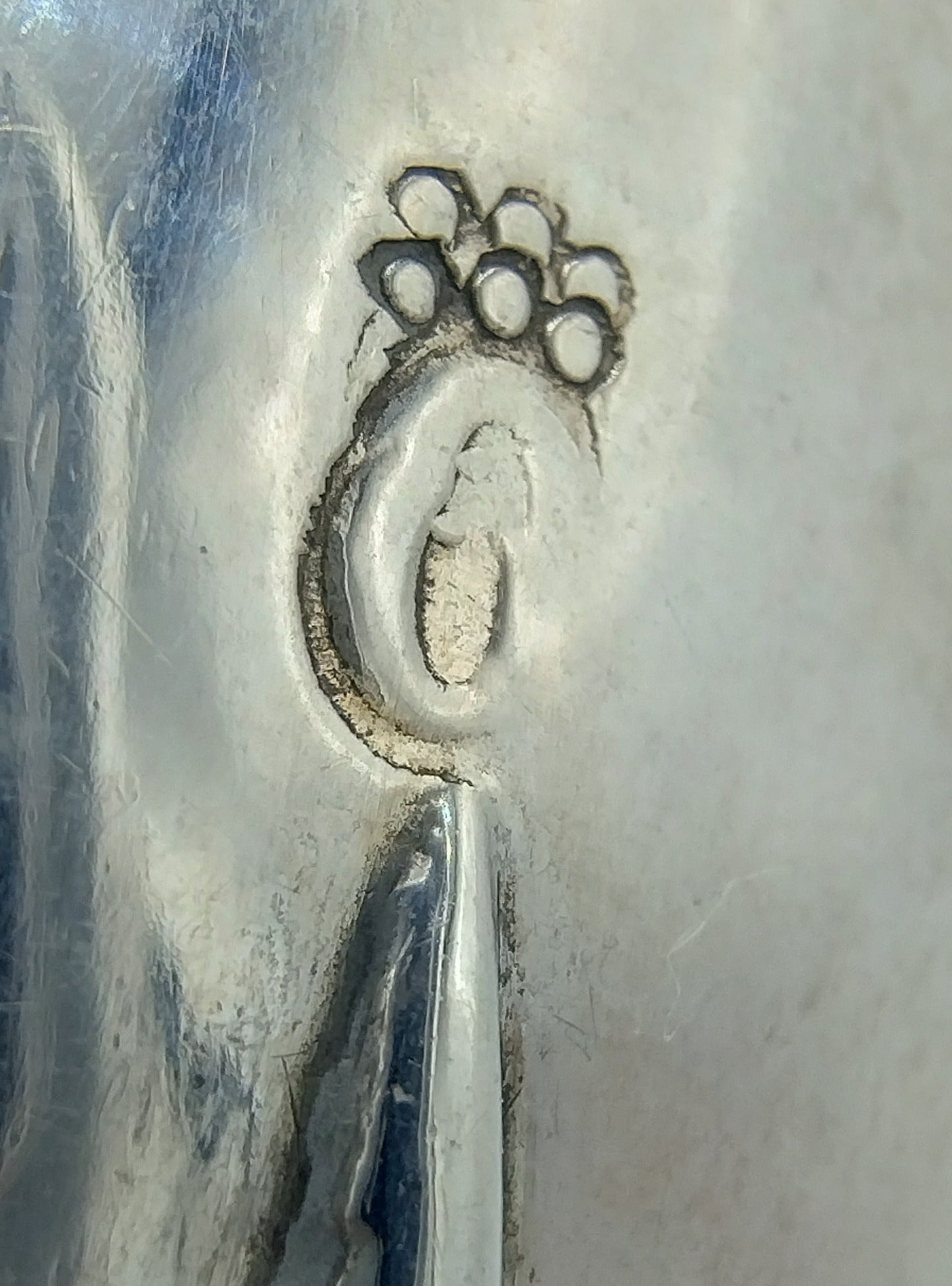 De lepel is bekroond met een echtpaar en gekeurd met een pseudokeur O en het dolfijn belastingkeur gebruikt van 1859-1893.