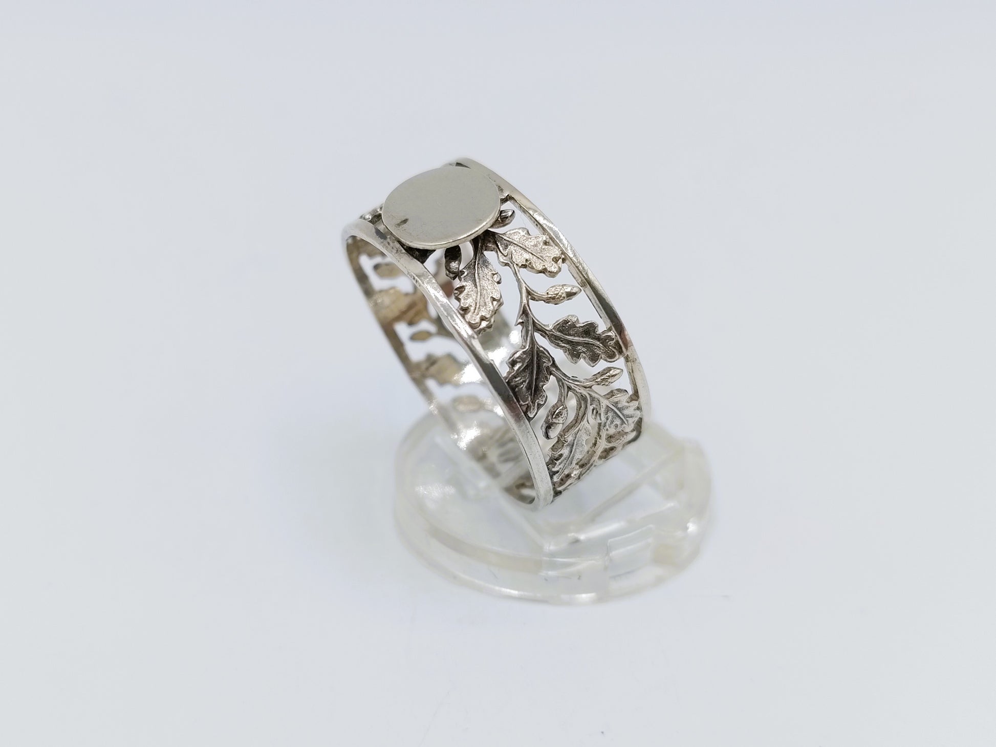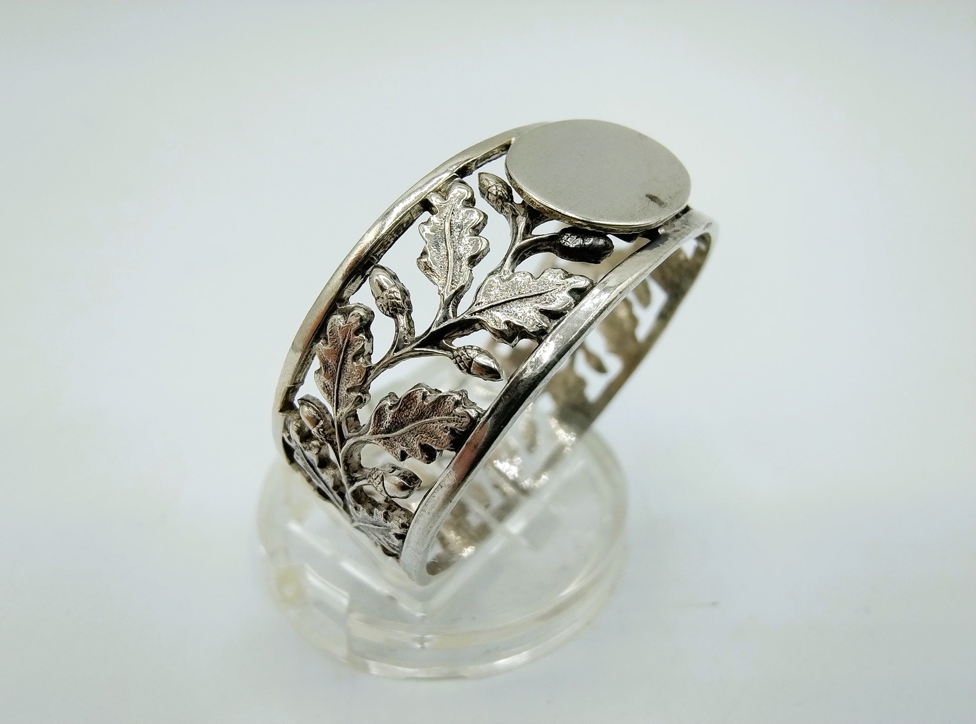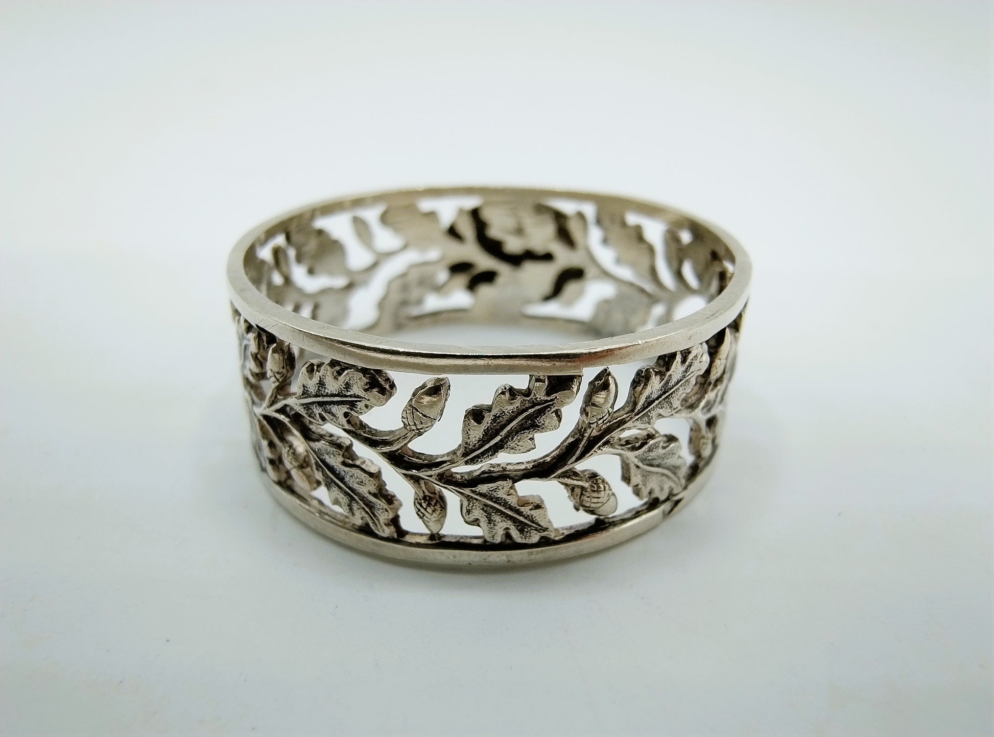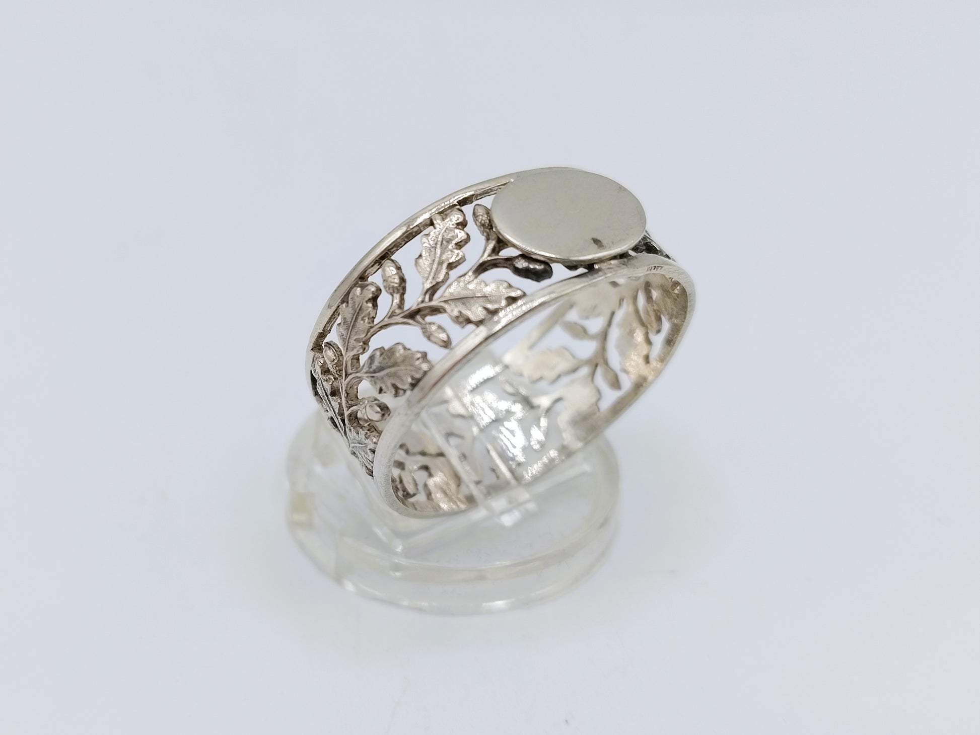 Zilveren herenring met opengewerkt decor van eikenbladeren en eikels.