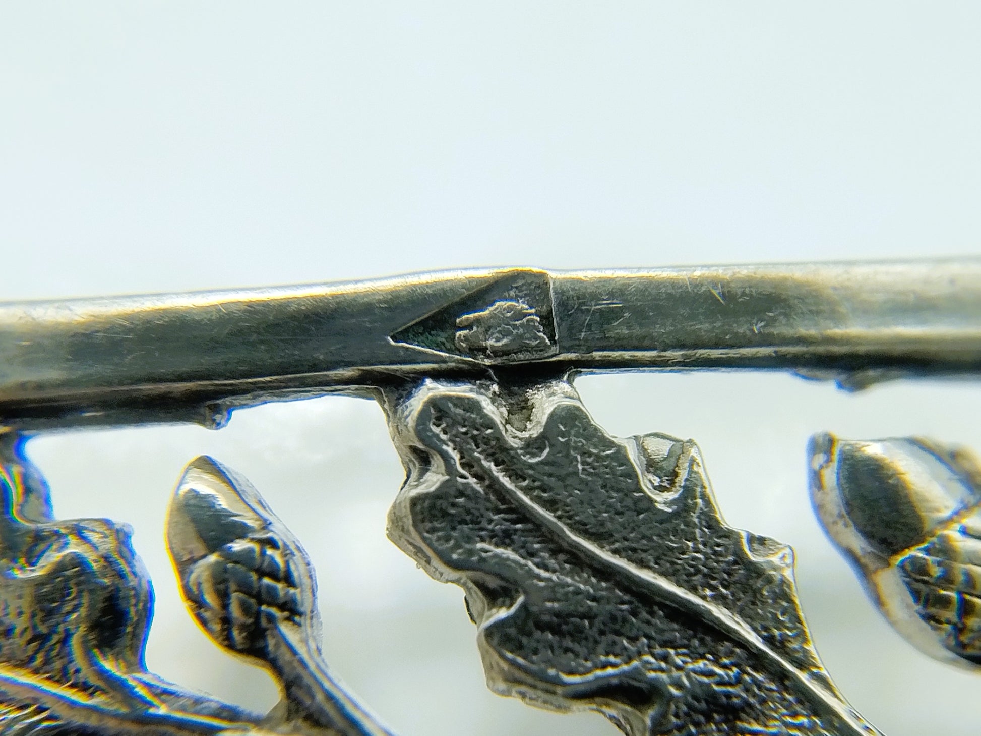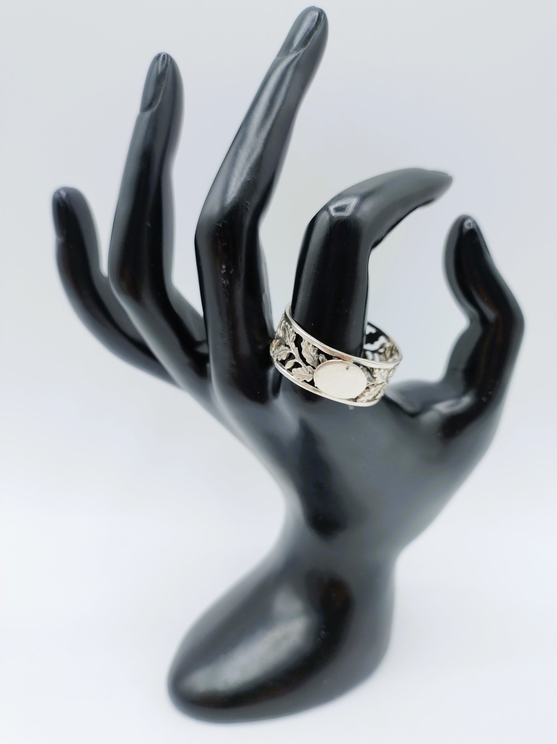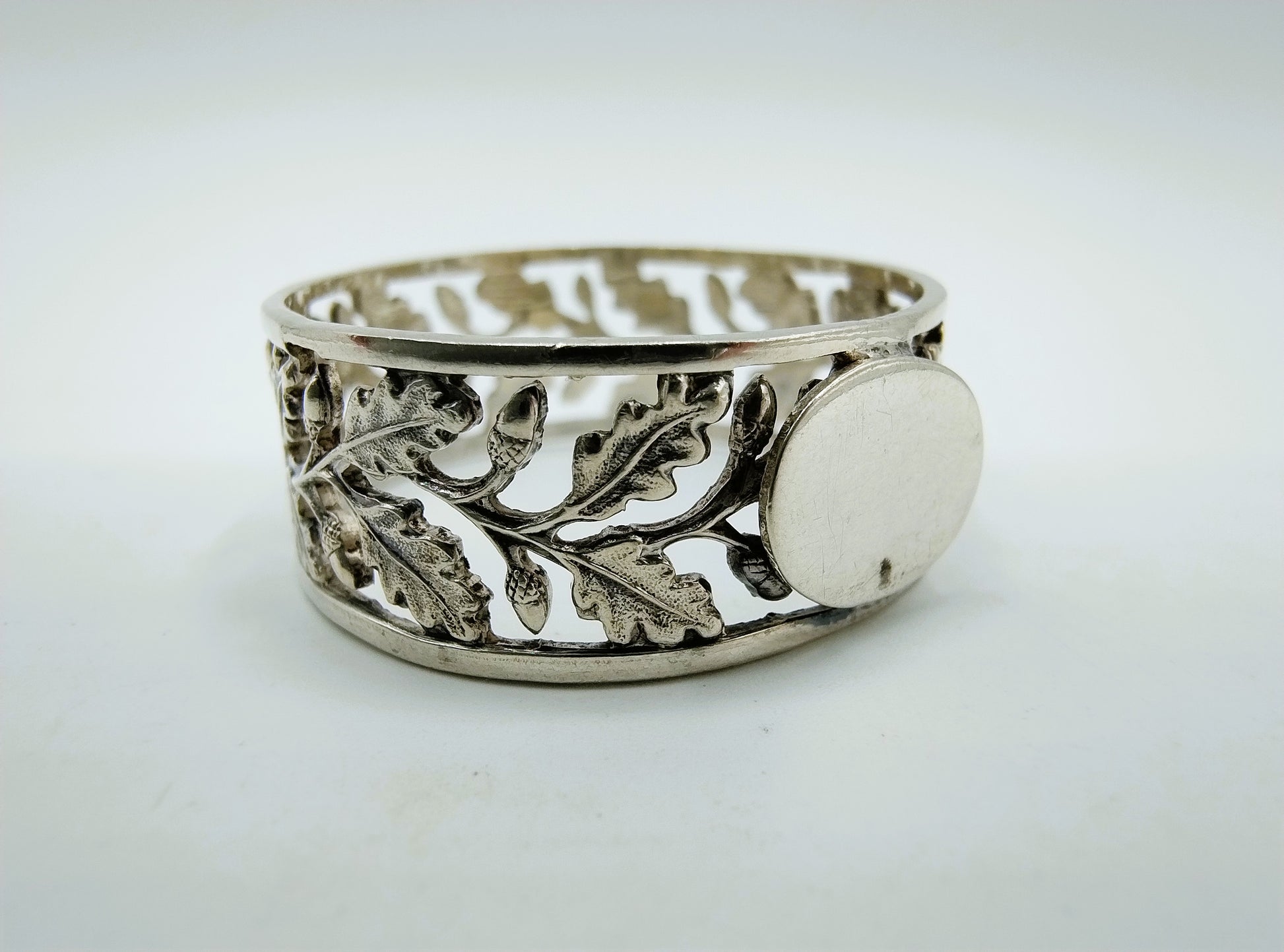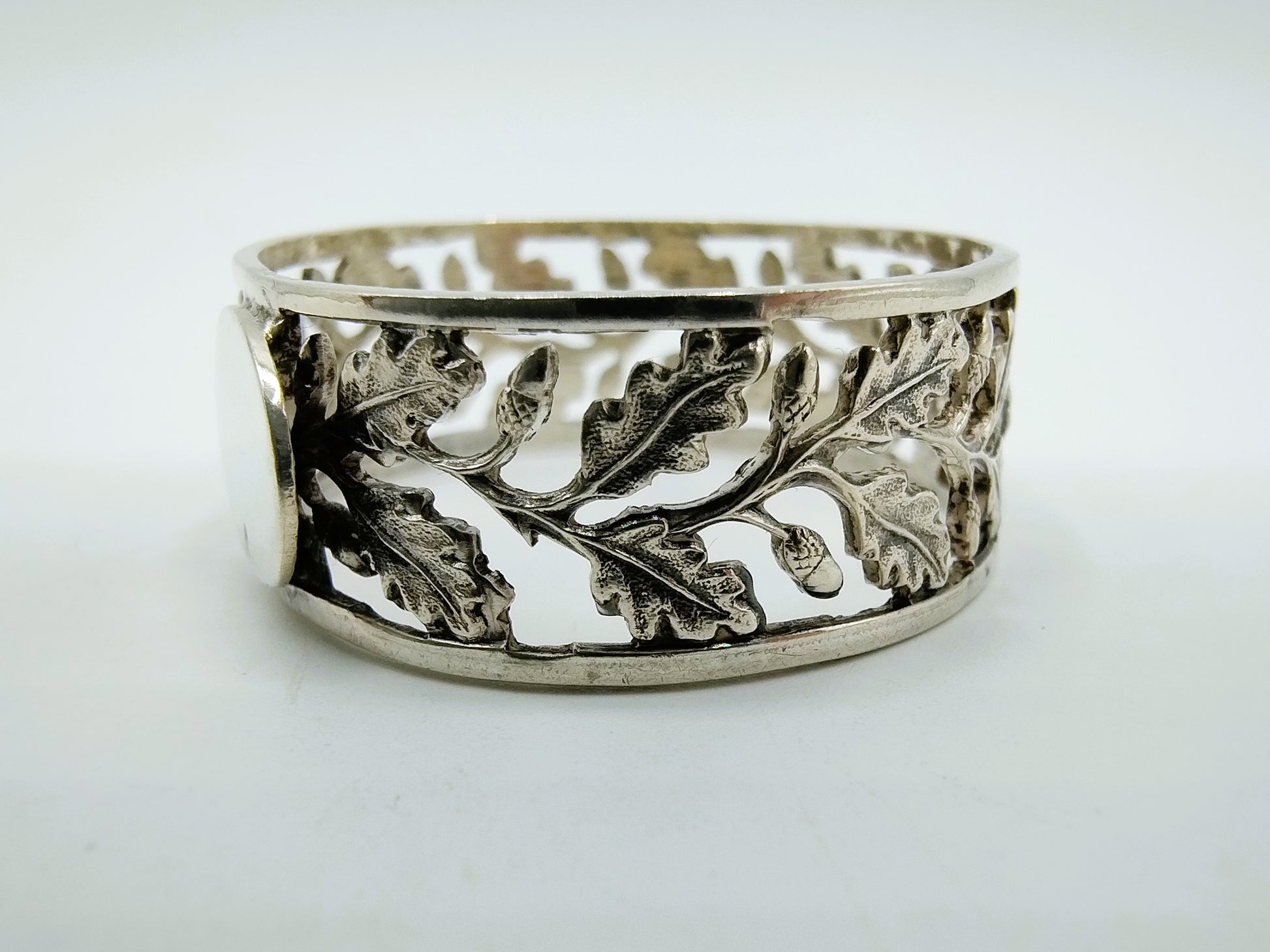 Zilveren herenring met opengewerkt decor van eikenbladeren en eikels.