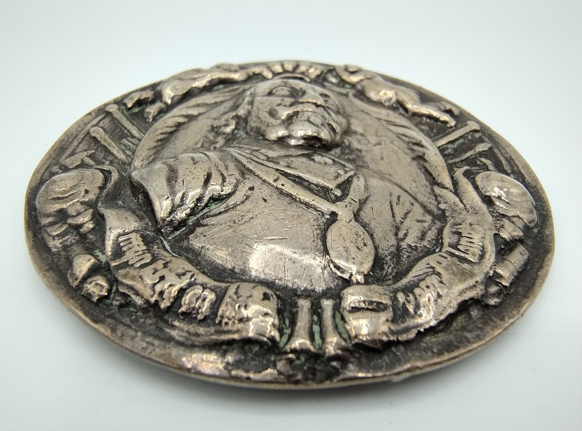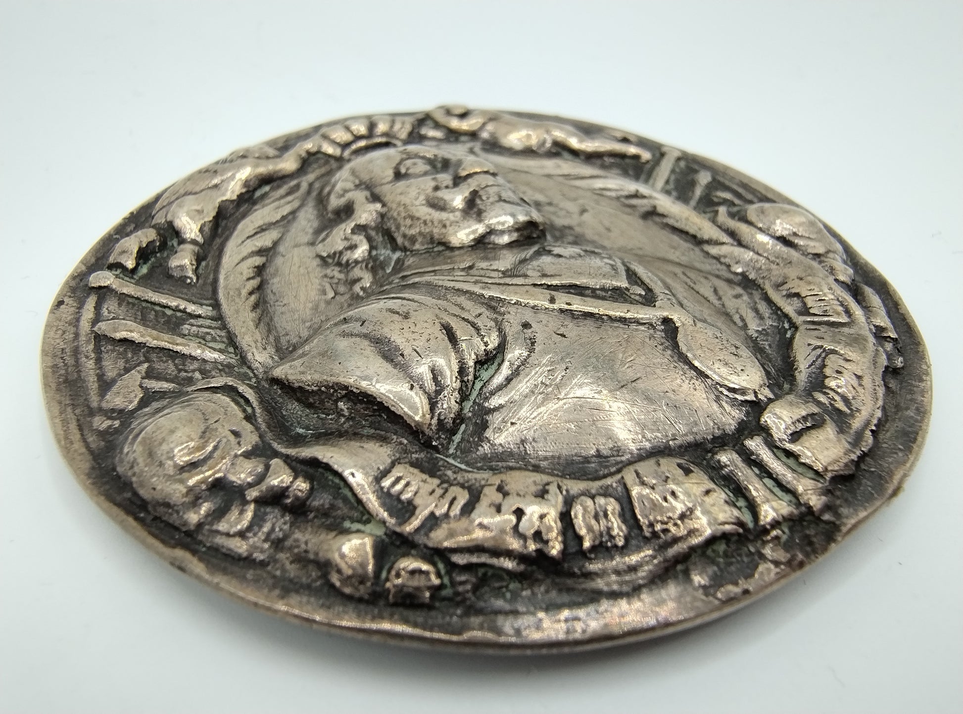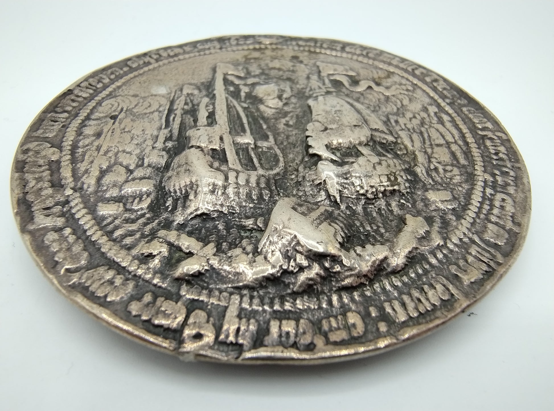 Een gegoten en gedreven zilveren penning met hoog reliëf gemaakt om het overlijden van Maarten Harpertszoon Tromp te gedenken. Deze penning is gemaakt door Wouter Muller.