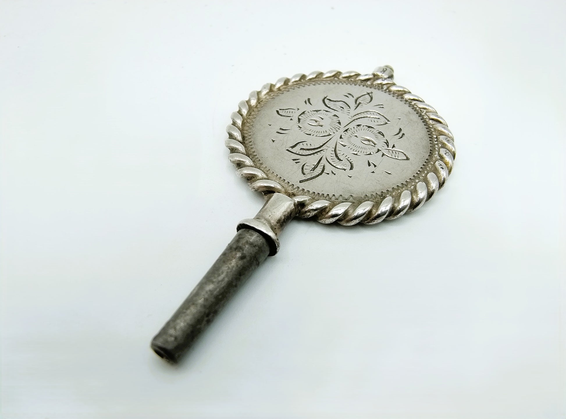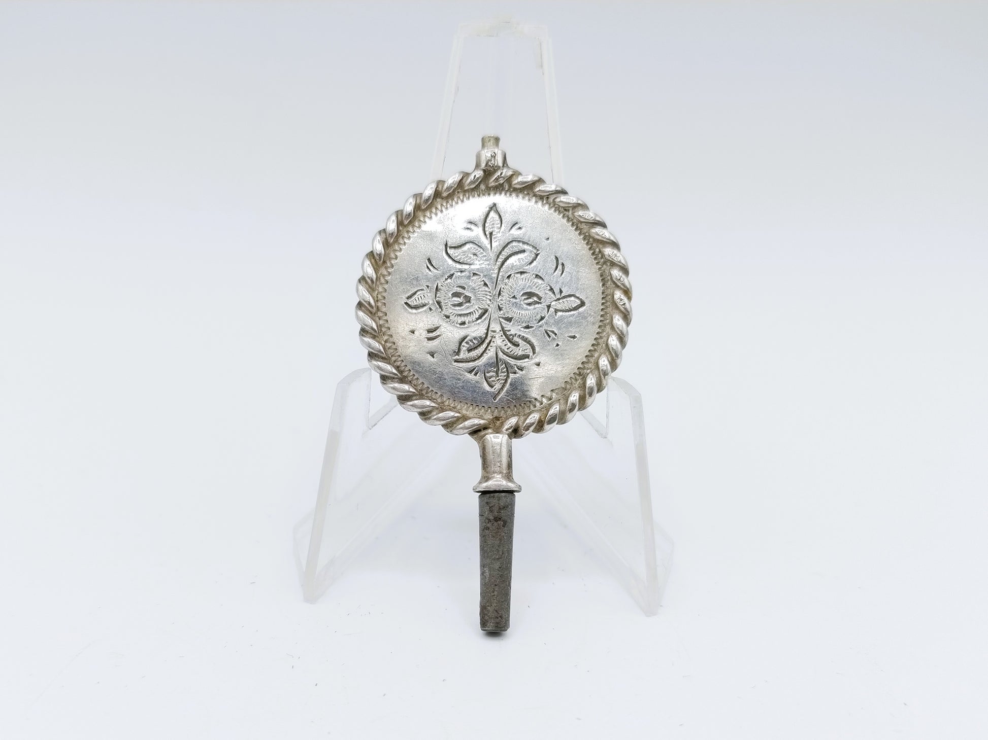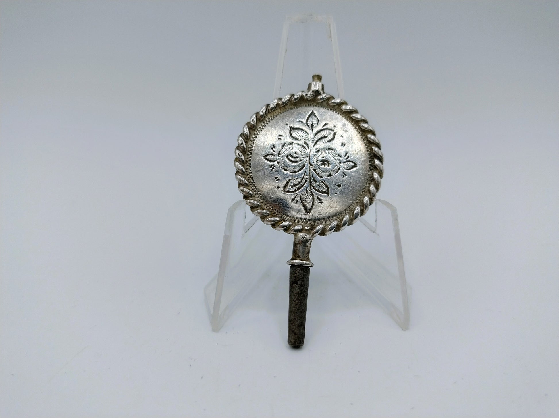 Zilveren horlogesleutel voorzien van blad- en krulmotieven binnen een getorste rand.