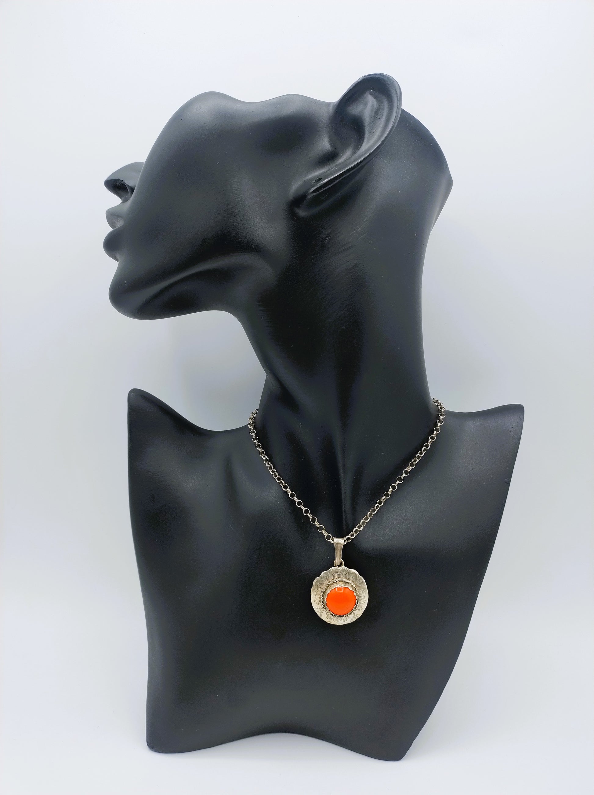 Zilveren jasseronketting met een schakelbreedte van 2 mm. Aan de ketting hangt een zilveren hanger voorzien van een cabochon geslepen bloedkoraal.