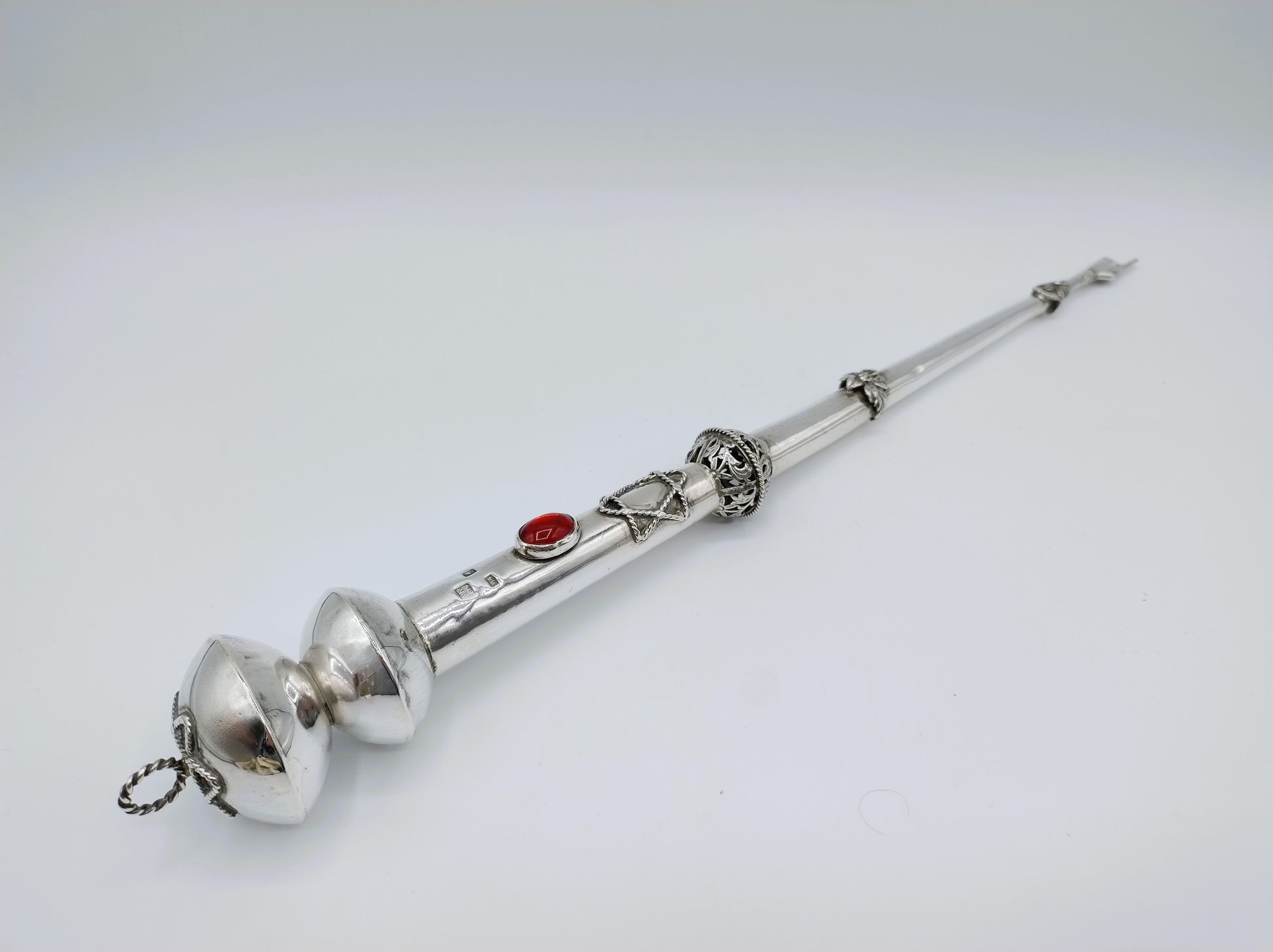 De jat is voorzien van een rode steen.