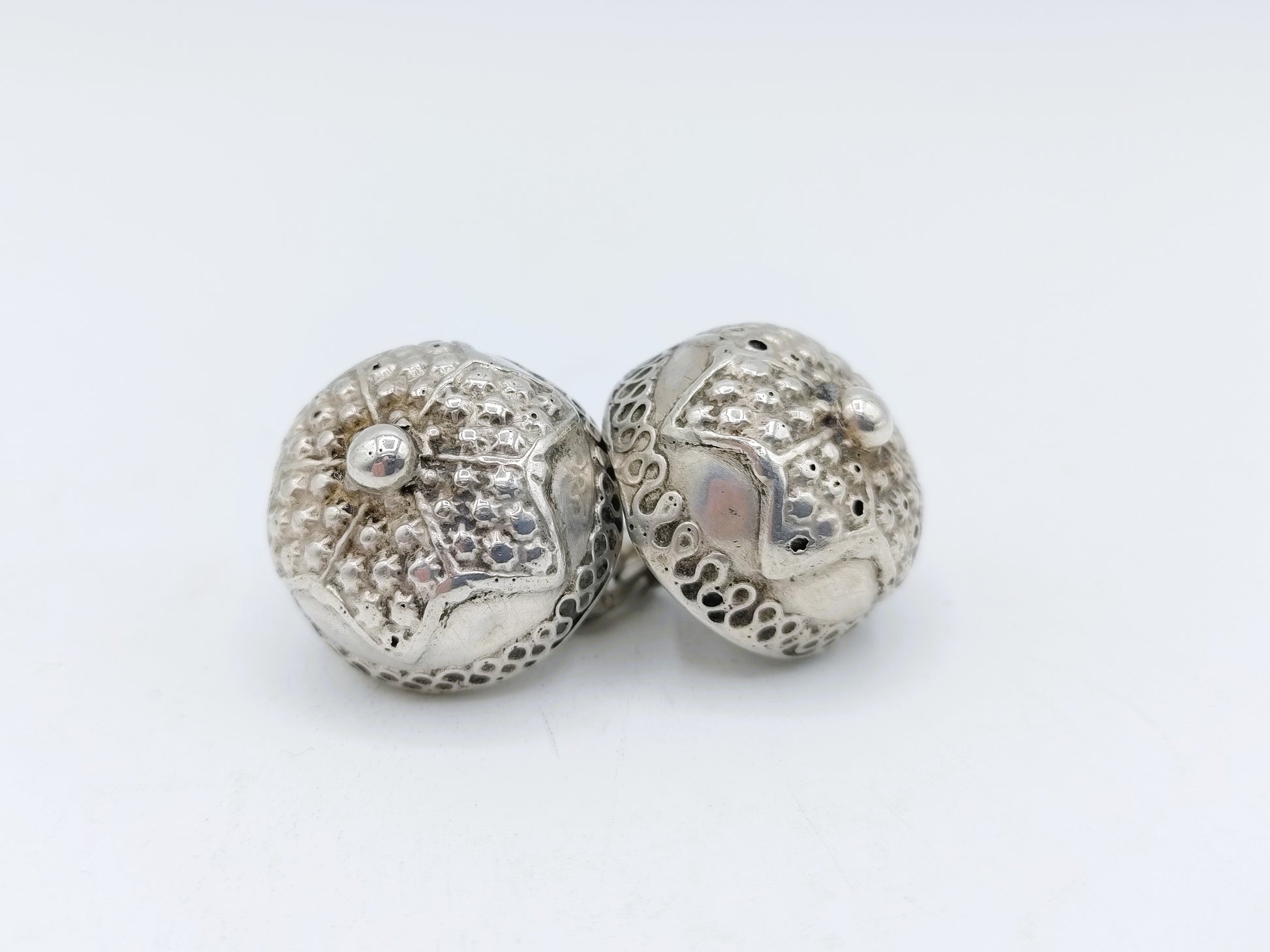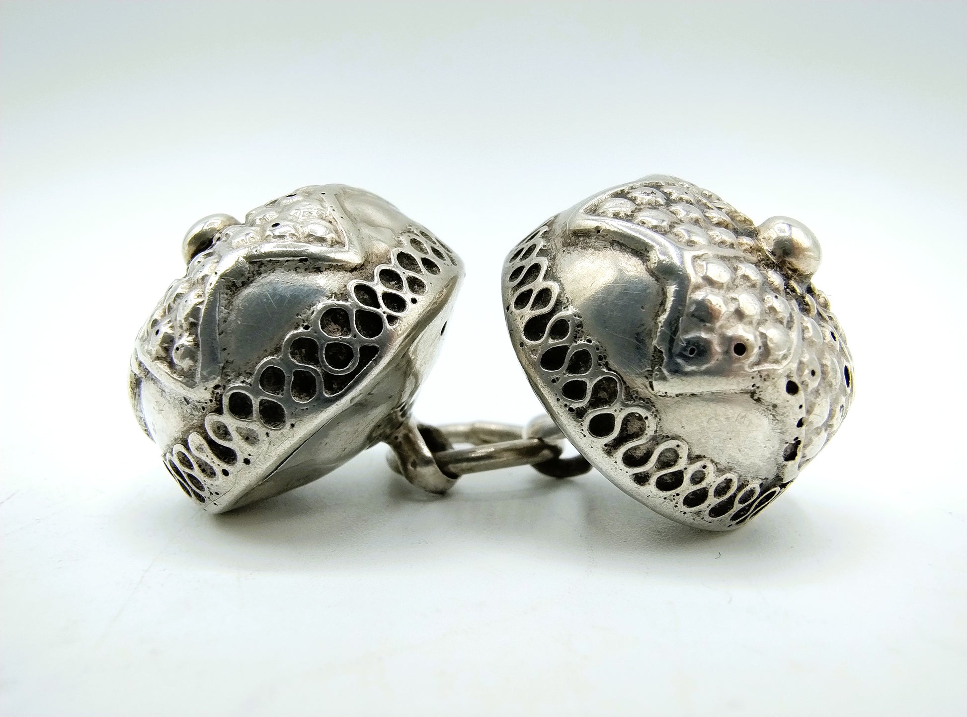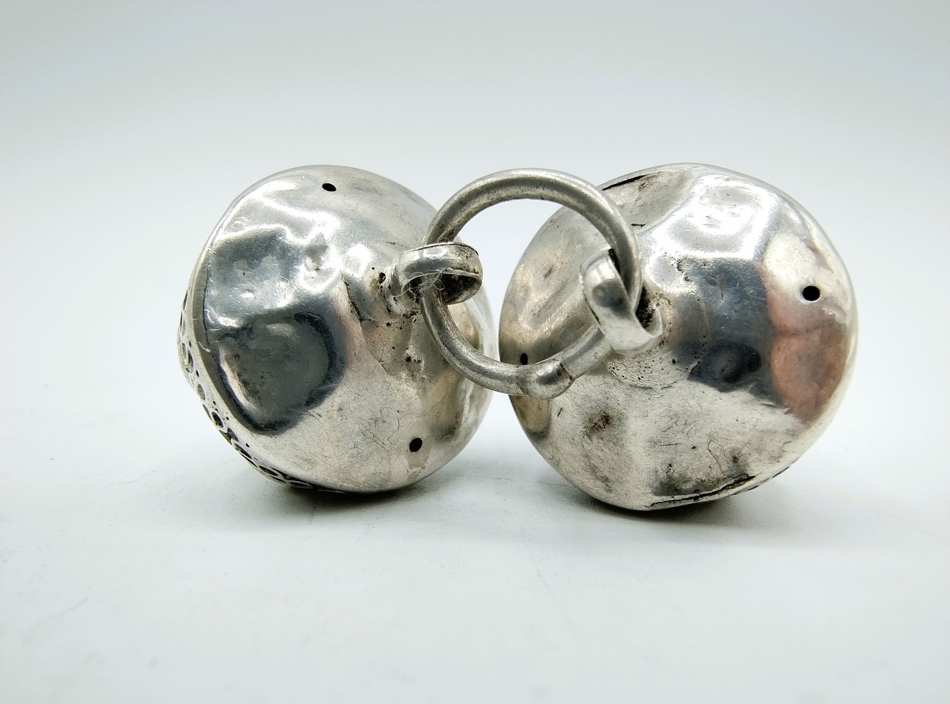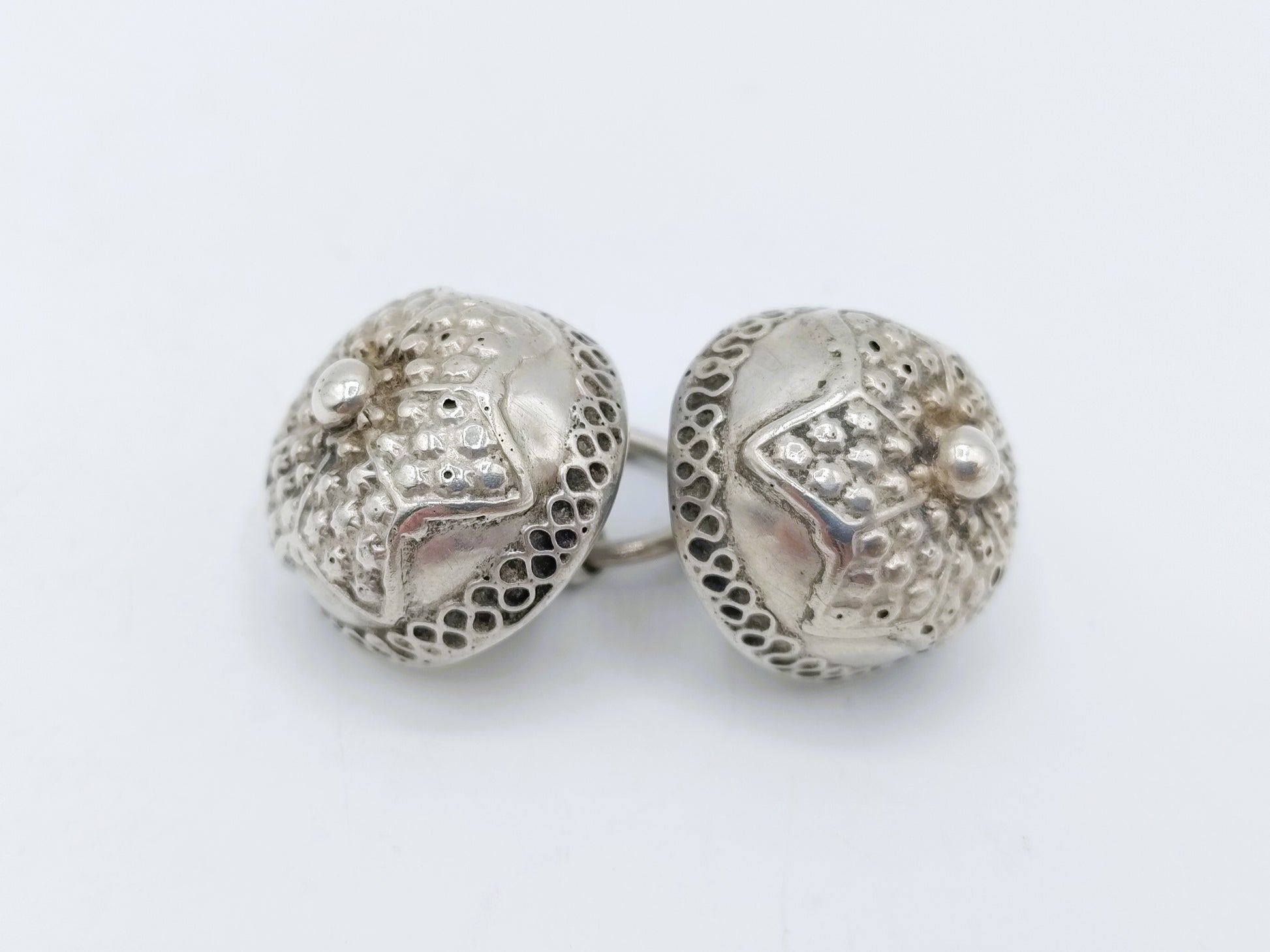 Zilveren keelknopen, gemaakt door de zilversmeden Gebr. H. en J. Jonker uit Meppel. Zij waren werkzaam van 1890 tot 1924.