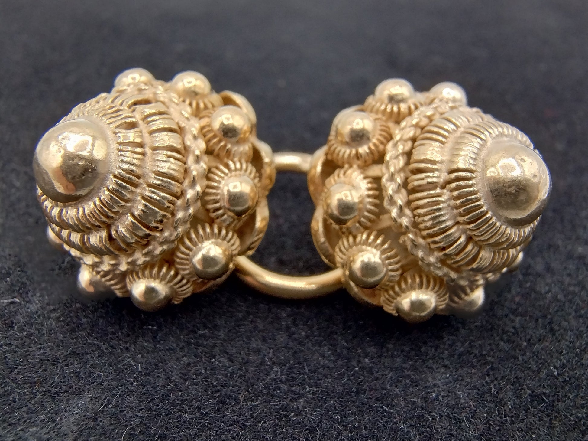 De knopen zijn schoongemaakt, goudverguld en samengevoegd als keelknopen door een edelsmid.
