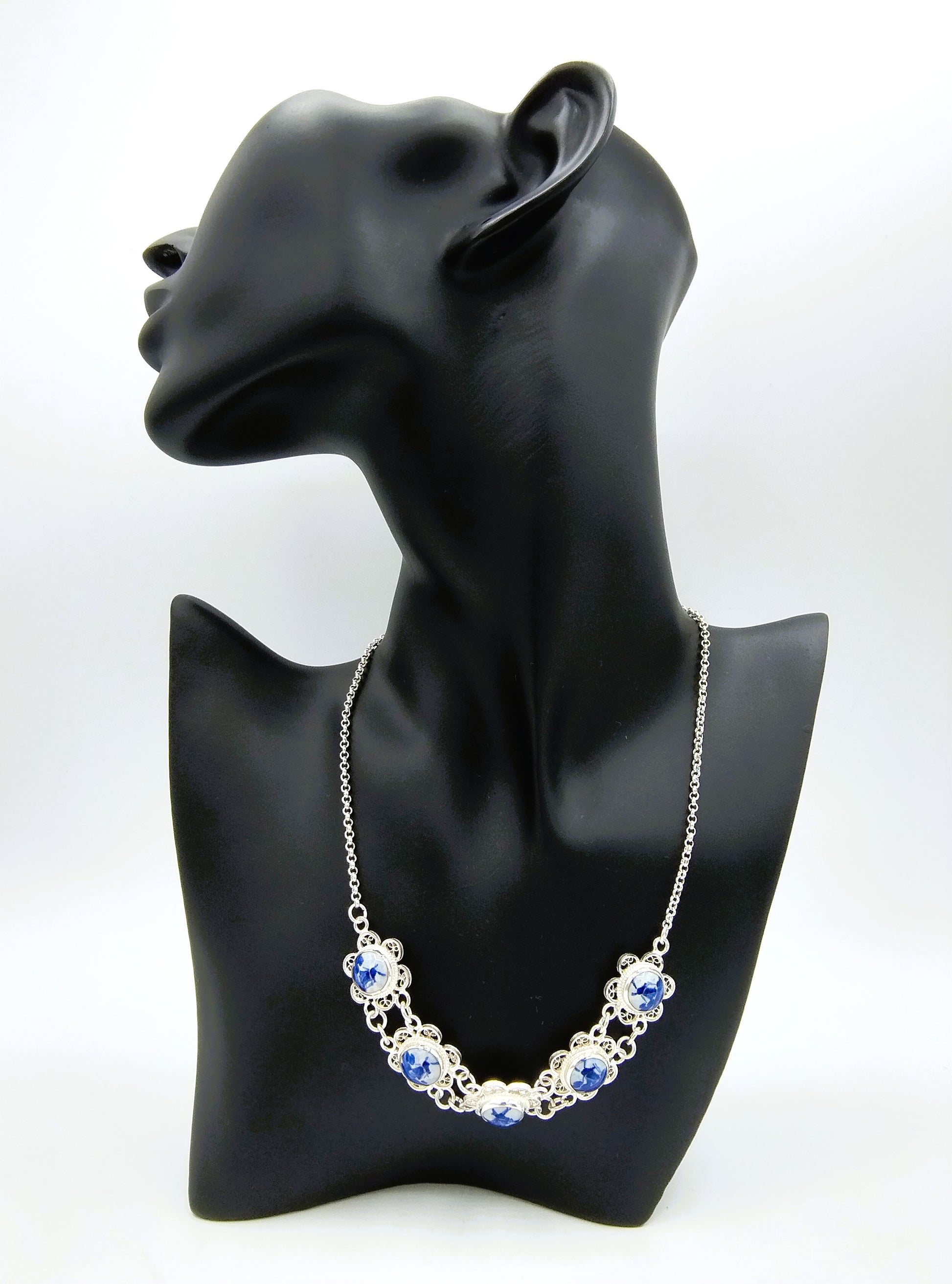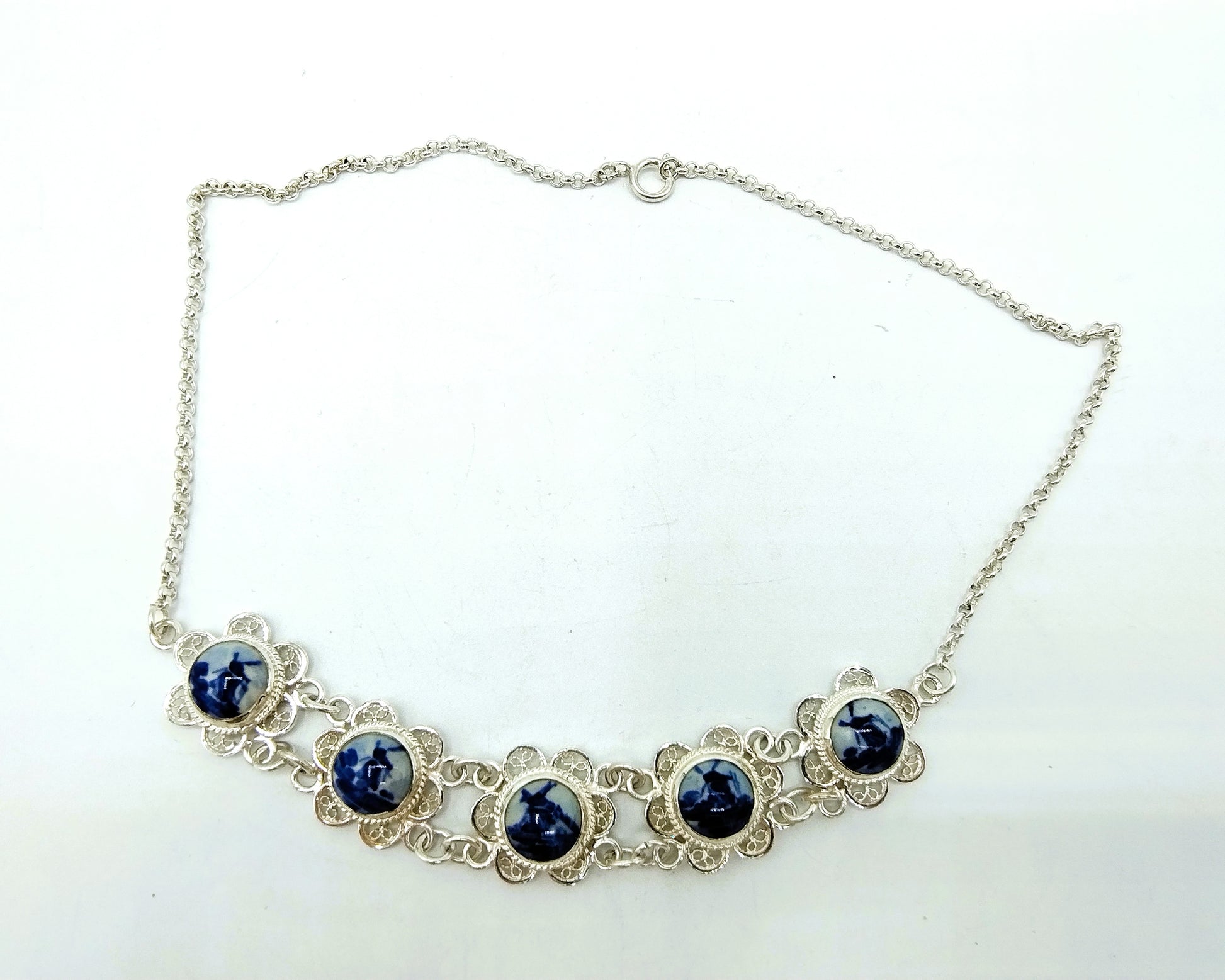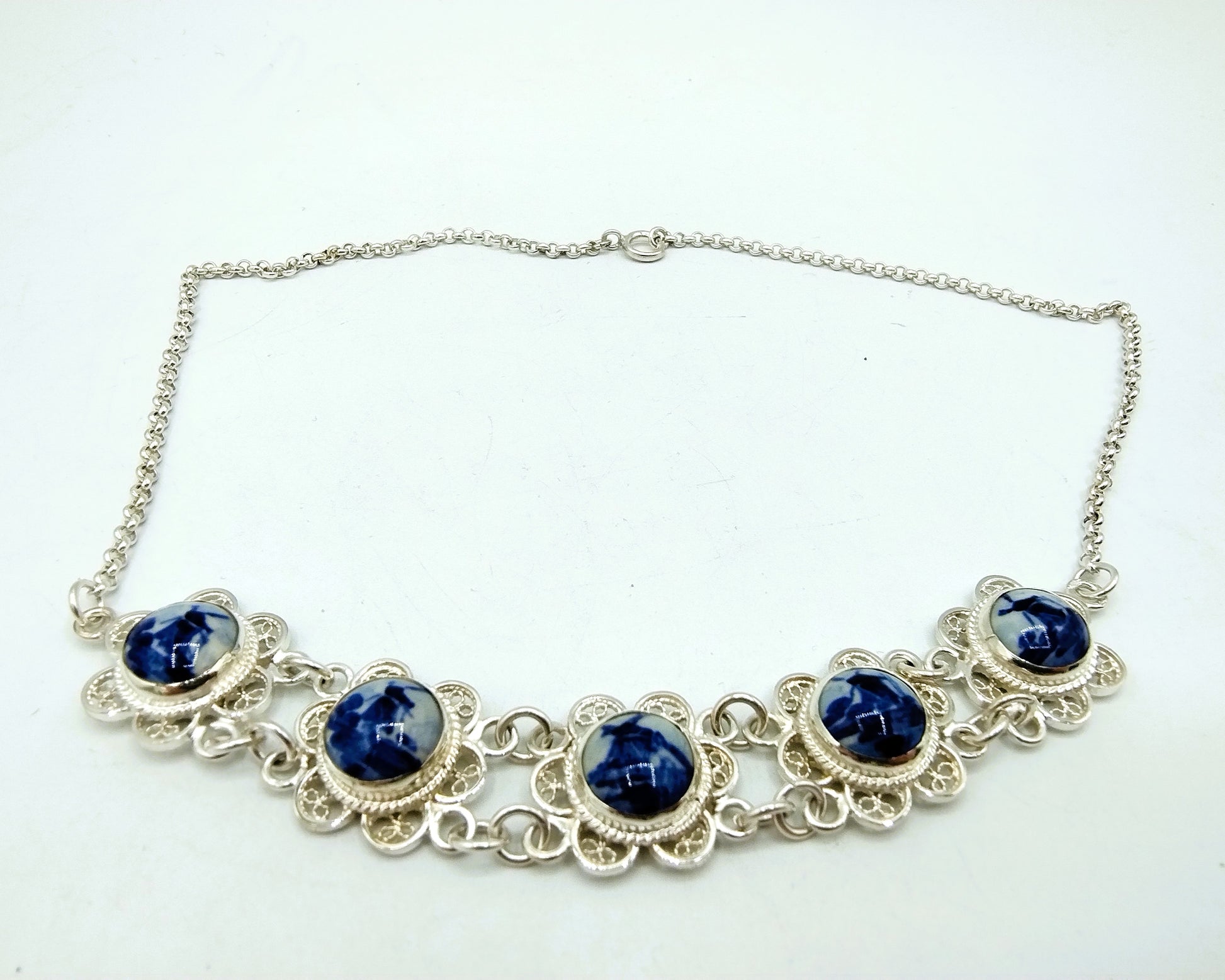 Zilveren ketting met 5 Delfts blauwe keramieken afbeeldingen van een molen. Deze afbeeldingen zijn gezet in een gladde kast en voorzien van filigrain zilversmeedwerk.