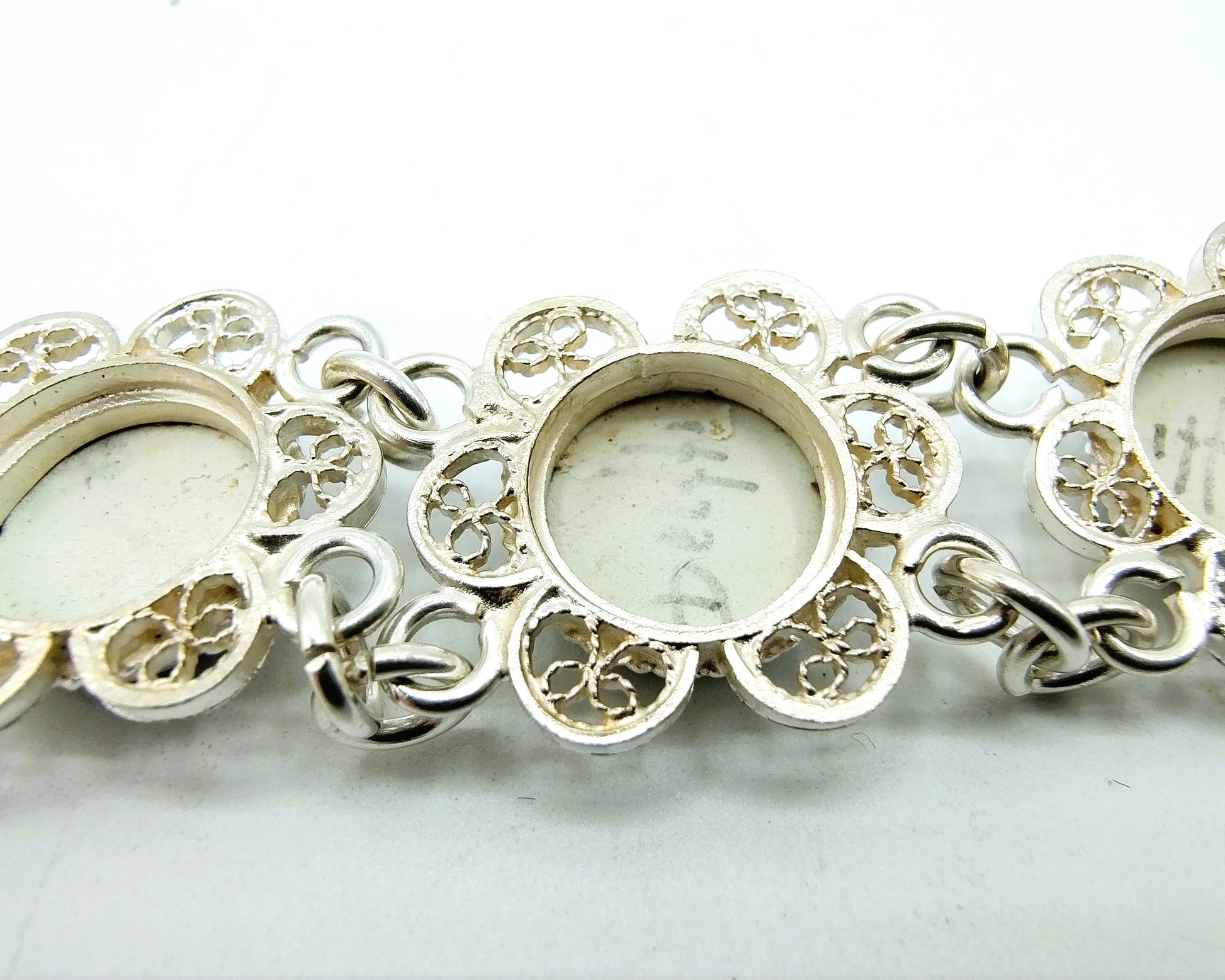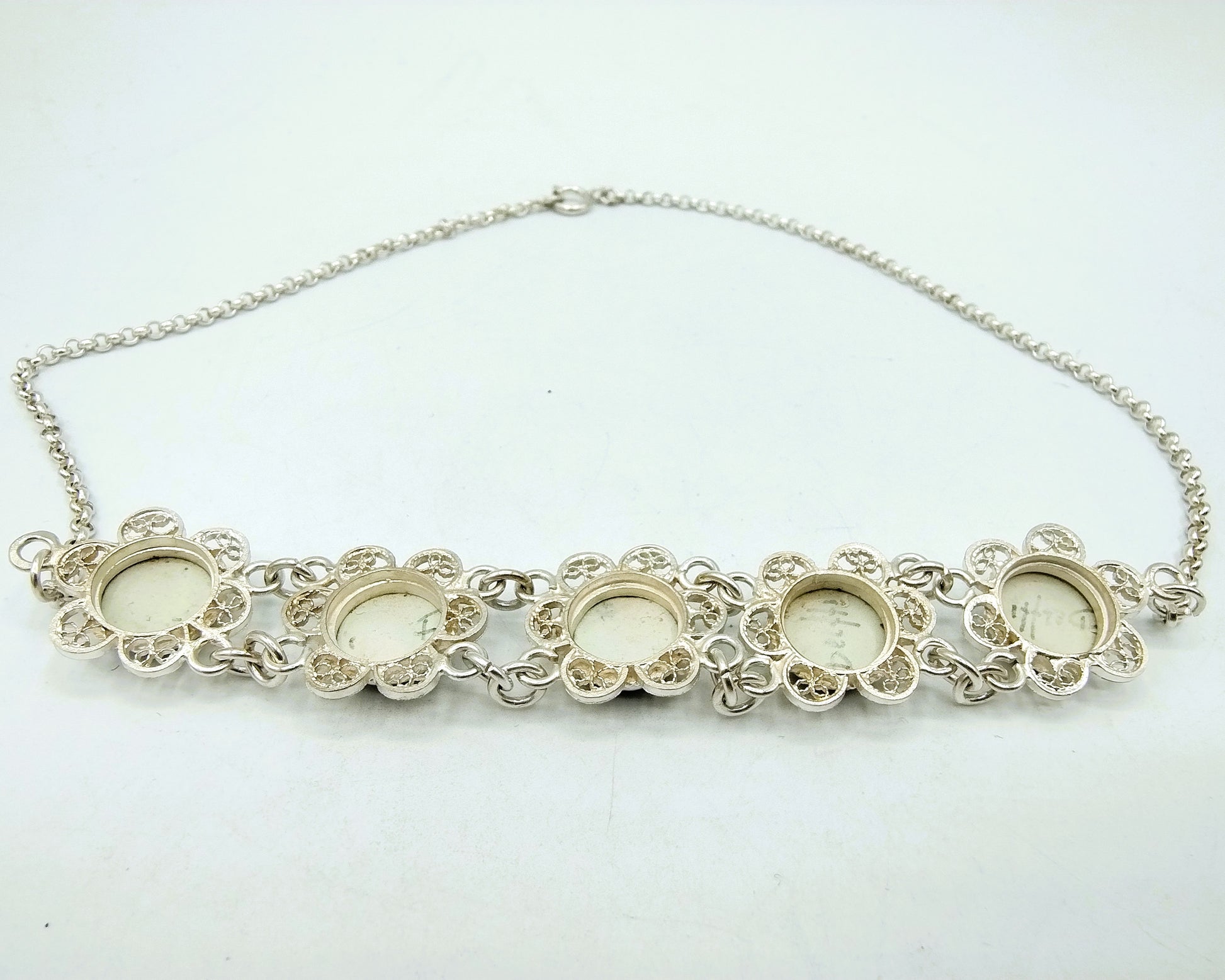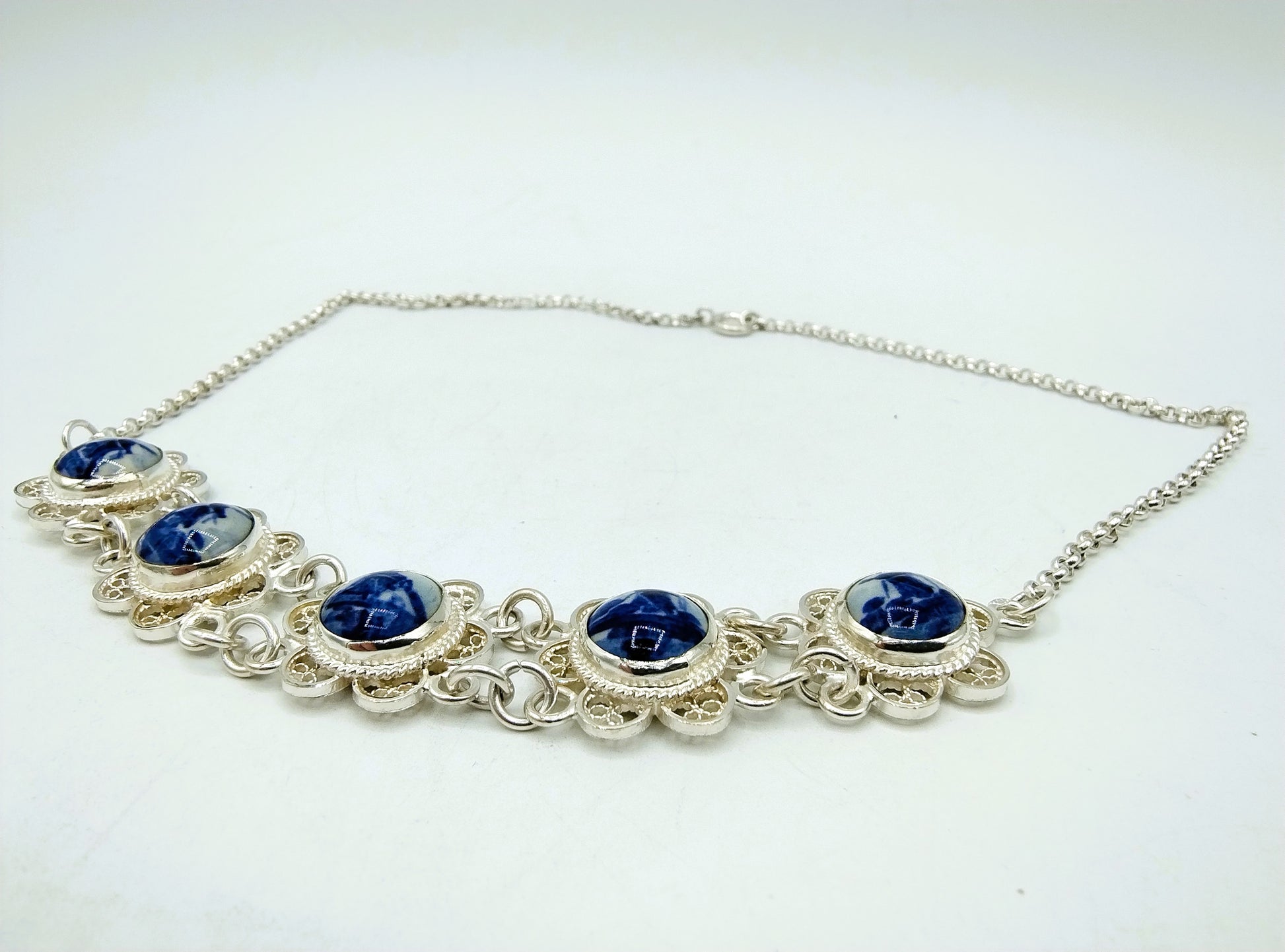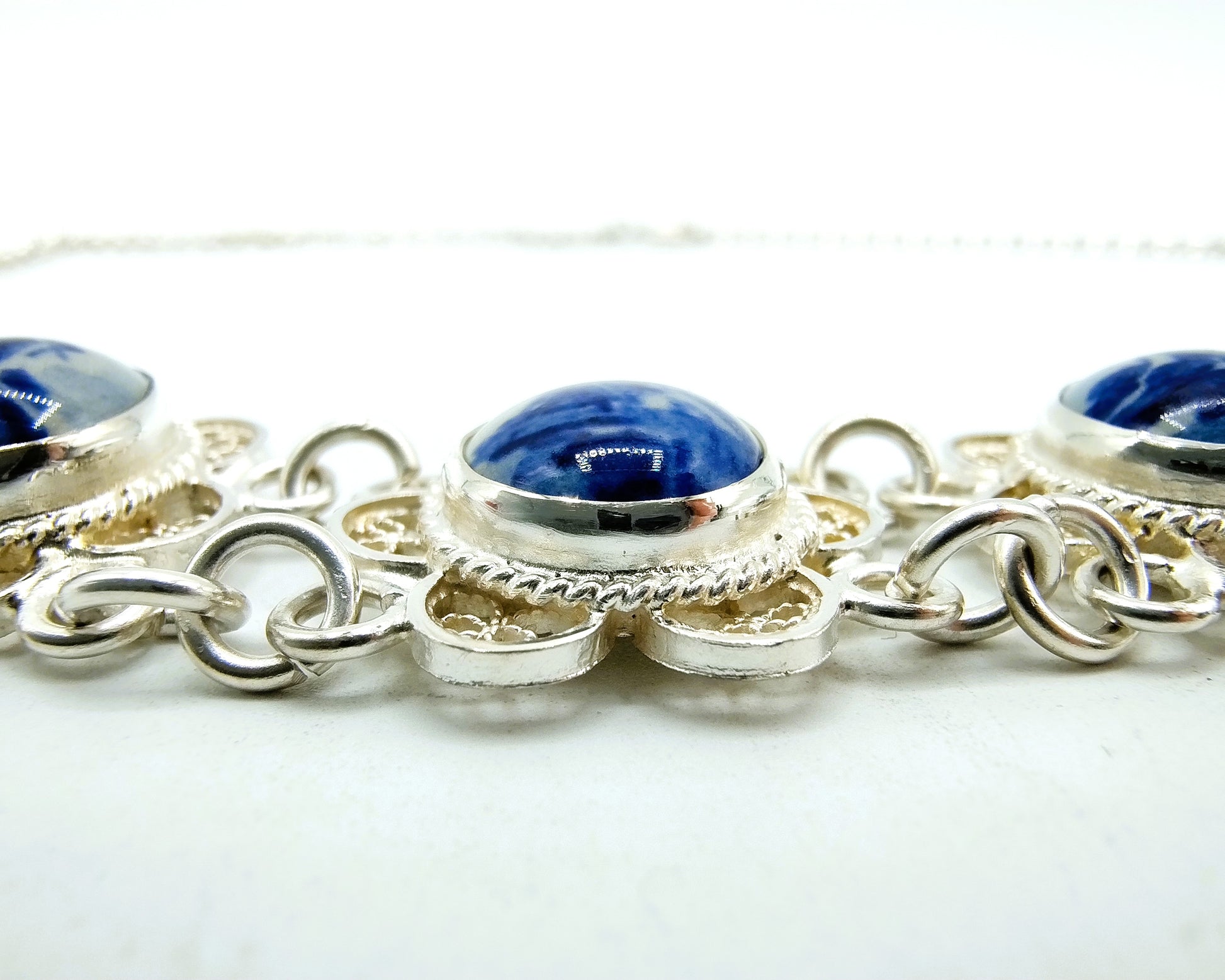 Zilveren ketting met 5 Delfts blauwe keramieken afbeeldingen van een molen. Deze afbeeldingen zijn gezet in een gladde kast en voorzien van filigrain zilversmeedwerk.