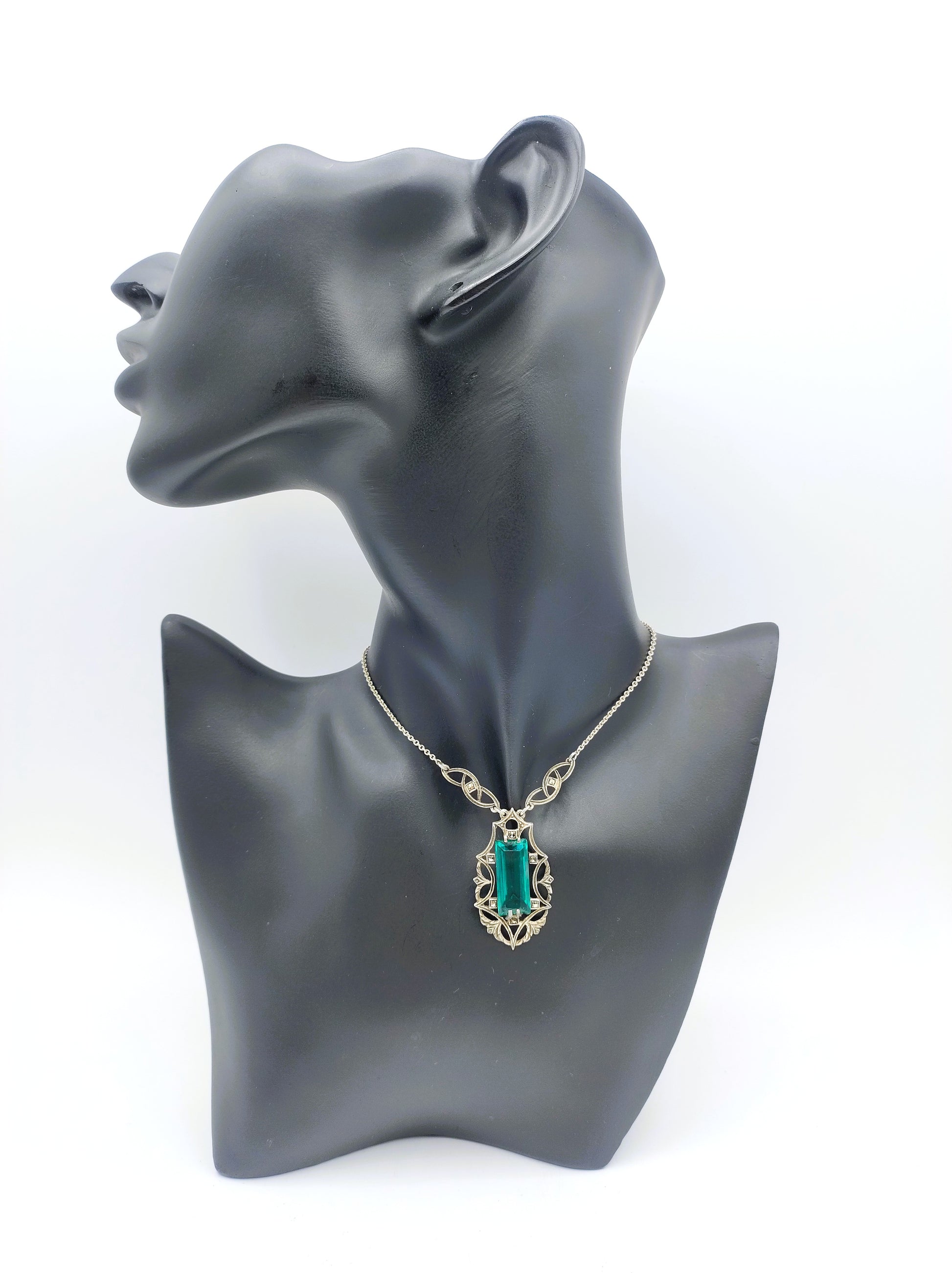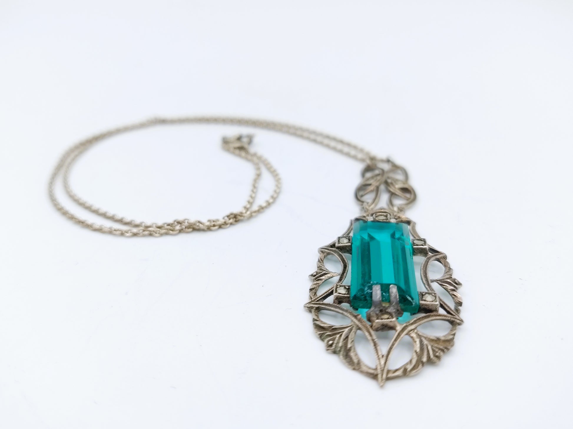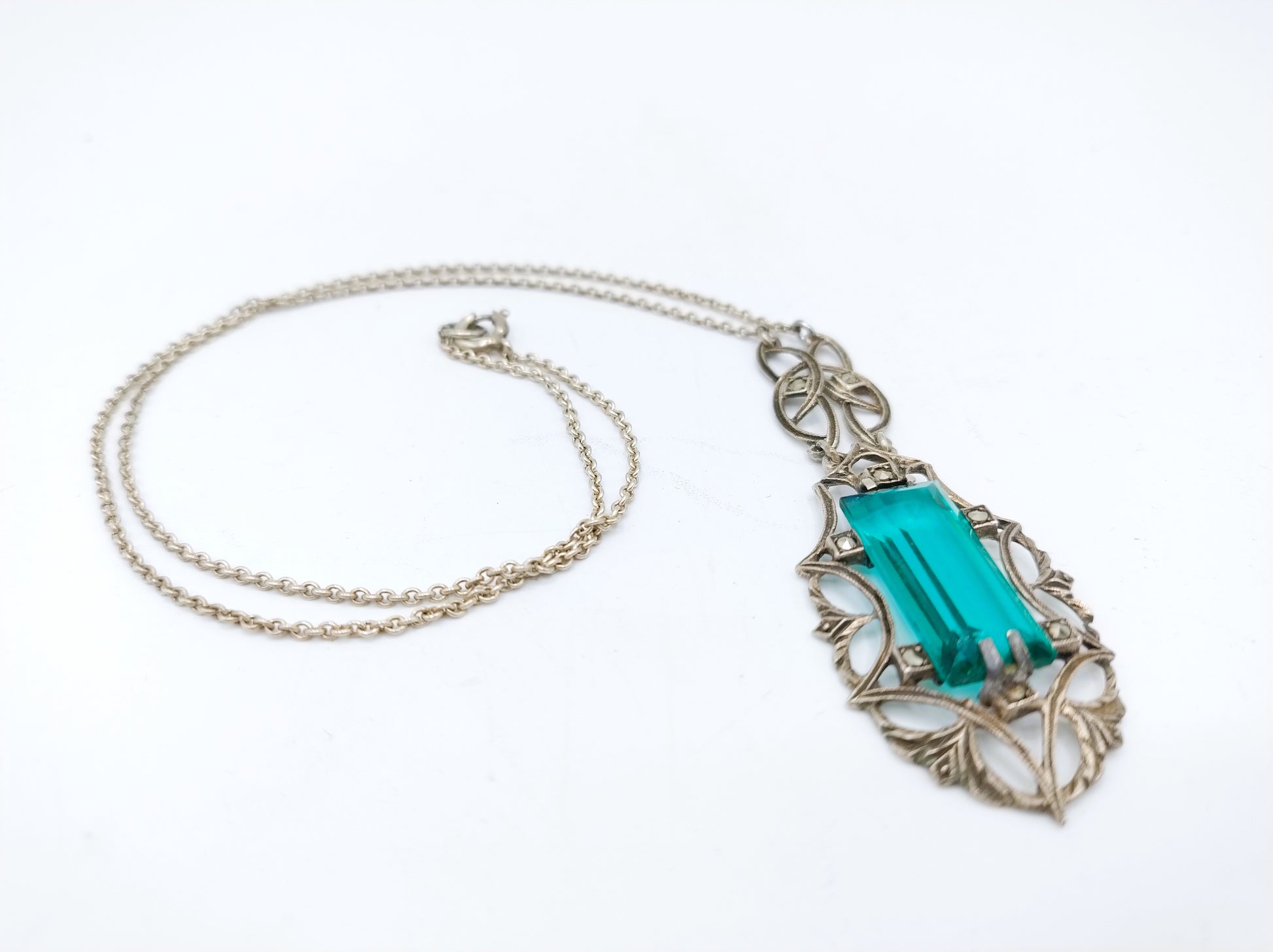 Zilveren ketting met groene steen in art deco hanger, 44,5 cm.