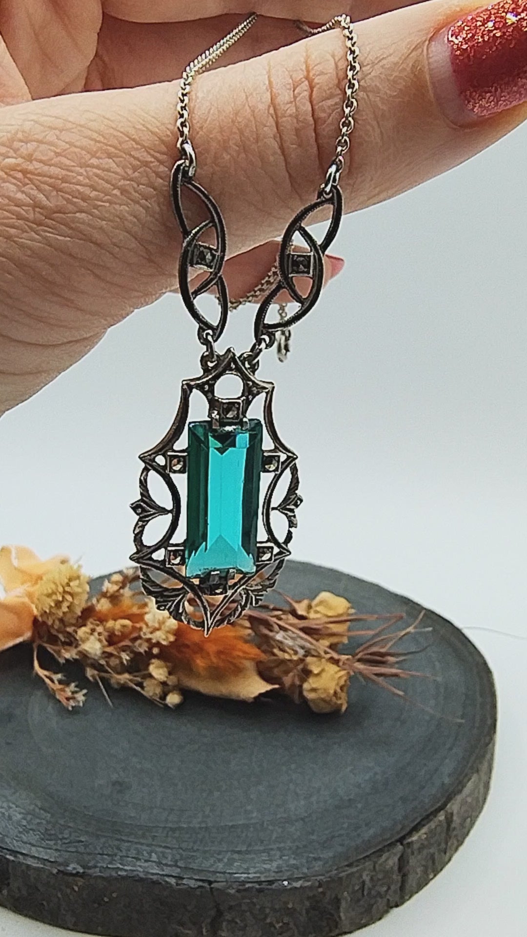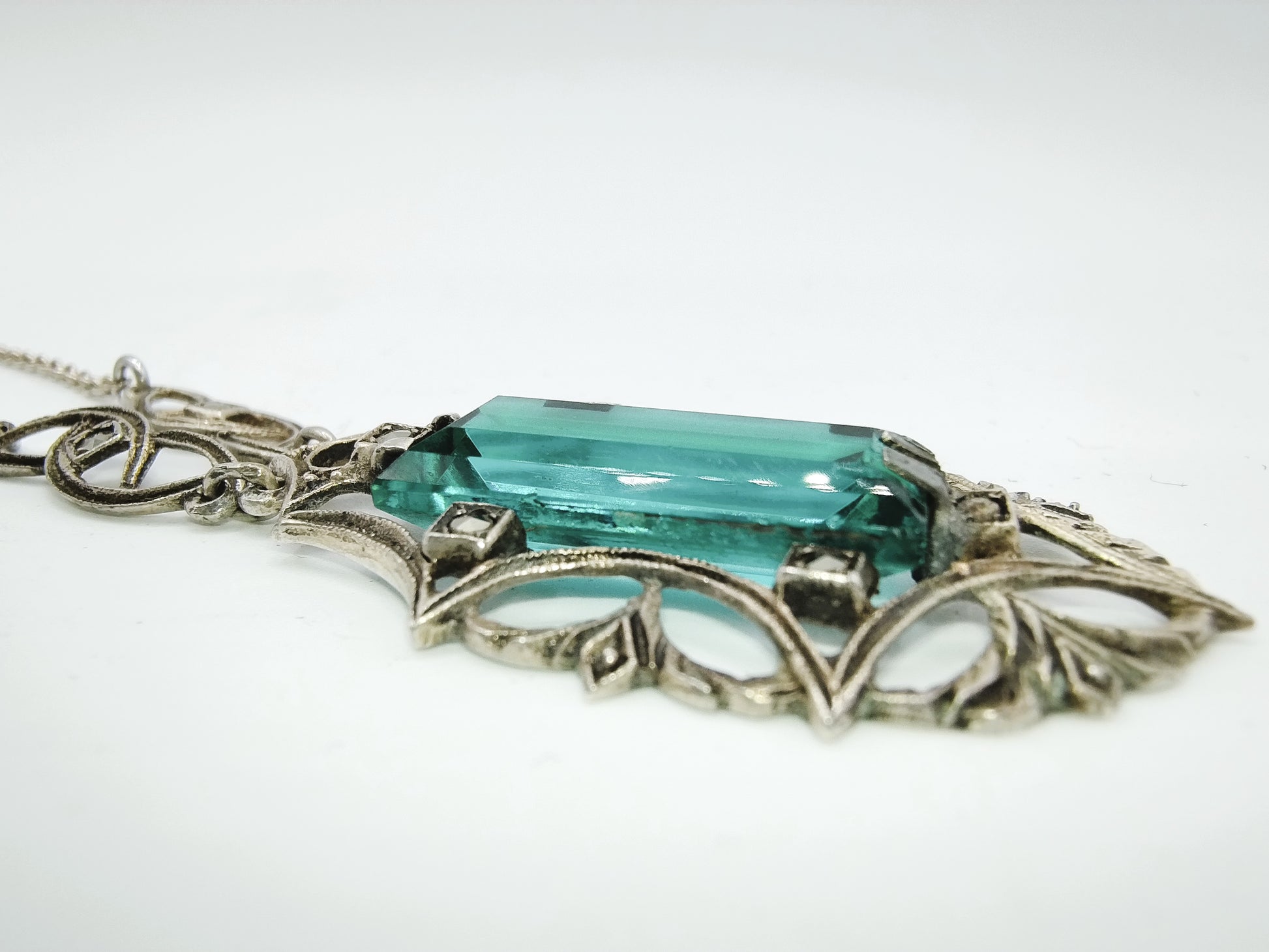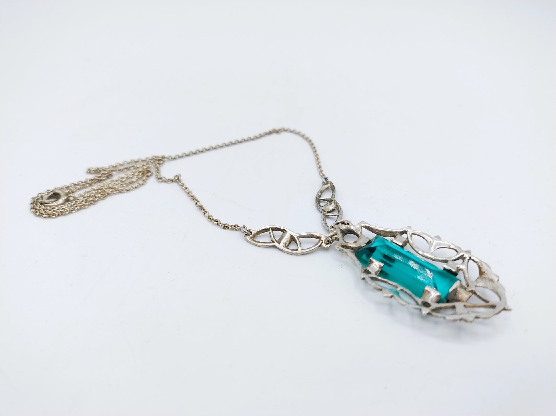 Zilveren ketting met groene steen in art deco hanger, 44,5 cm.