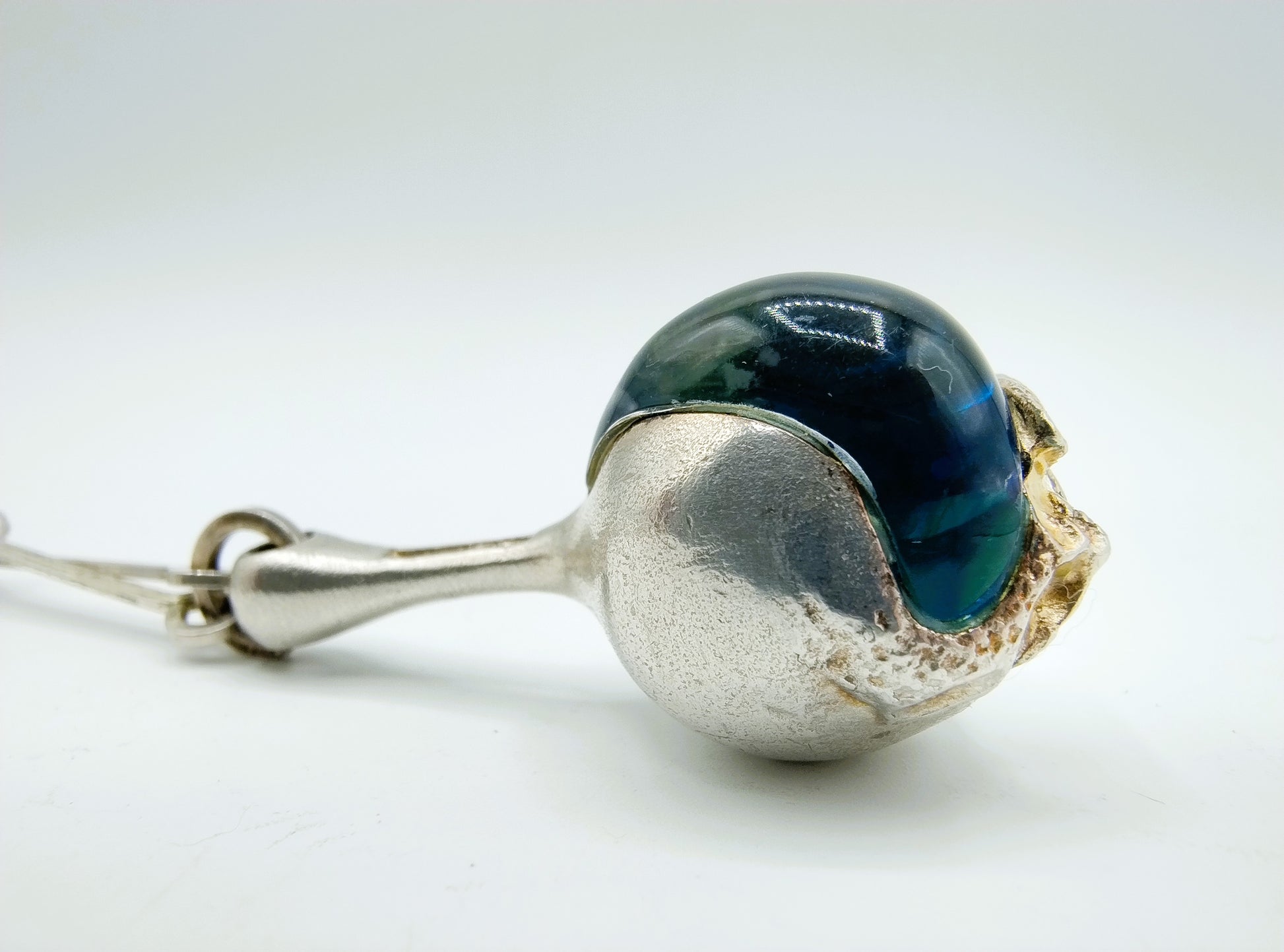 Zilveren staafvormige schakelketting met daaraan een hanger van acryl en zilver van de ontwerper Bjorn Weckström.