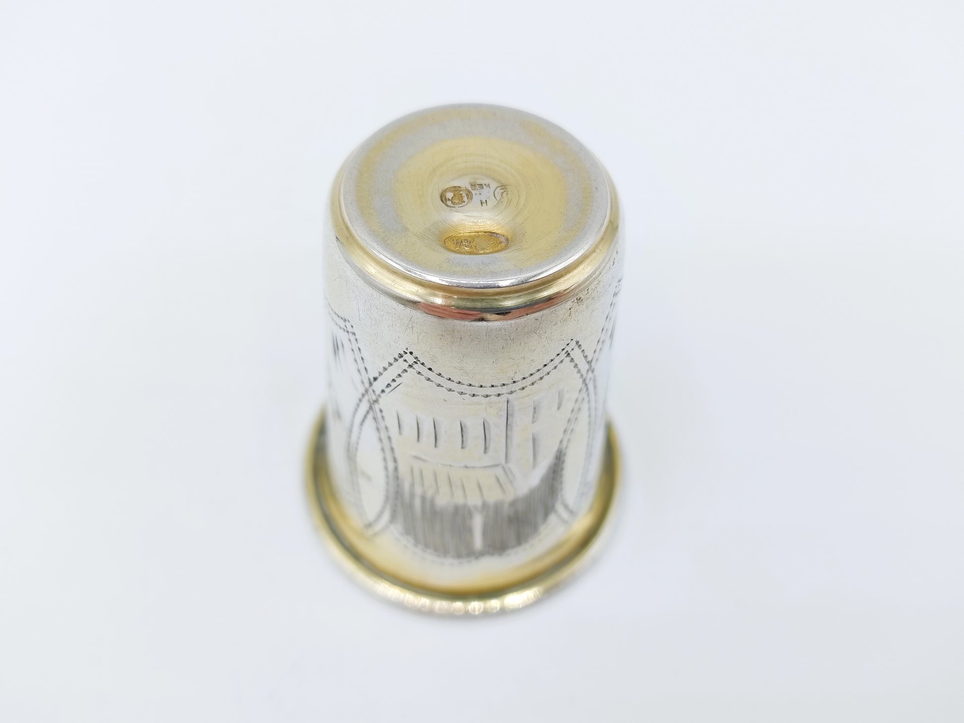 Het meesterteken Н over ИЕЗ staat voor Наследники И.Е. Заходера (Heirs of I.E. Zakhoder). Israel Yeselevich Zakhoder was eigenaar van een zilverwarenfabriek en een gerenommeerde producent van Judaica. Na zijn overlijden in 1907 werd het atelier voortgezet door zijn erfgenamen, wat tot uiting komt in de toevoeging van de letter “Н” (Nasledniki / Erfgenamen) aan het oorspronkelijke ИЕЗ-merk. Dit maakt deze kiddush cup direct te dateren en extra zeldzaam.