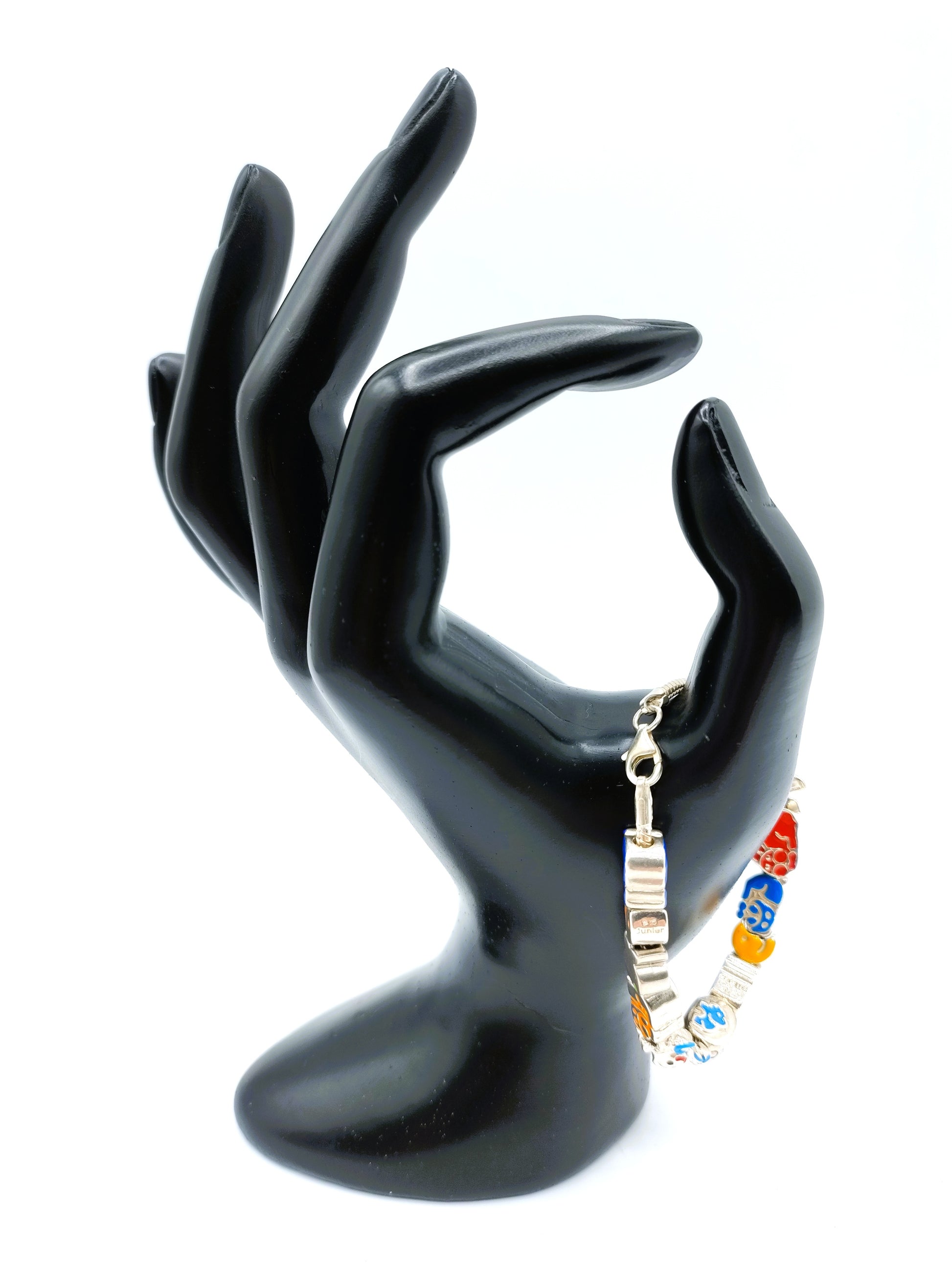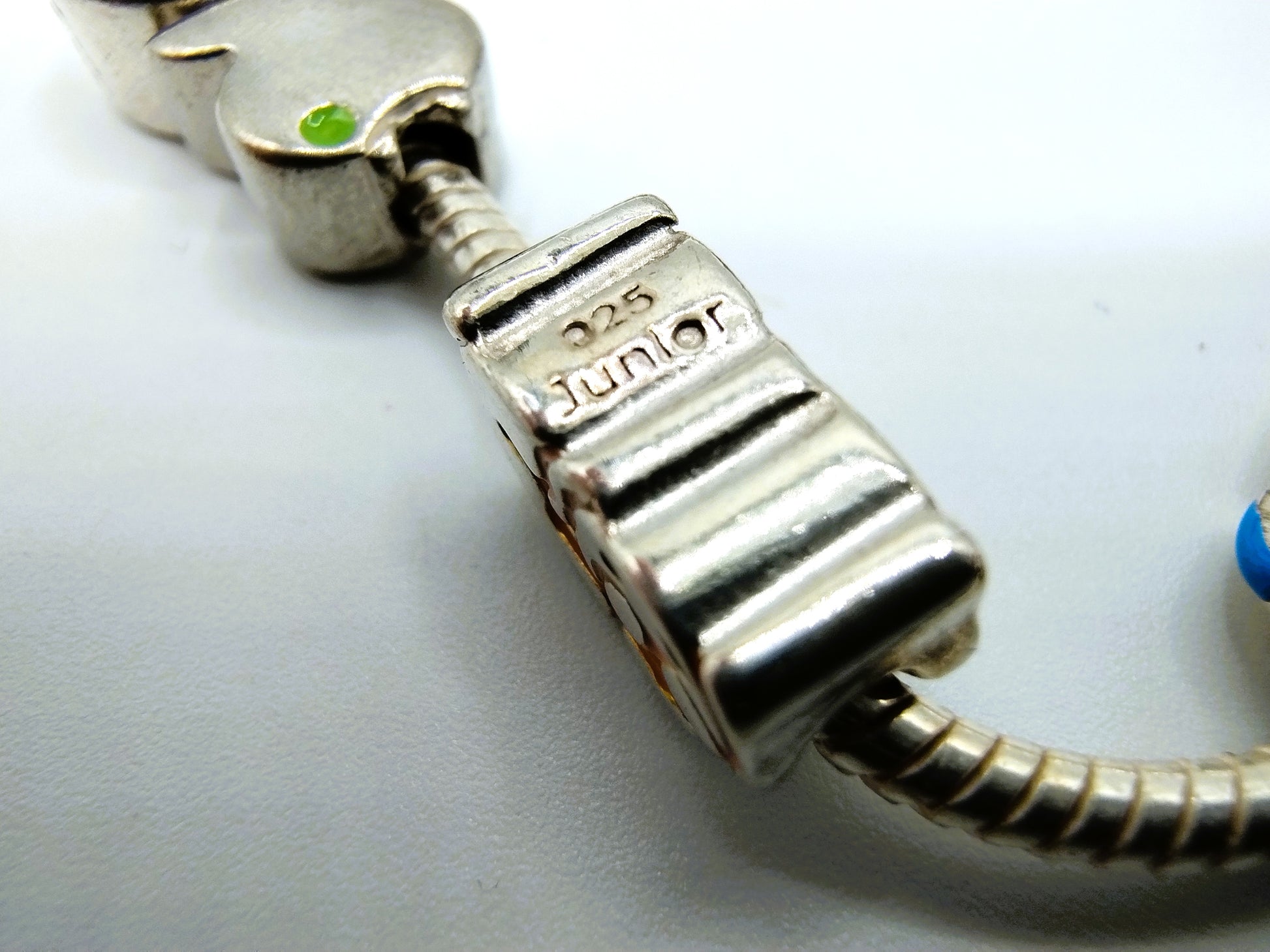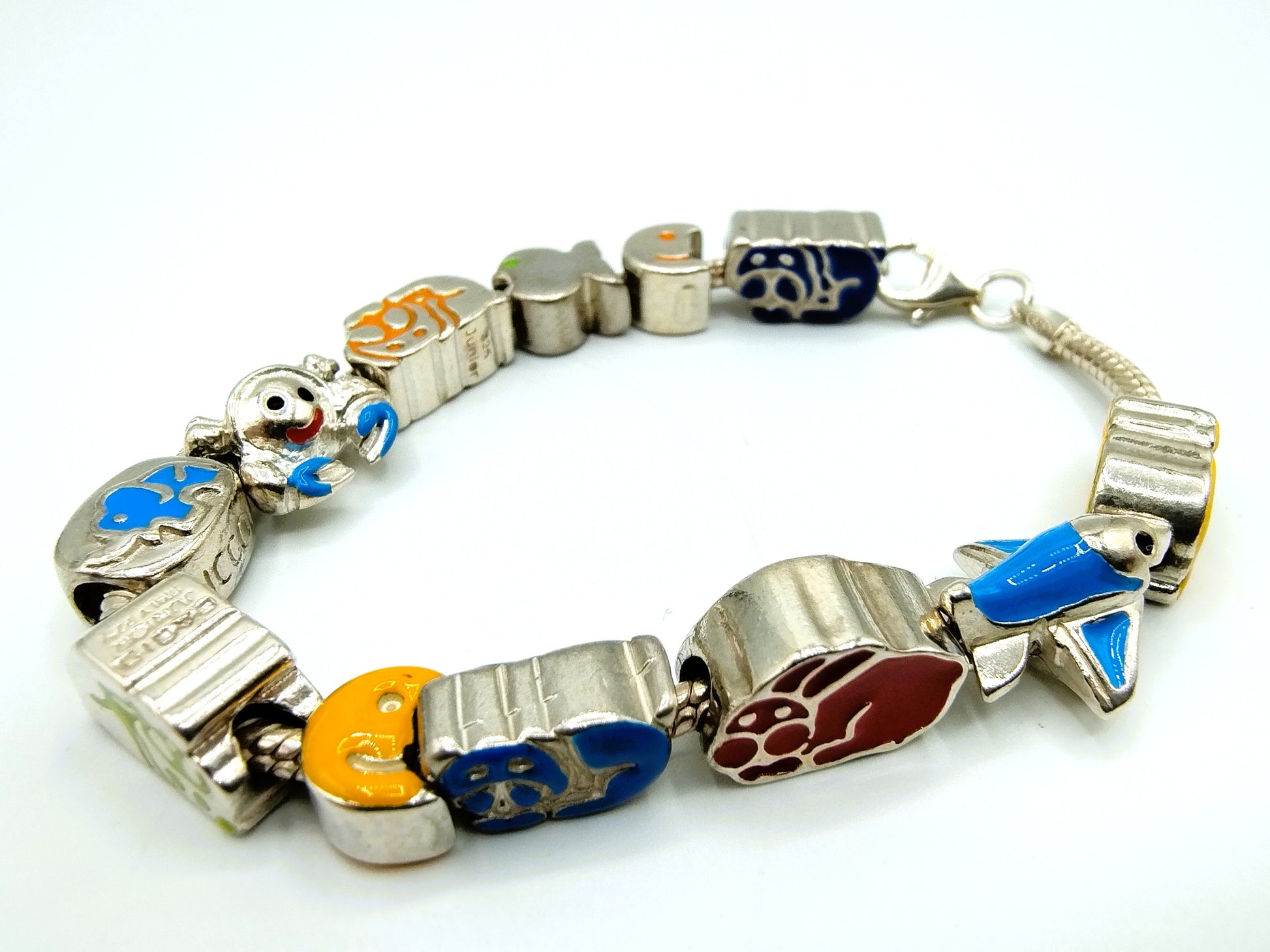 De armband heeft 12 bedels met emaille van kinderfiguren, o.a. een vliegtuig, maan, vis en kreeft.