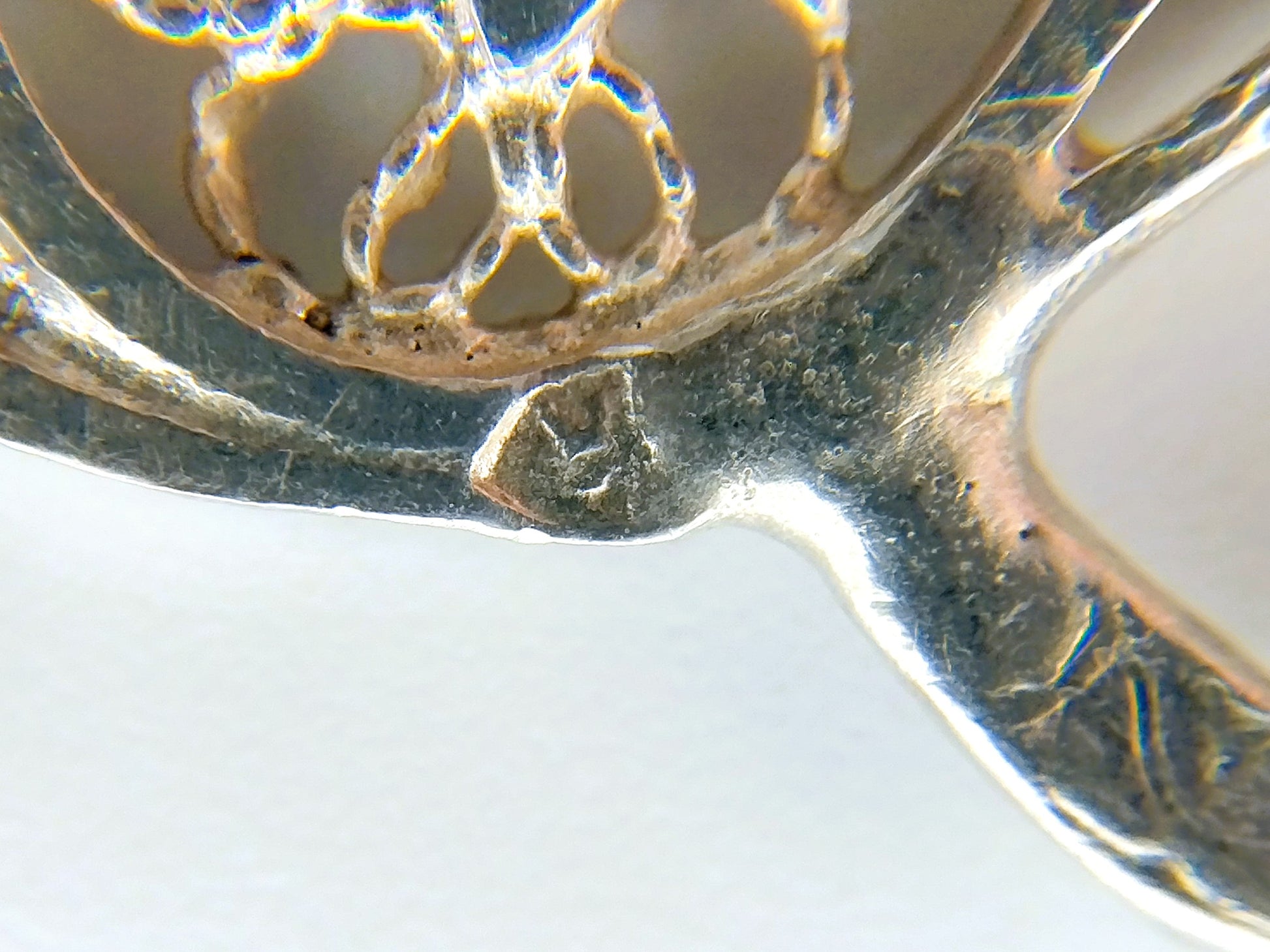 De kraalhaak is zeer fijn uitgewerkt en gekeurd met het zwaardje voor minimaal 2e gehalte zilver. Tevens gekeurd met een moeilijk leesbaar meesterkeur.