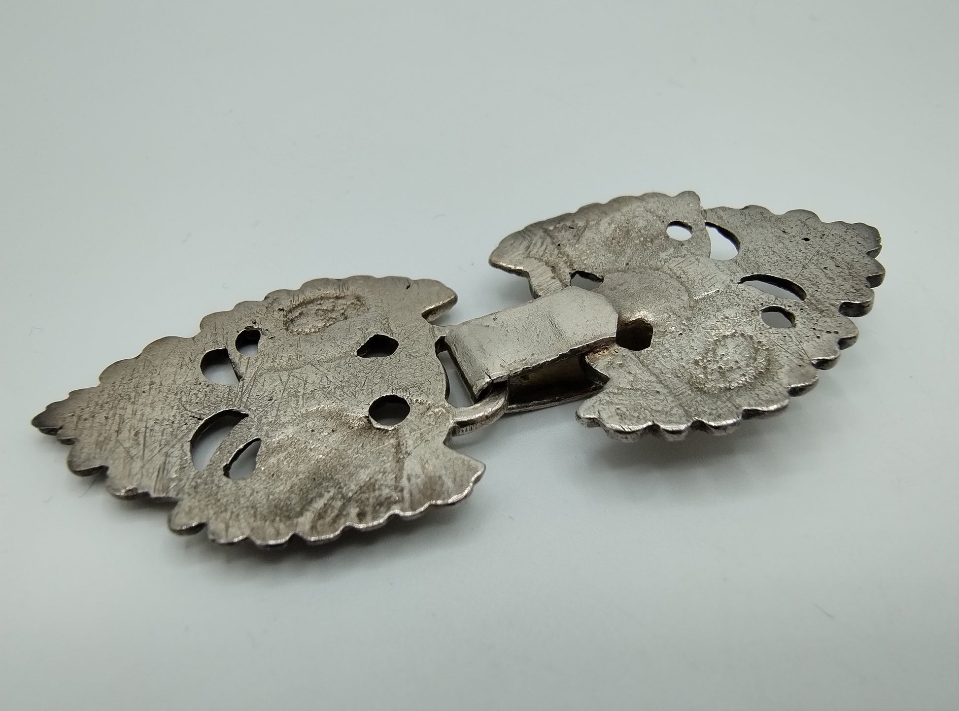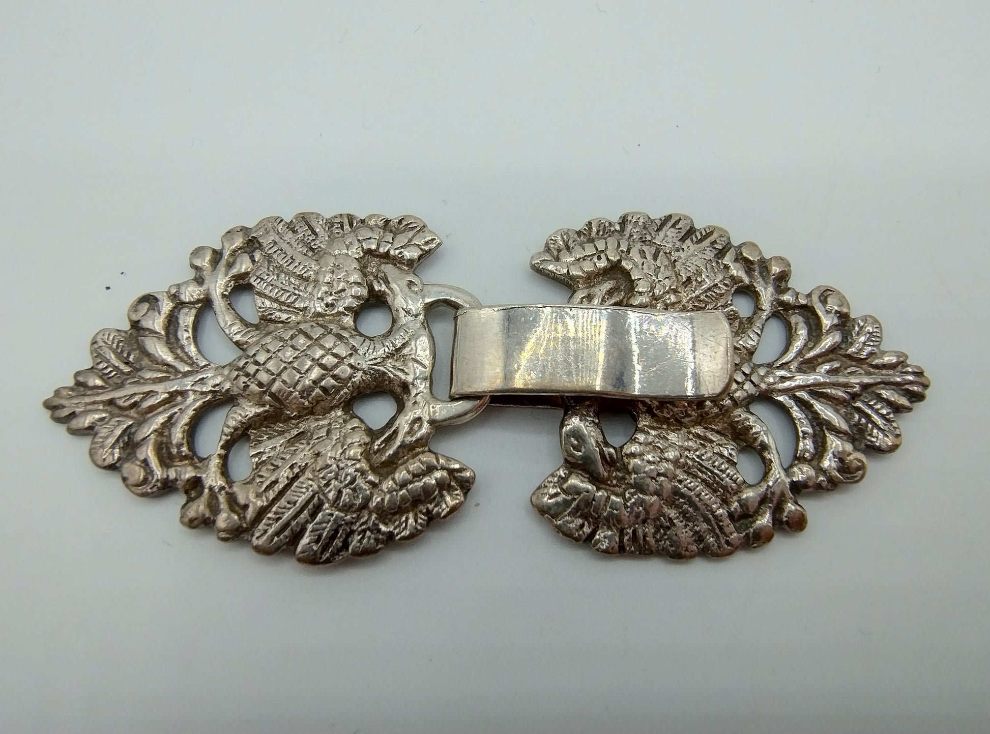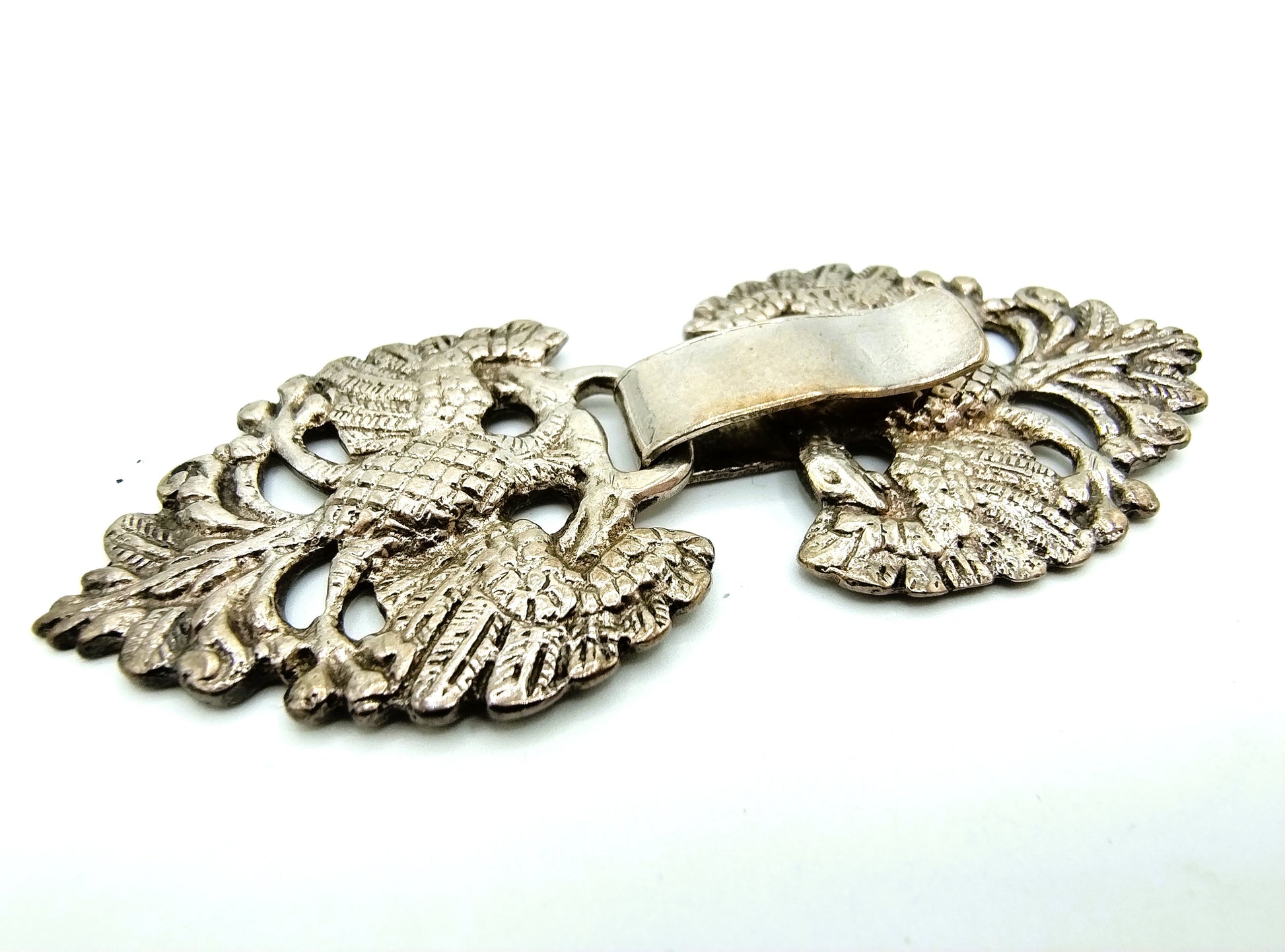 Gegoten zilveren kraalhaak of schorteslot met de afbeelding van een tweekoppige adelaar.