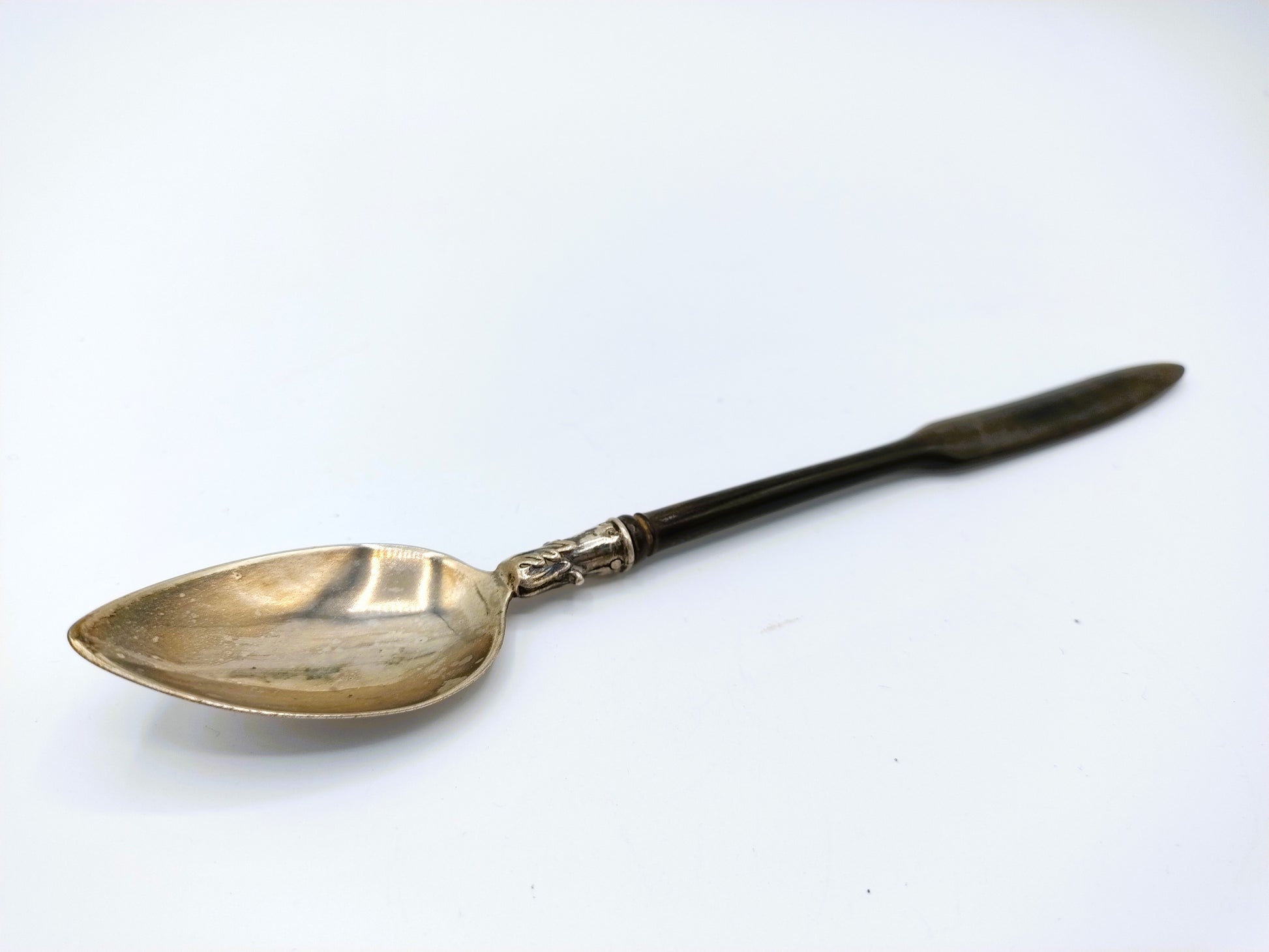 Zilveren lepel met benen of gladhouten heft. De bak is gekeurd met 13 loth voor 813/1000 gehalte en de unicorn of éénhoorn van Schwäbisch Gmünd in Duitsland.