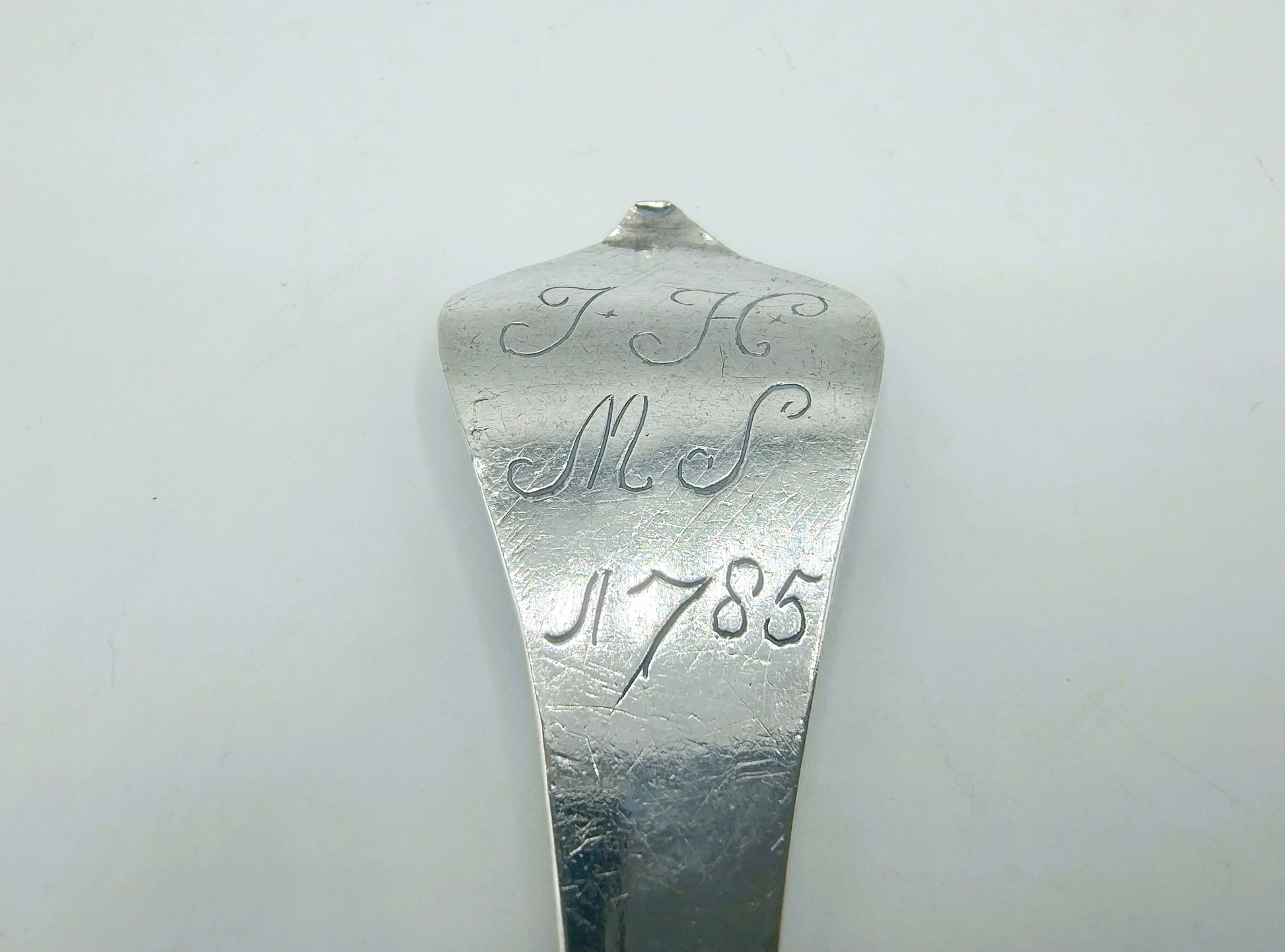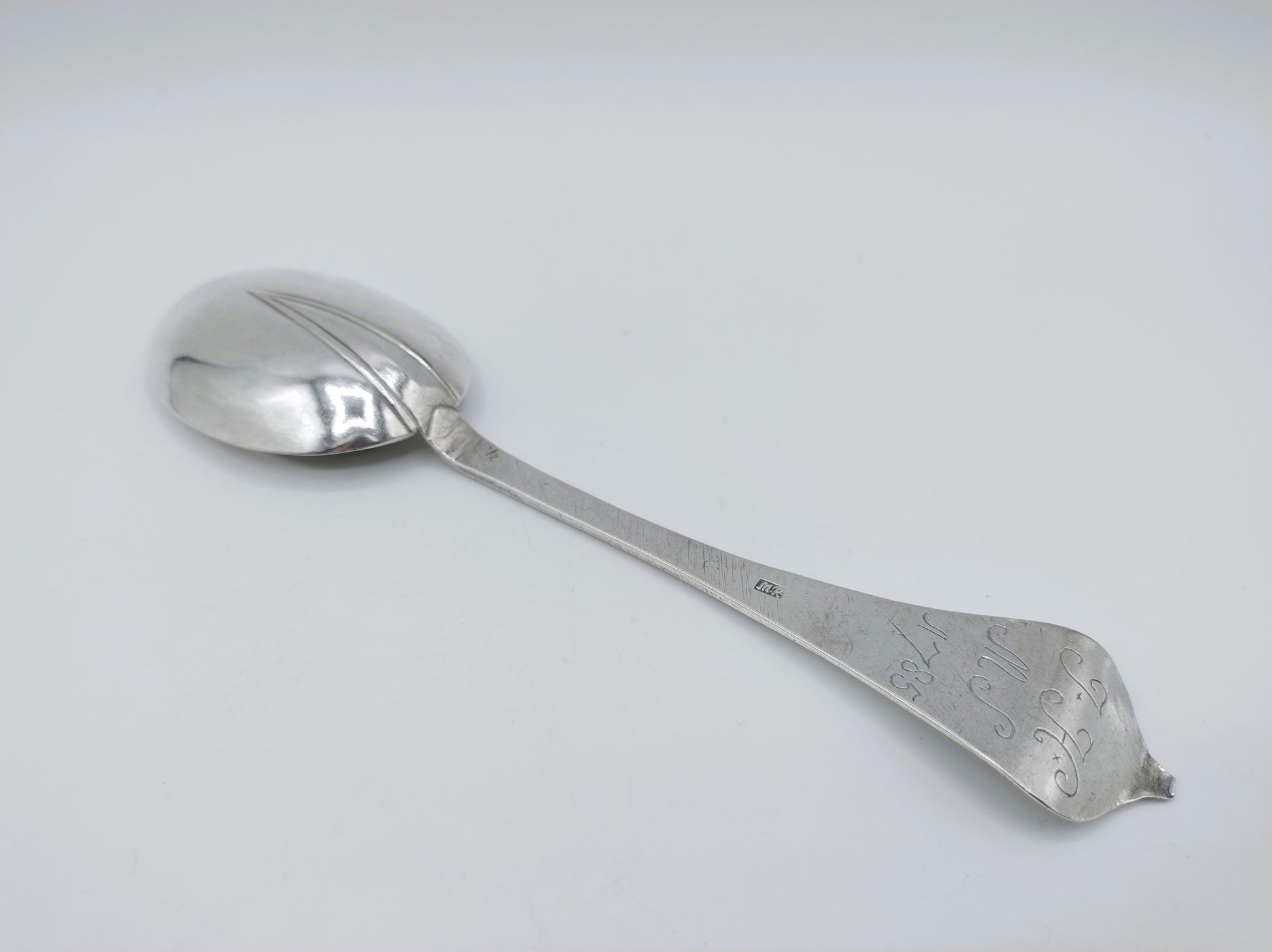 Op de steeluiteinde zijn de initialen J.H. en M.S. gegraveerd. Waarschijnlijk is deze lepel als huwelijkslepel gegeven. Tevens is het jaartal 1785 gegraveerd.