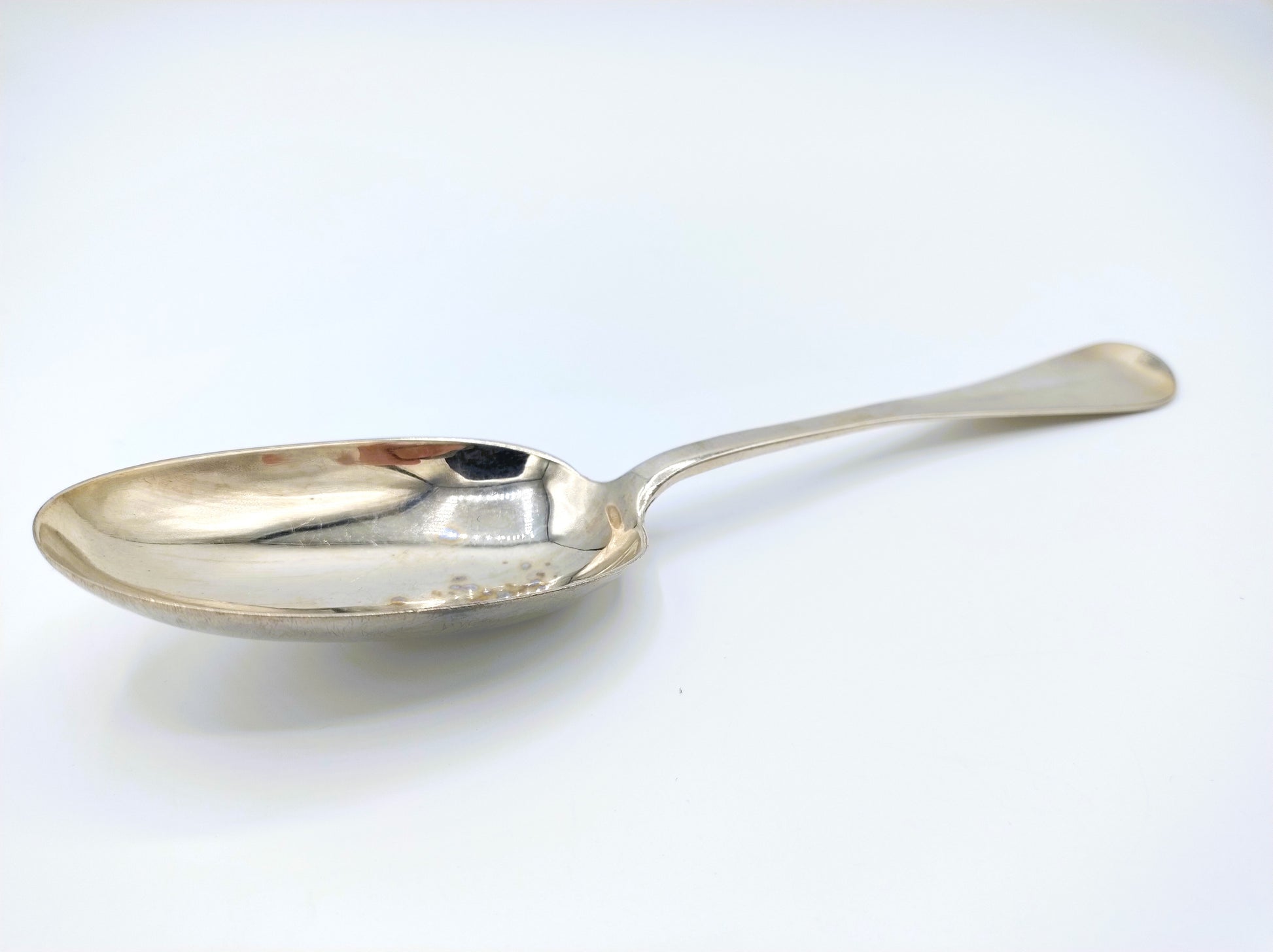 Zilveren lepel, "Hollands Glad" met zogenaamde dubbel lof van de zilversmid Minse Veddes uit Leeuwarden. Hij gebruikte dit keur tussen 1818 en 1831.