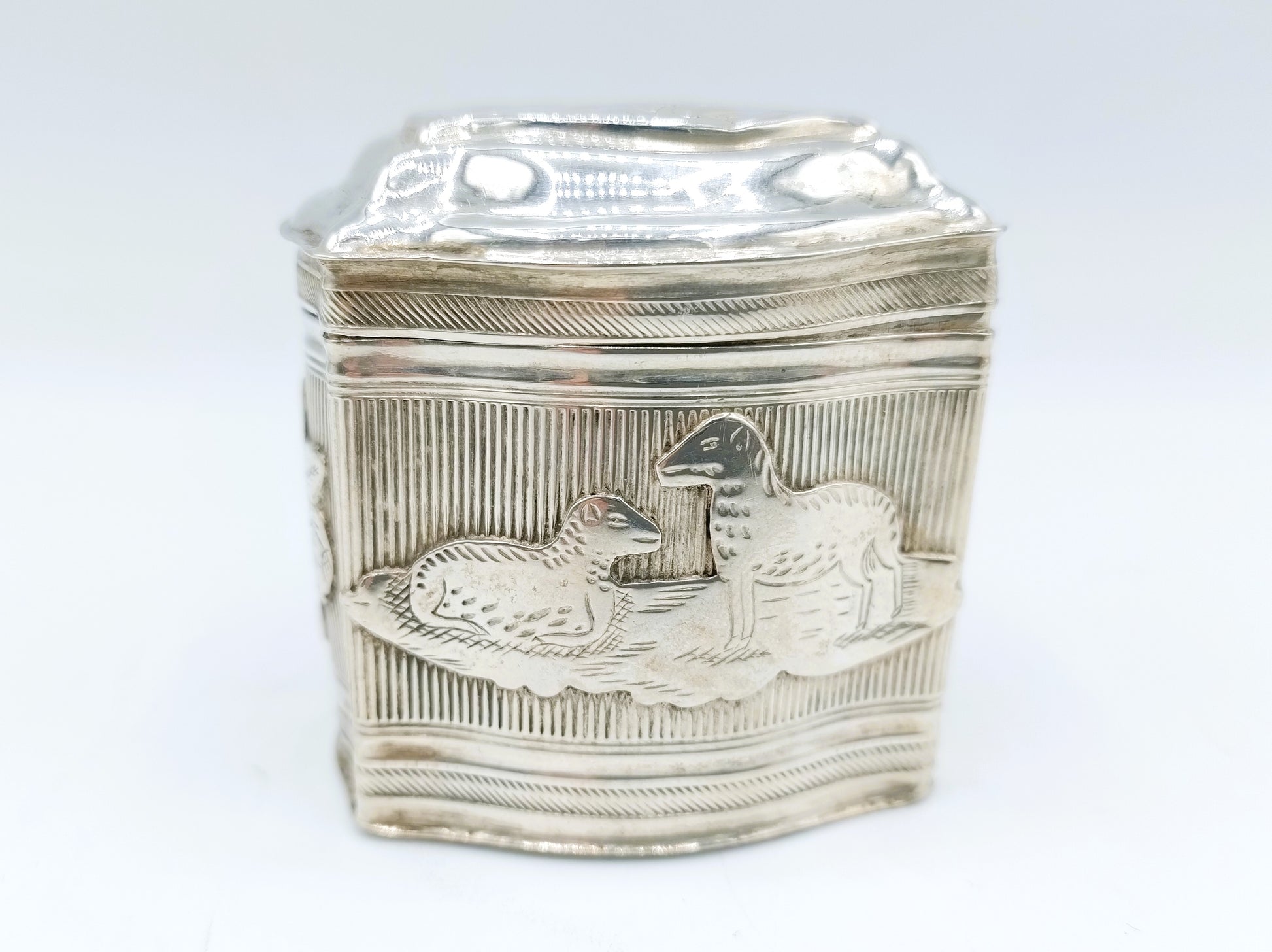Het lodereindoosje heeft een uniek decor van schapen. Waarschijnlijk in opdracht voor een boer gemaakt.