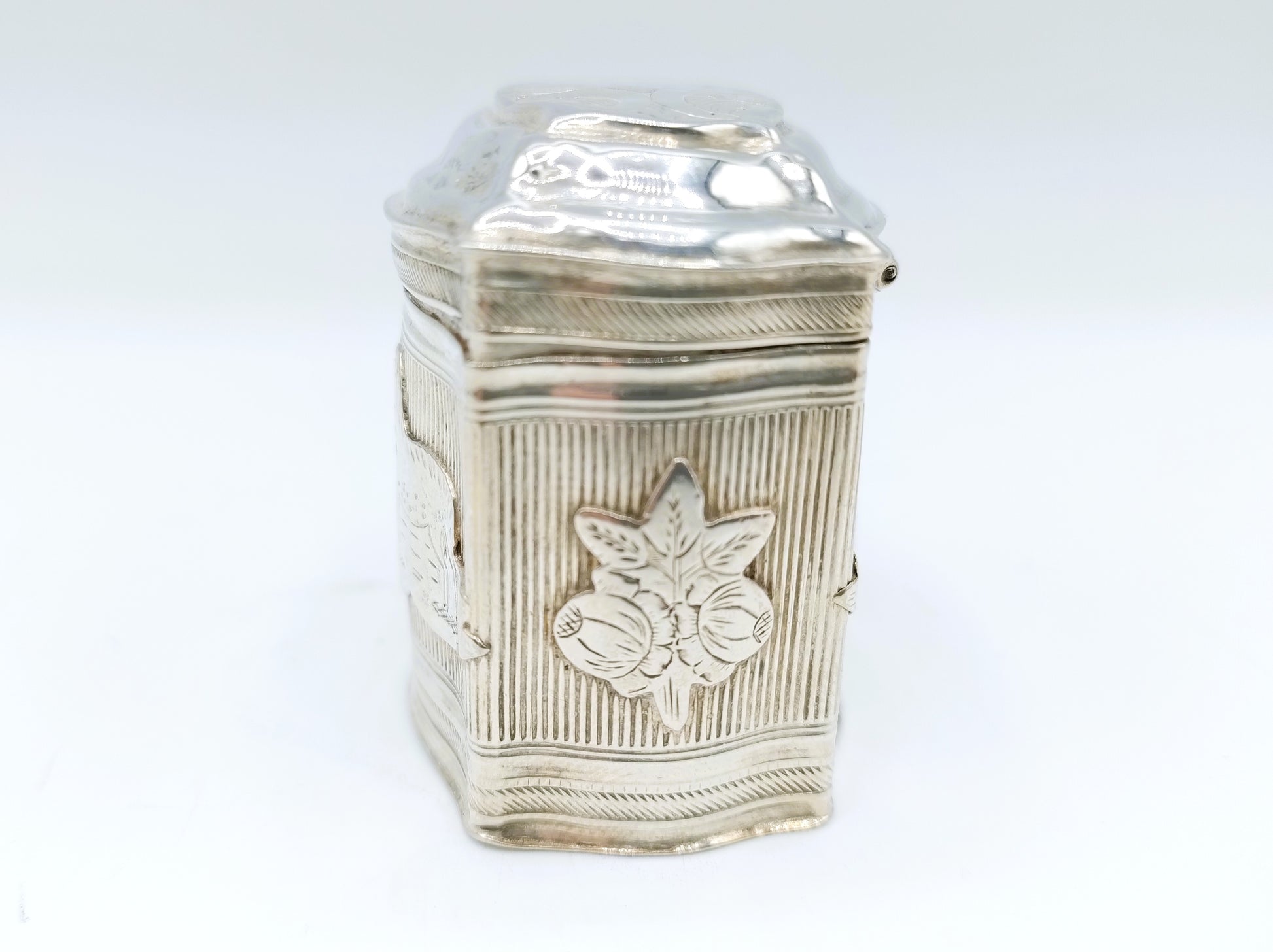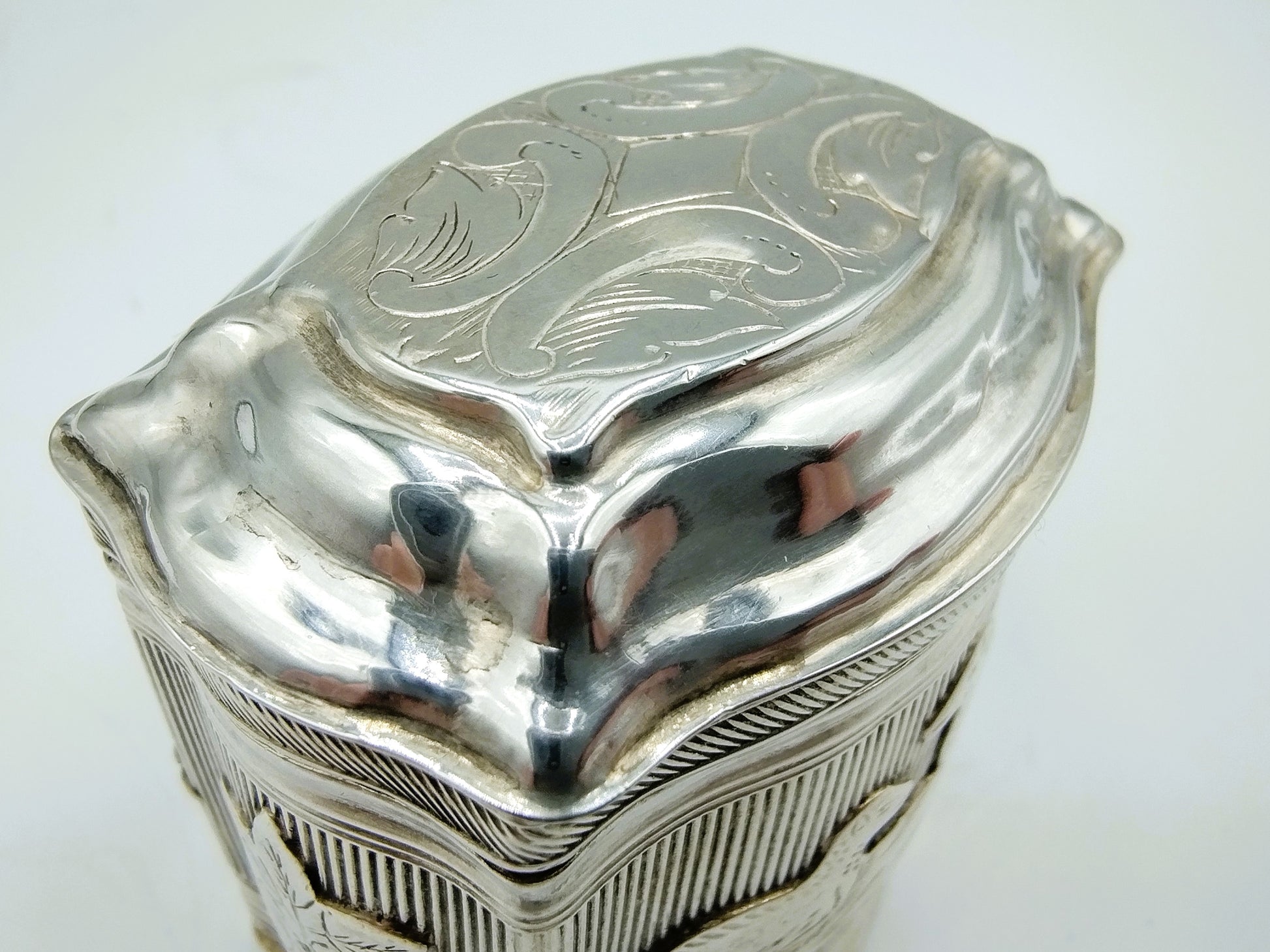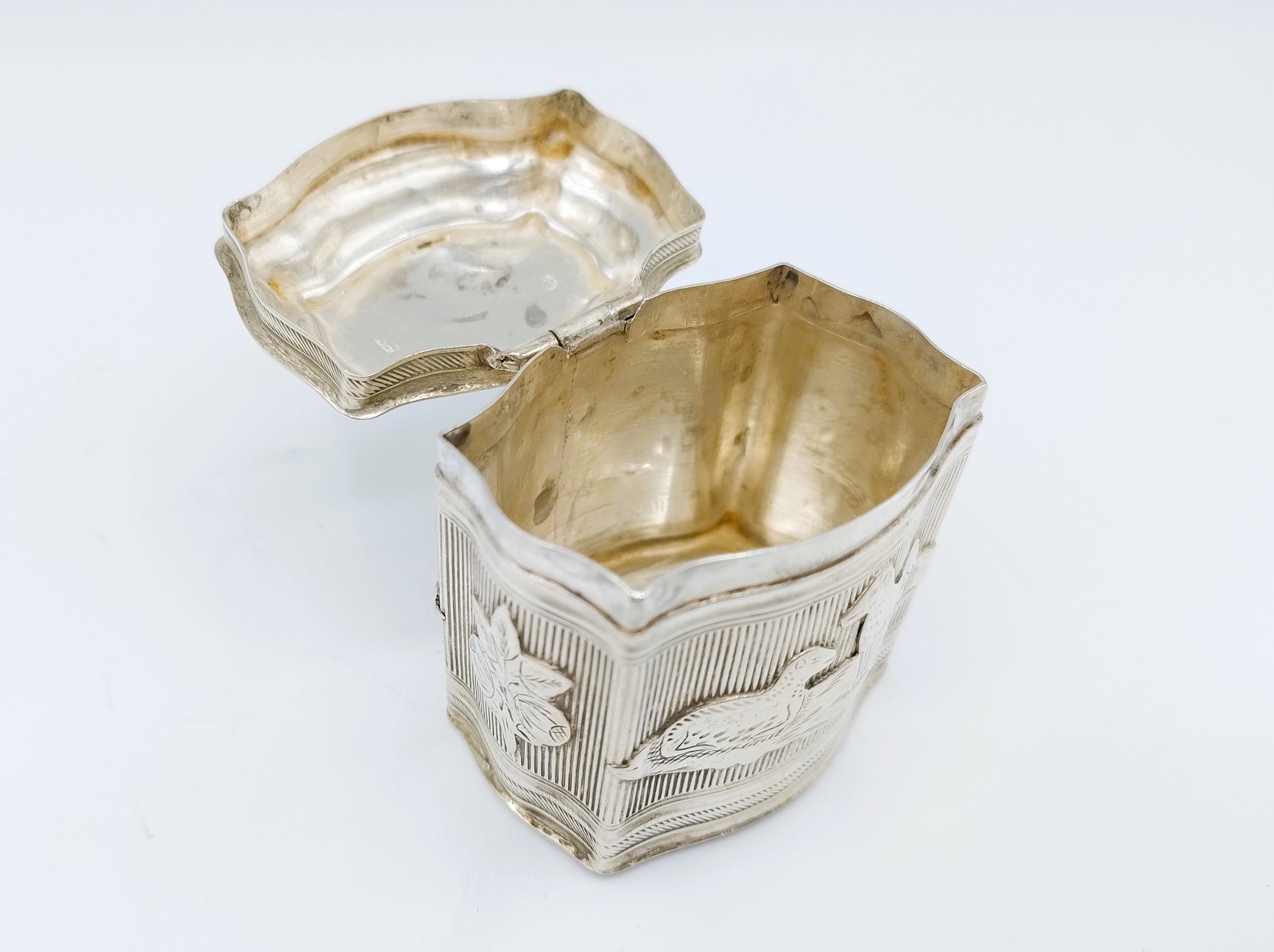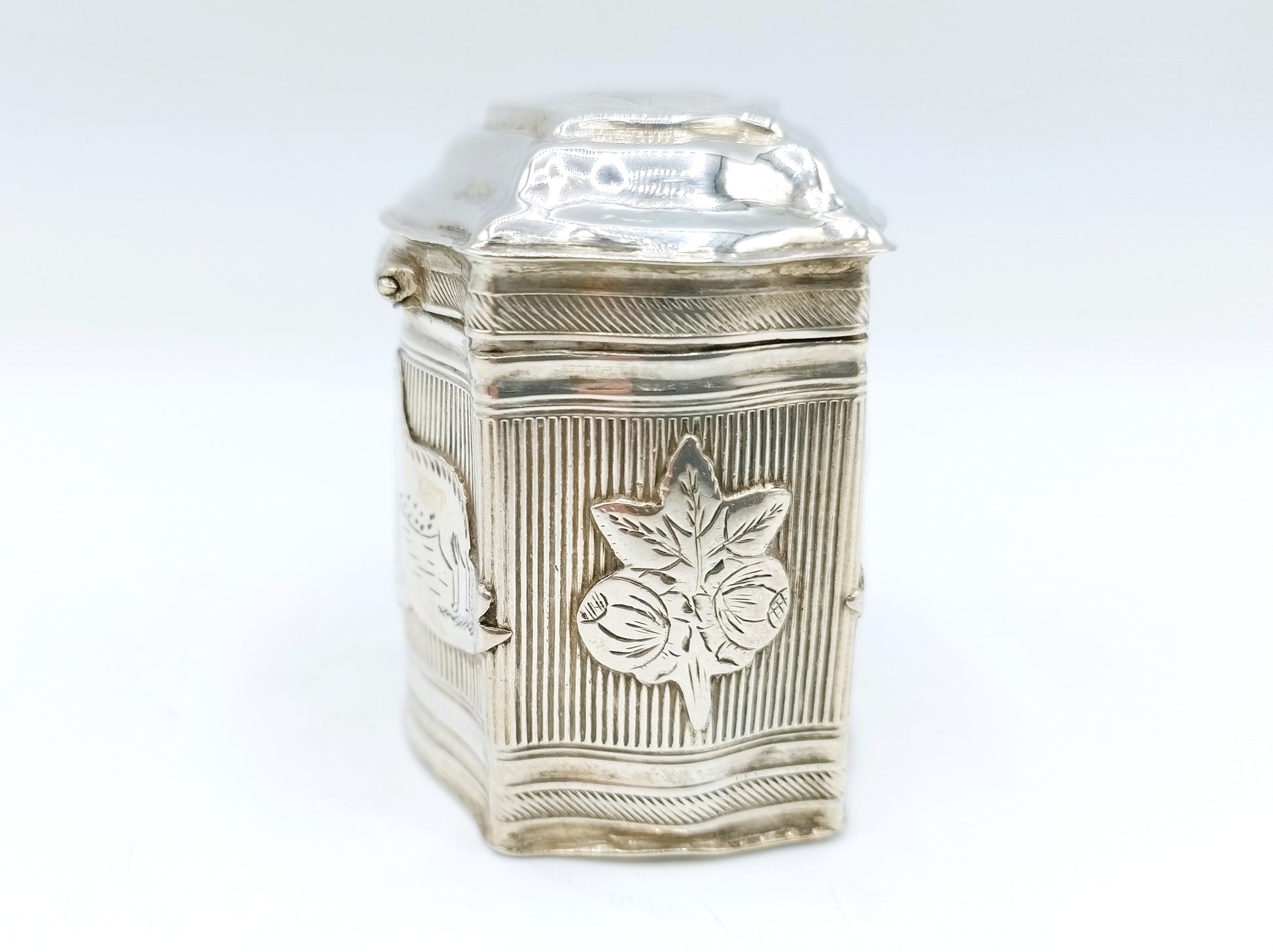 Antiek zilveren lodereindoosje gemaakt door Chr. J. Brunings uit Joure. Werkzaam vanaf 1849. Het doosje is gekeurd met het tweede gehalte keur, minervakop, jaarletter X voor 1859 en meesterkeur B77.