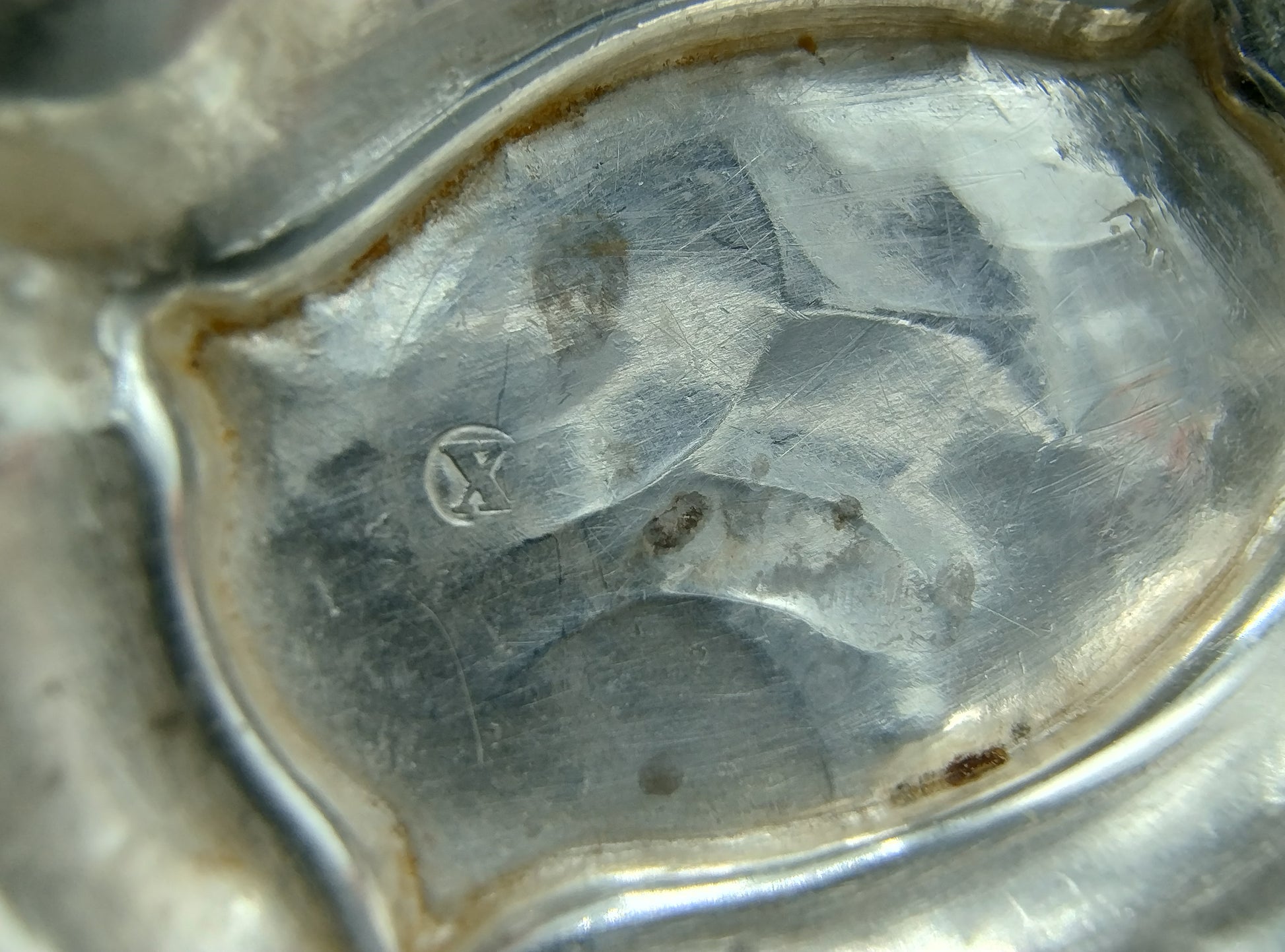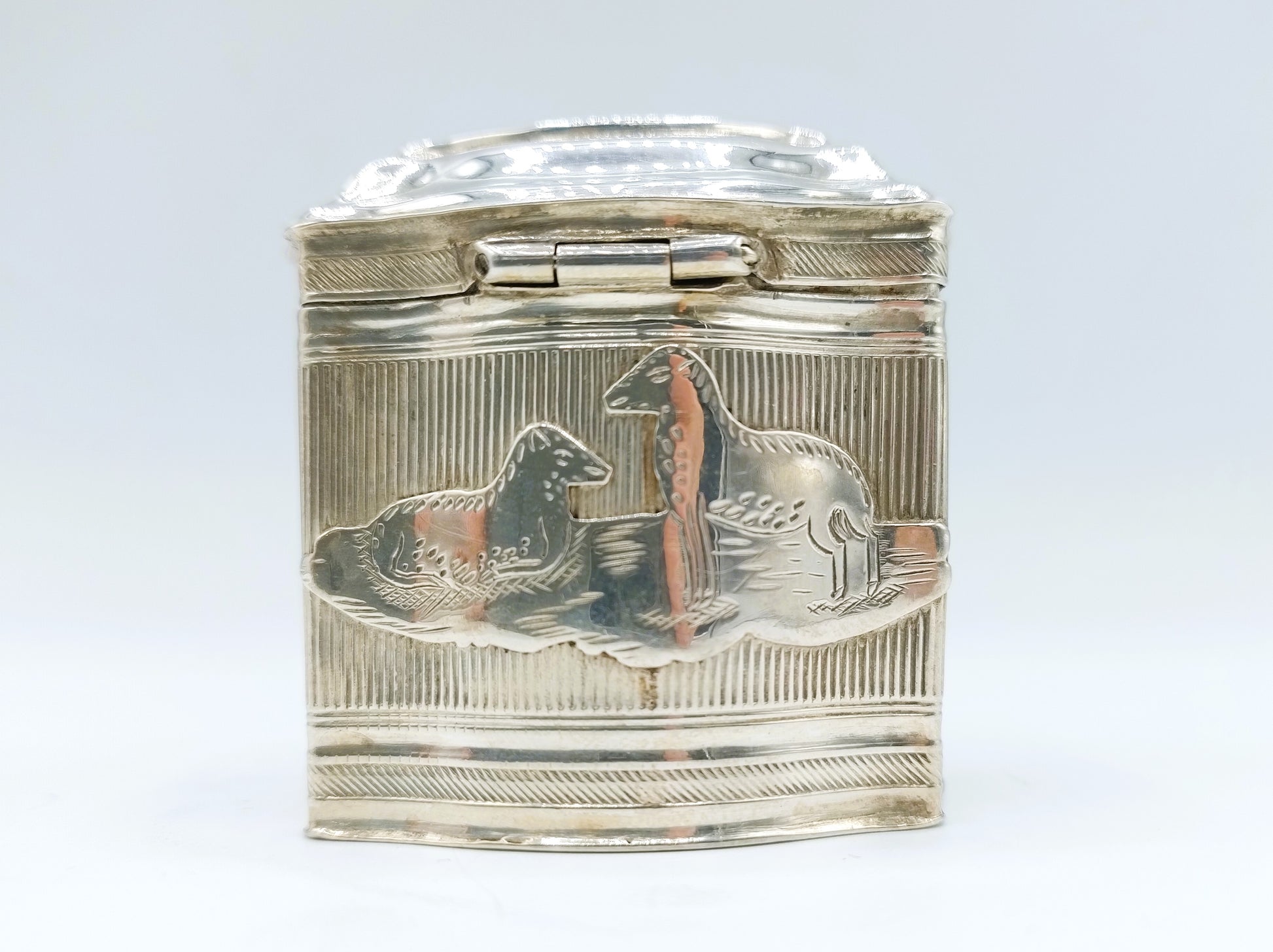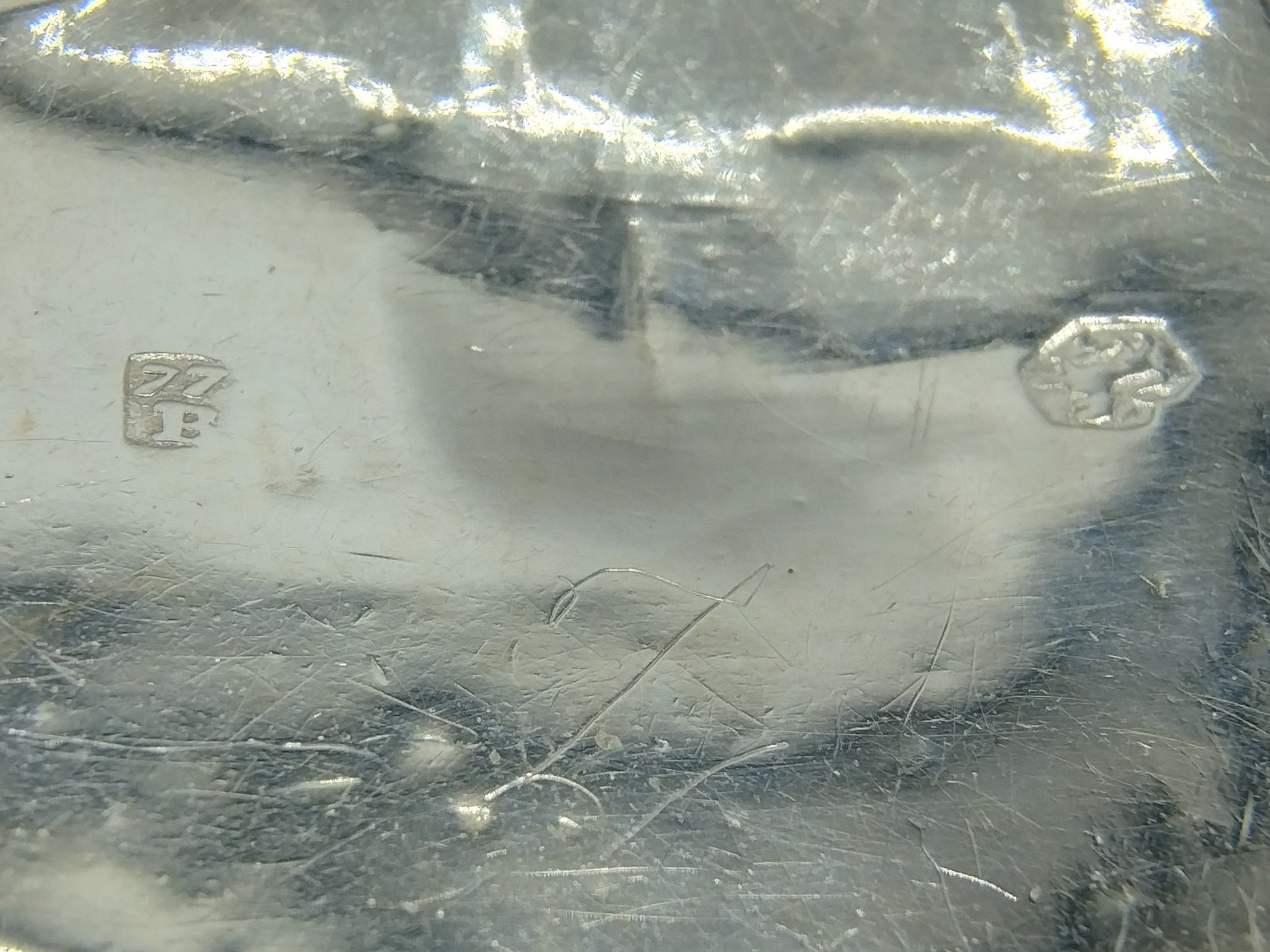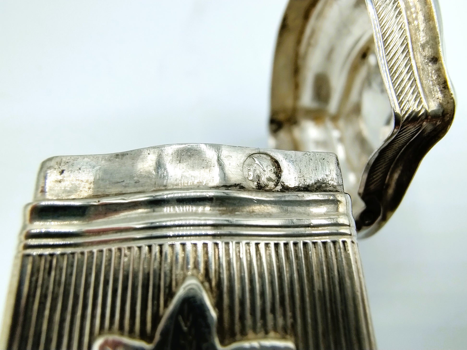 Antiek zilveren lodereindoosje gemaakt door Chr. J. Brunings uit Joure. Werkzaam vanaf 1849. Het doosje is gekeurd met het tweede gehalte keur, minervakop, jaarletter X voor 1859 en meesterkeur B77.