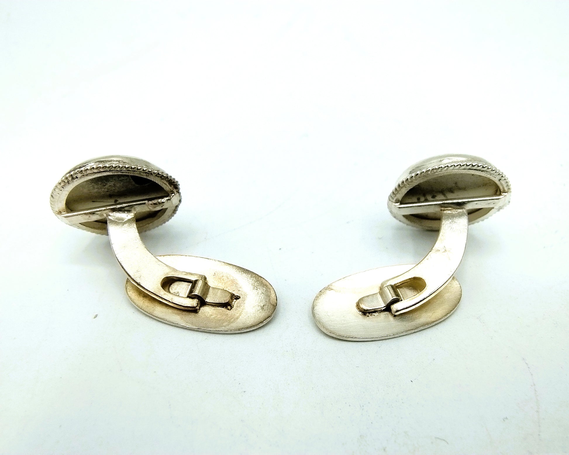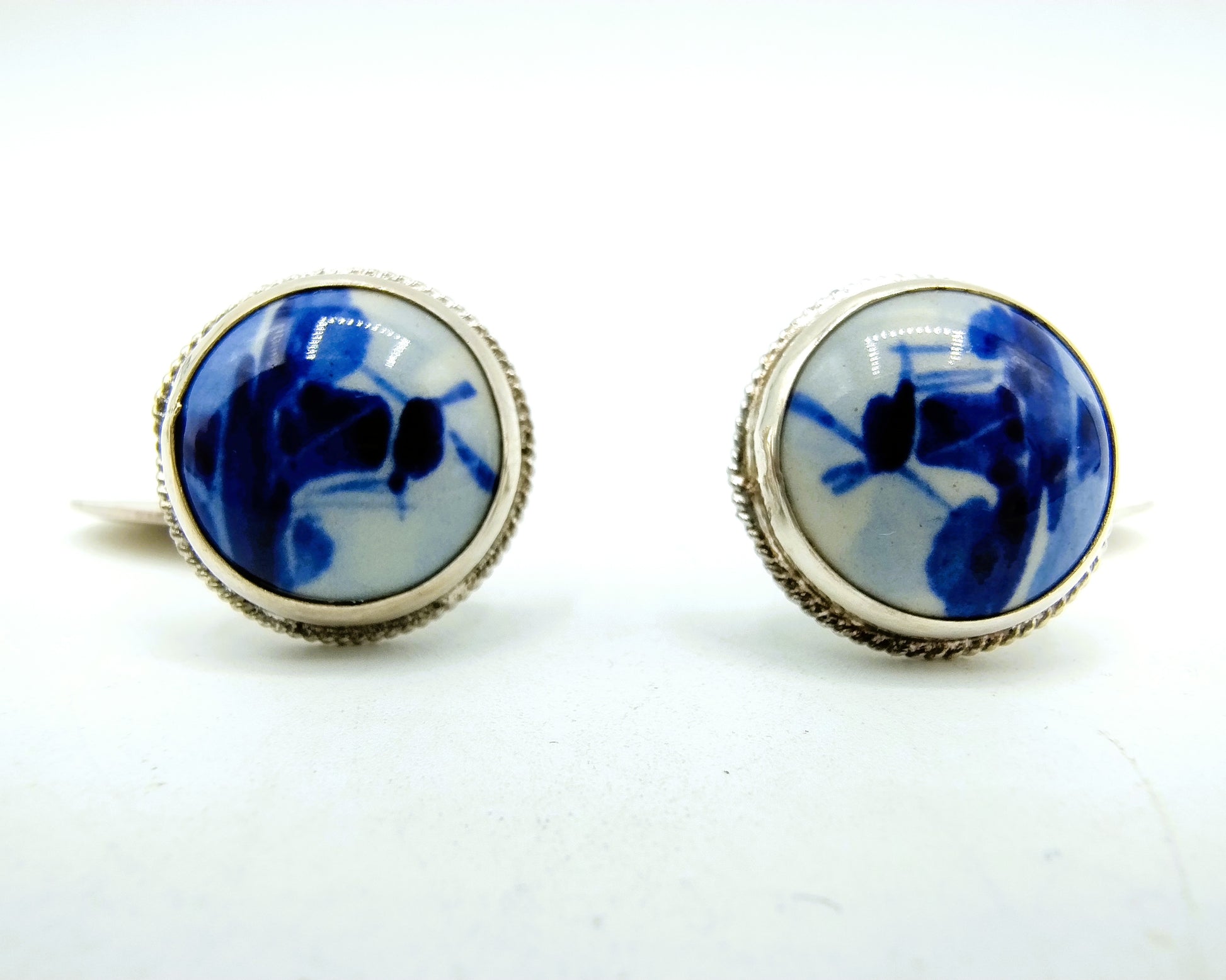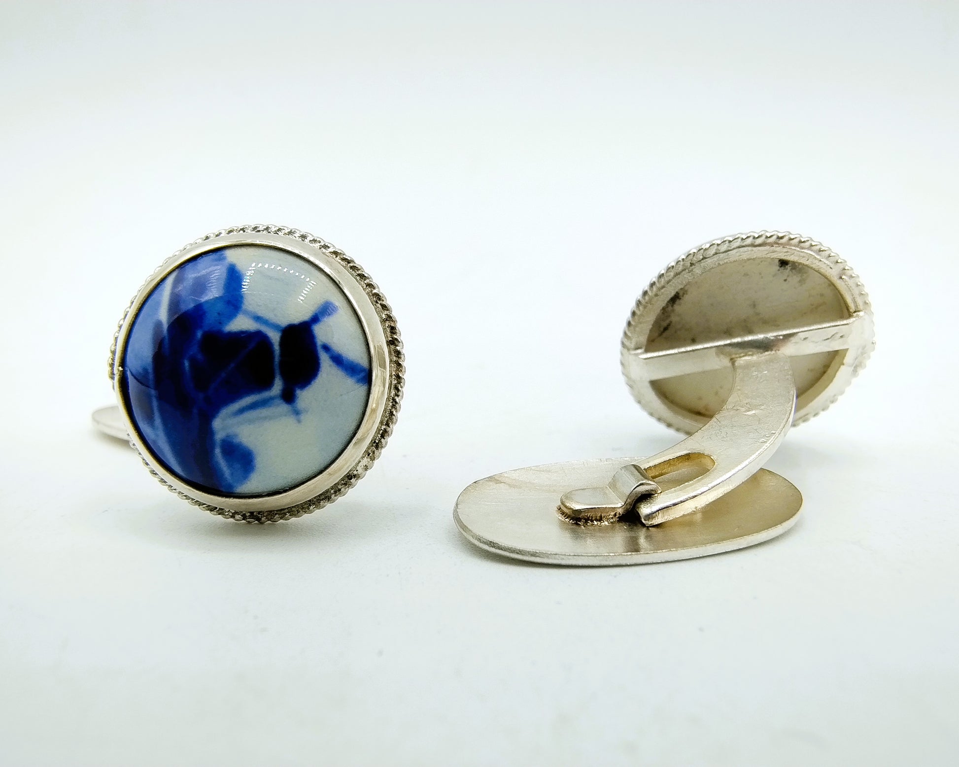 Zilveren manchetknopen met Delfts blauwe keramieken afbeelding van een molen. Deze afbeelding is gezet in een gladde kast.