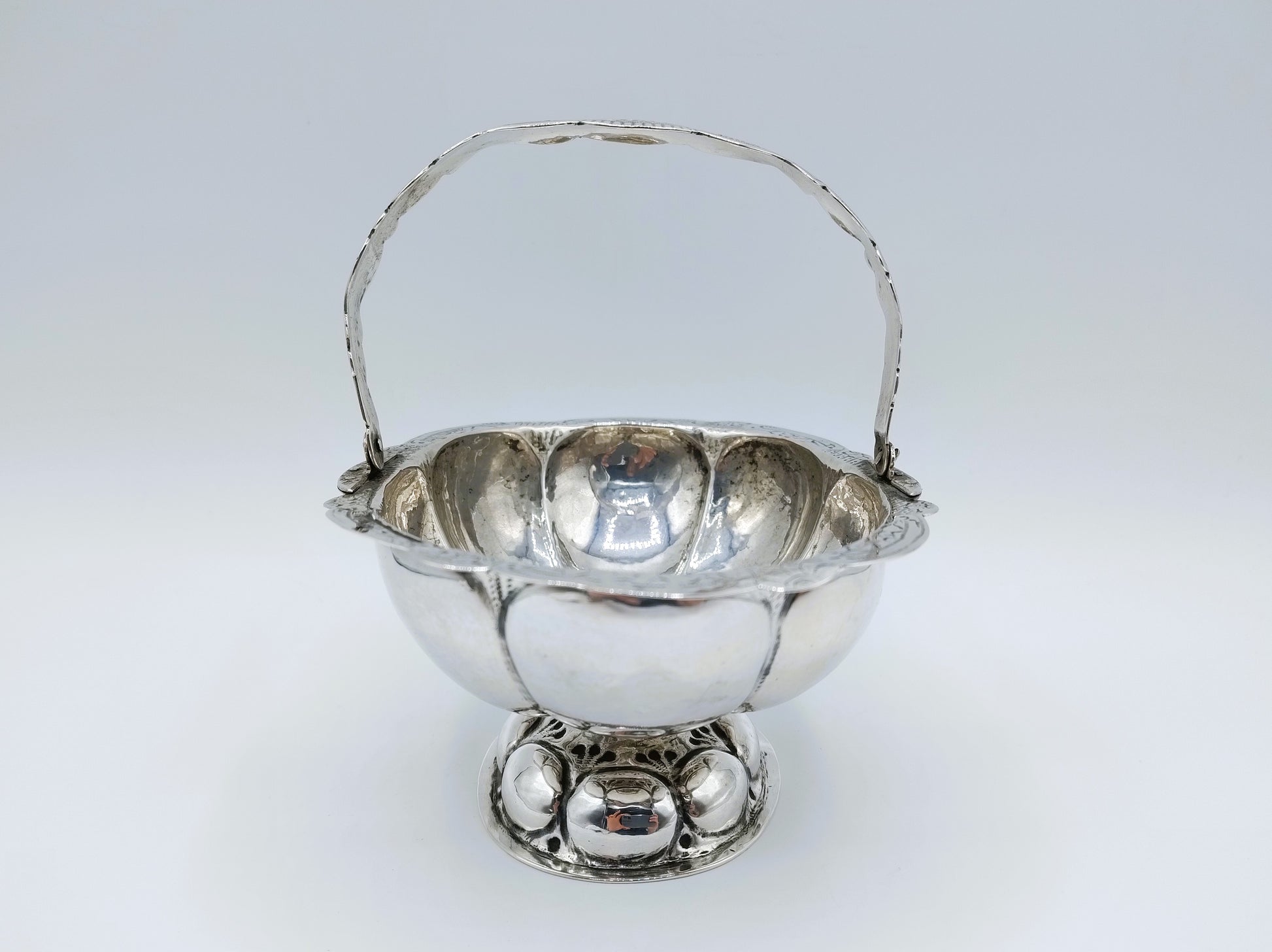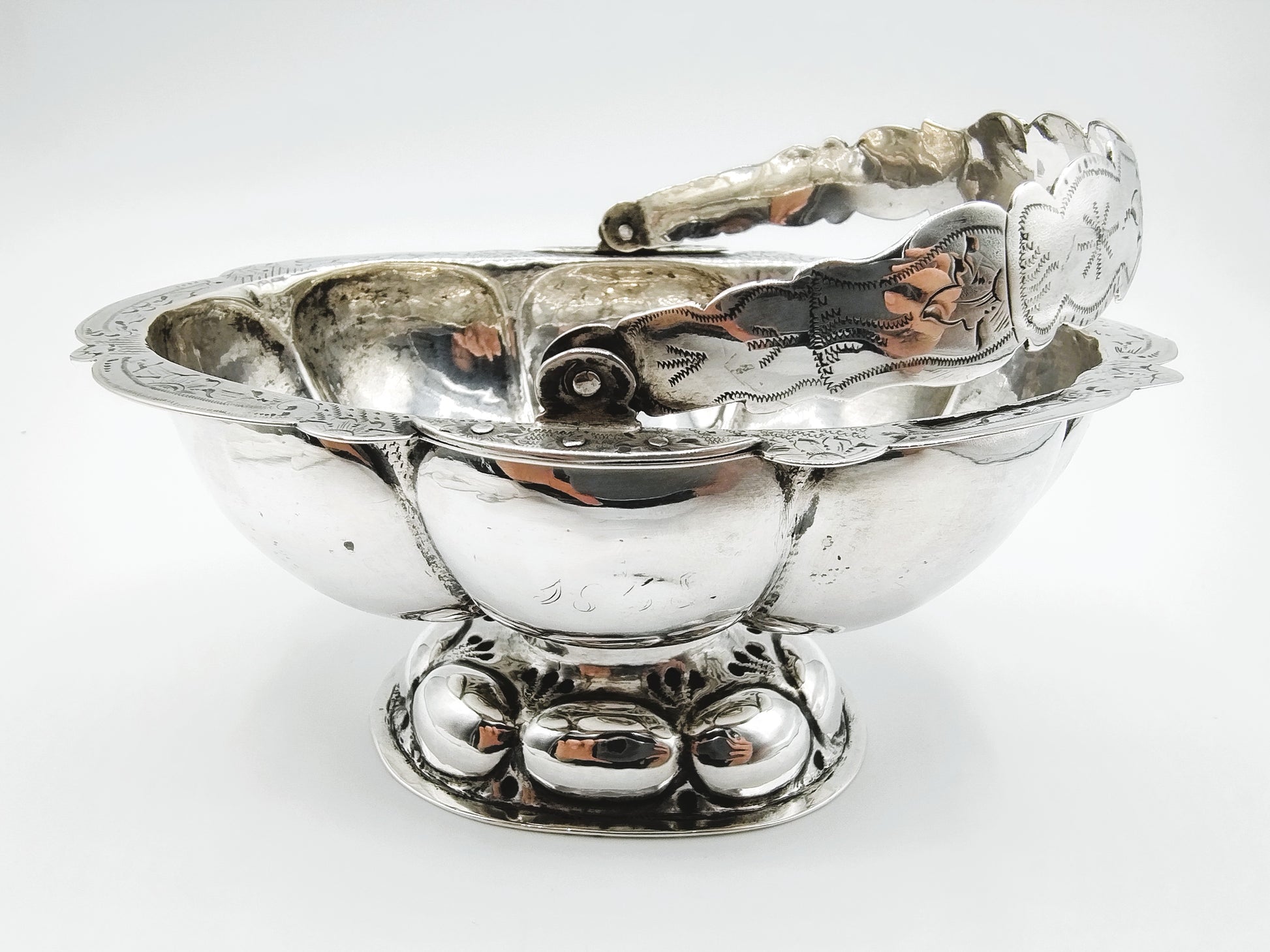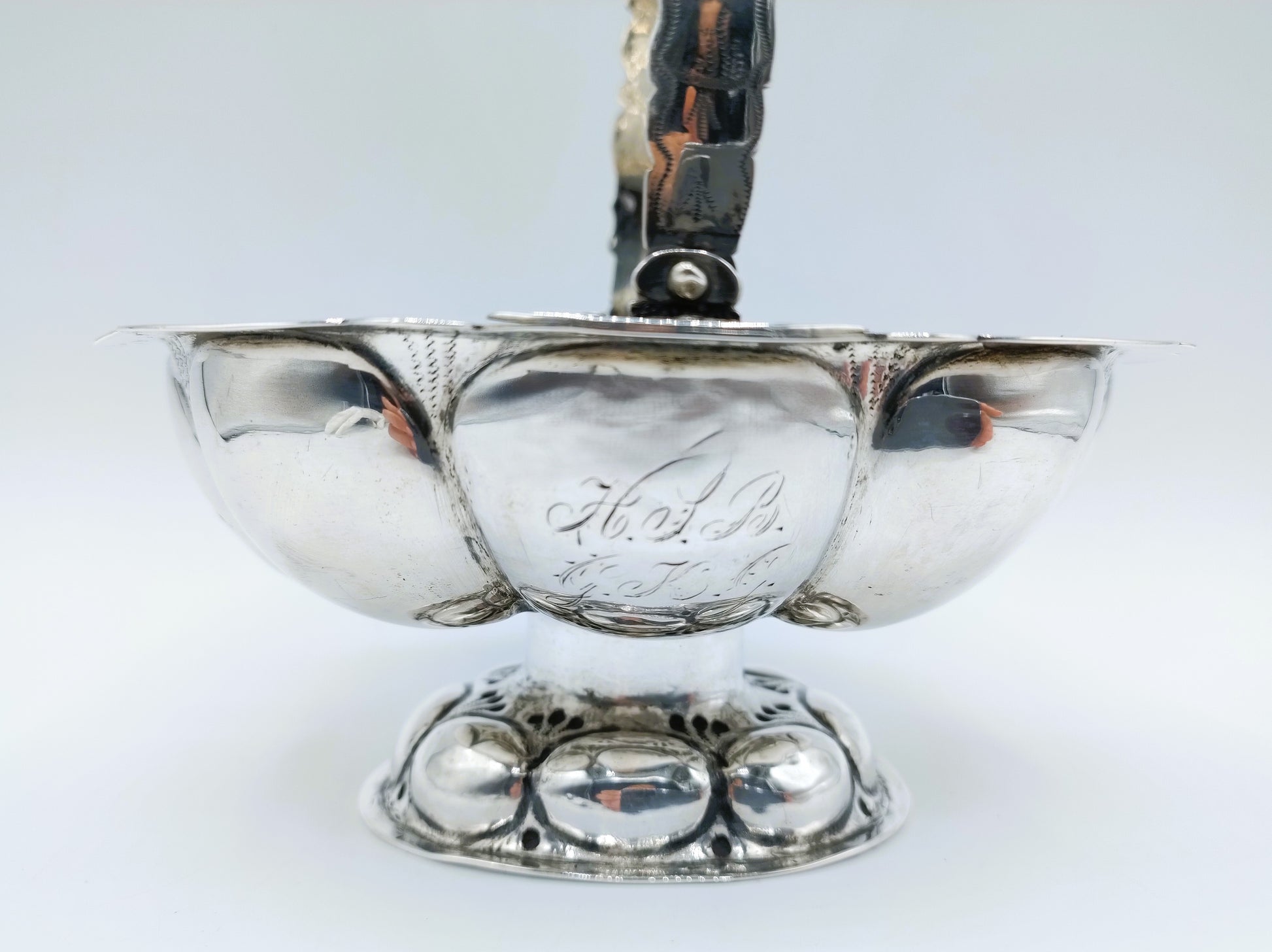 Het gaat om een achtlobbige, typisch Groninger model brandewijnkom geplaatst op een eveneens achtlobbige voet. Op de kom zijn de initialen gegraveerd van het bruidspaar (?) HJB, GKG. Aan de andere kant van de kom is het jaartal 1858 gegraveerd.