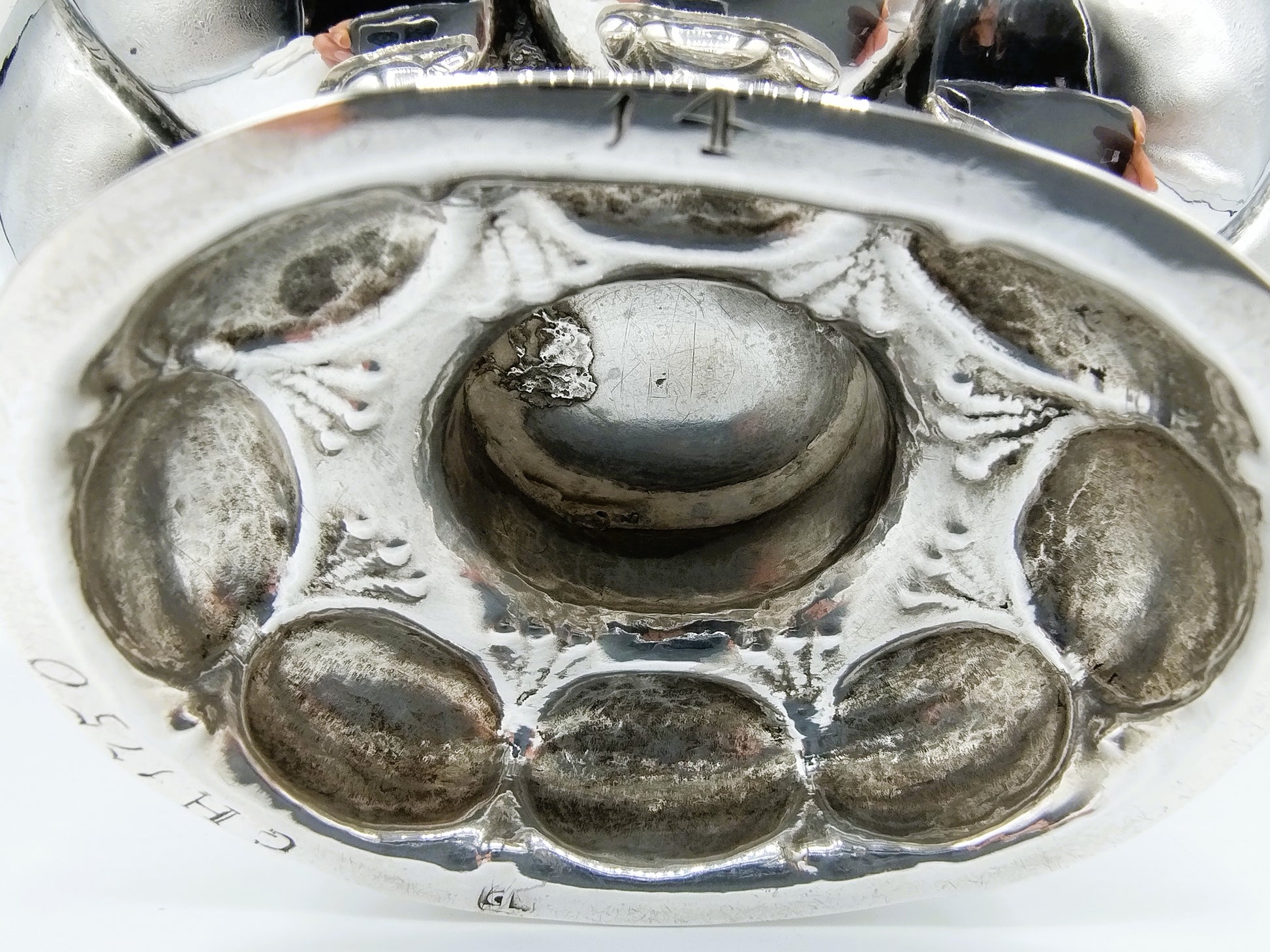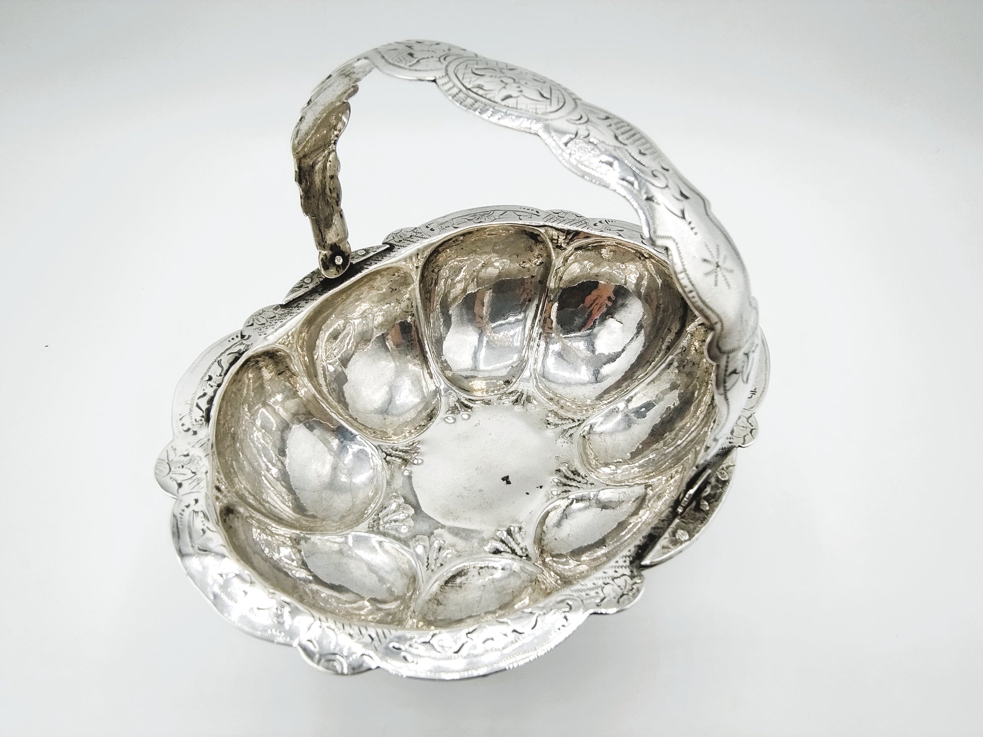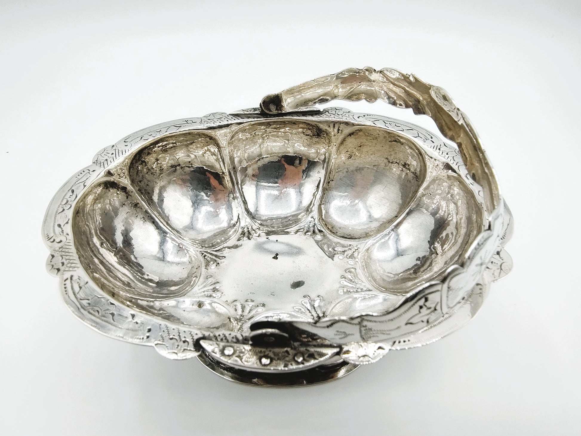 Het gaat om een achtlobbige, typisch Groninger model brandewijnkom geplaatst op een eveneens achtlobbige voet. Op de kom zijn de initialen gegraveerd van het bruidspaar (?) HJB, GKG. Aan de andere kant van de kom is het jaartal 1858 gegraveerd.