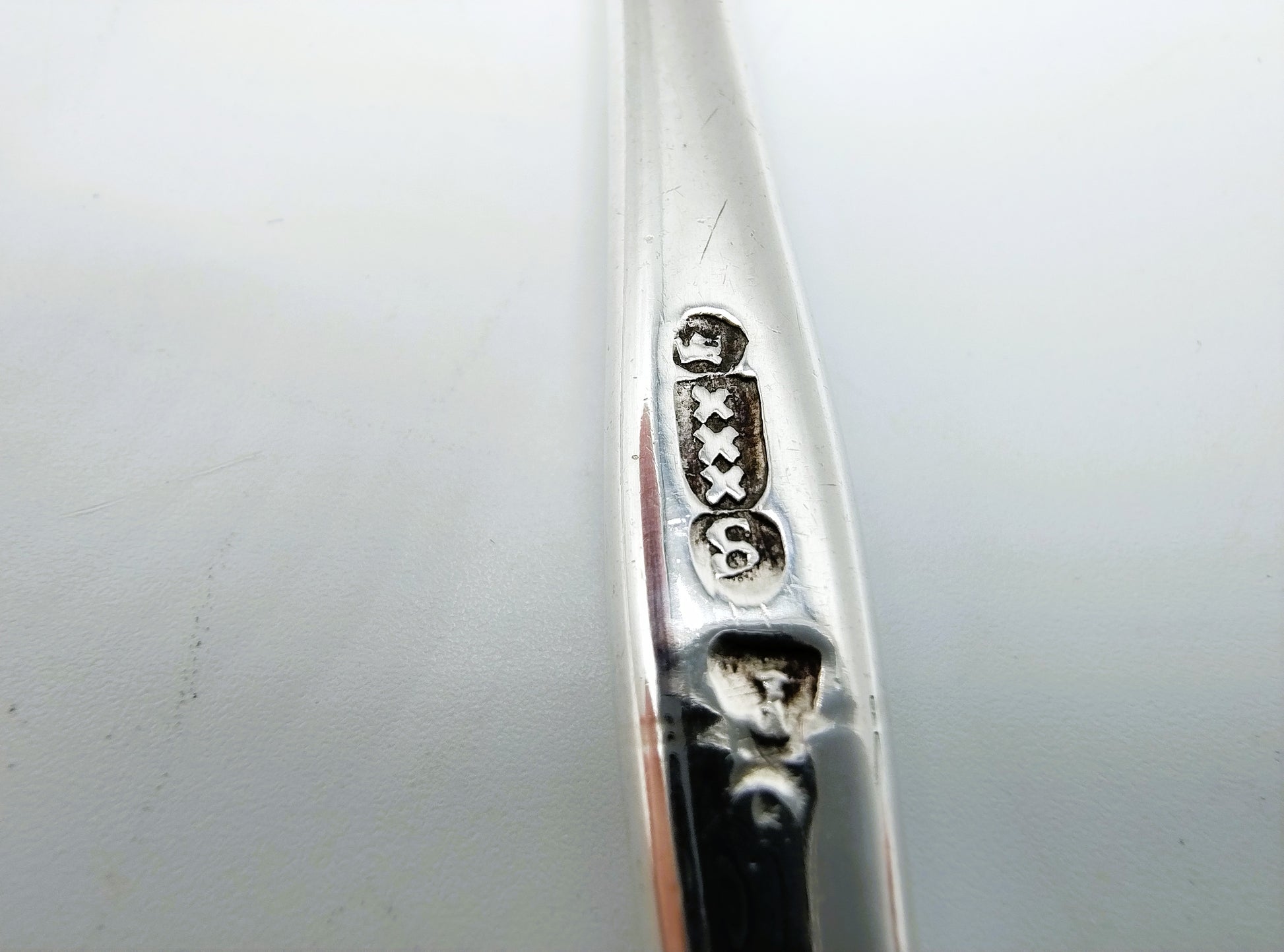 Aan de achterzijde op de steel gemerkt met meesterteken OP, stadskeur Amsterdam en jaarletter s voor 1752.