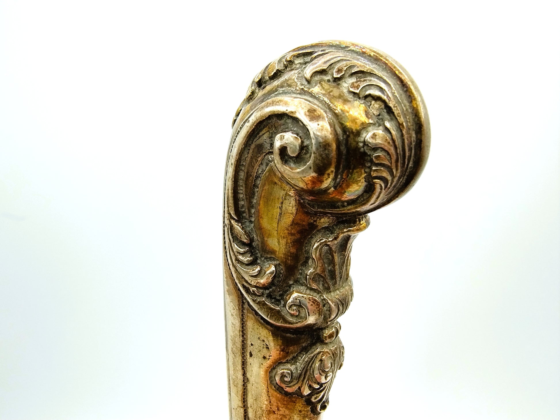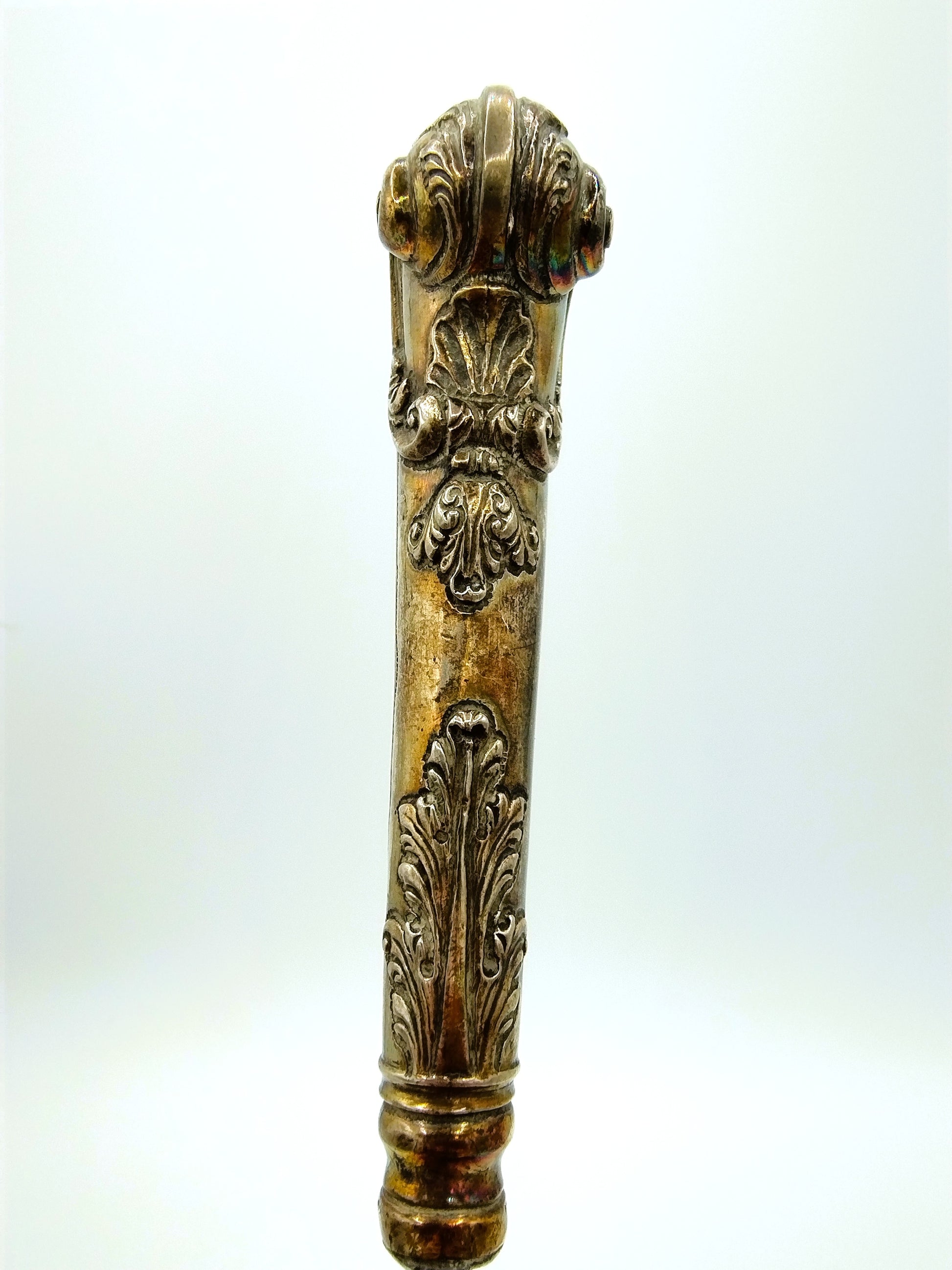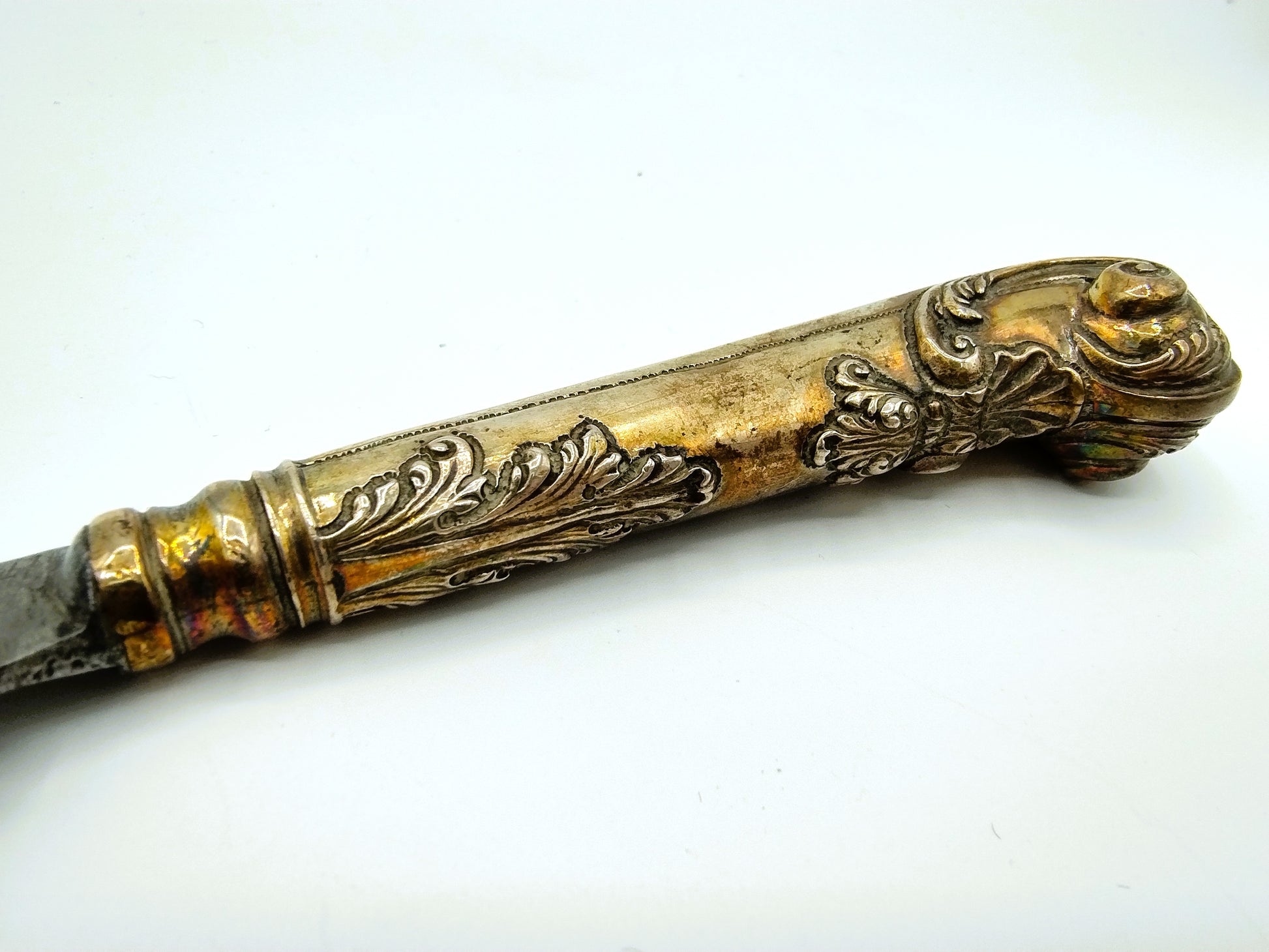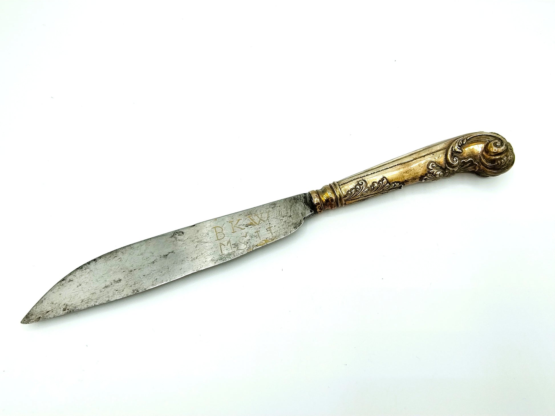 Het mes is voorzien van een pistoolheft met florale versiering en C voluten in de Lodewijk de 15e stijl. Waarschijnlijk afkomstig uit Nederland gezien de stijl, maar onduidelijk gekeurd. (Mogelijk stadskeur Leiden)