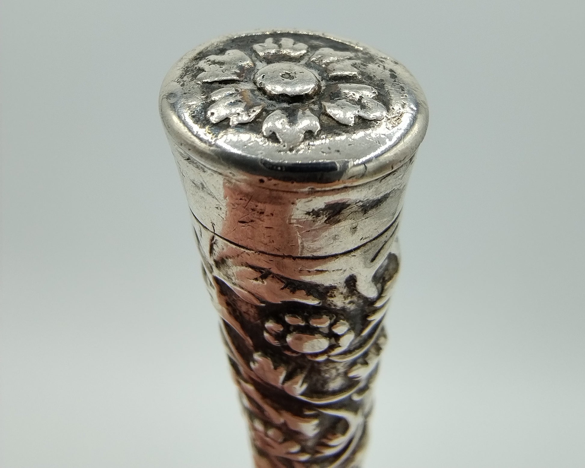 Het zilveren heft is voorzien van een floraal banddecor. Ook op de platte bekroning is een bloem afgebeeld.
