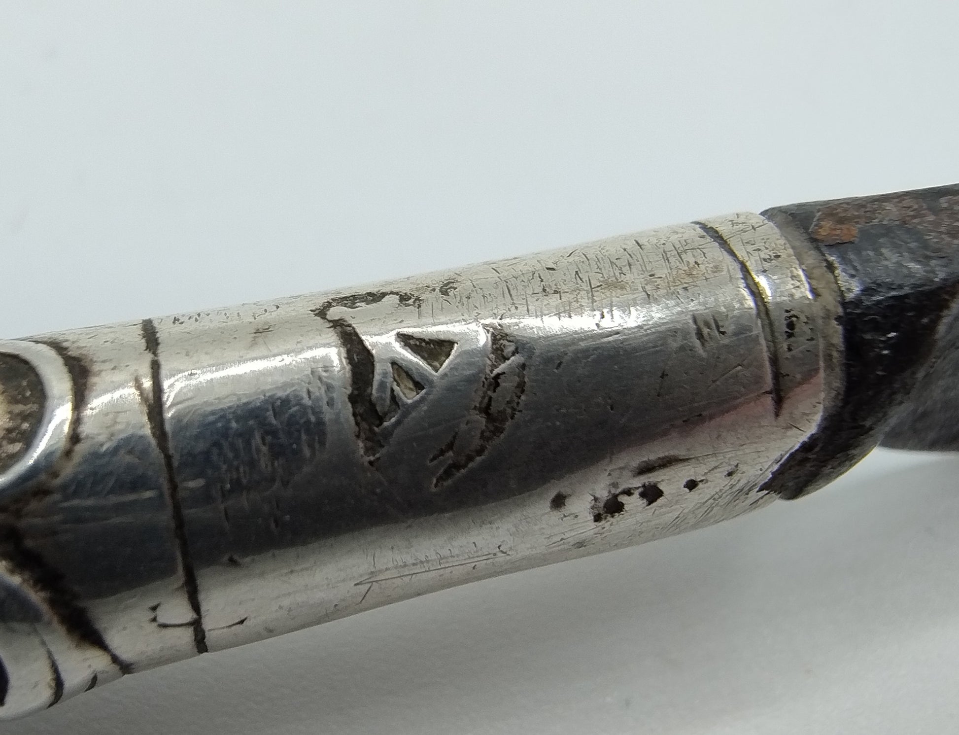 Het mesheft is gekeurd met een meesterteken schip, behorend bij een onbekende zilversmid uit Amsterdam werkzaam vanaf 1720 en het stadskeur van Amsterdam.