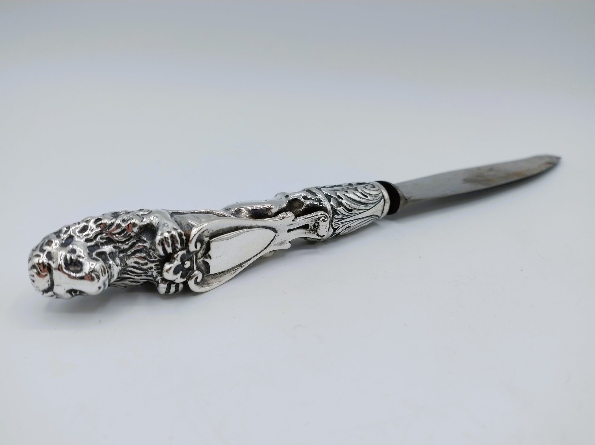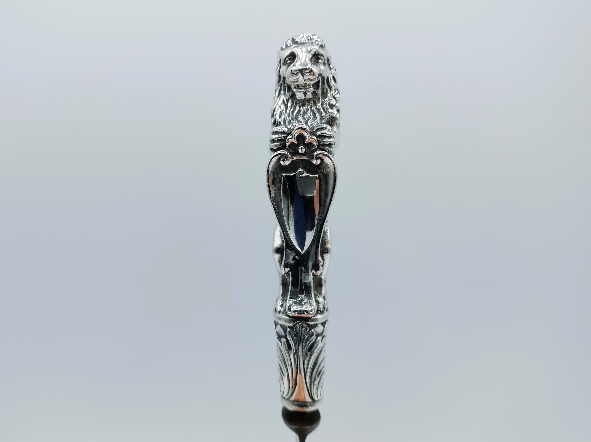 Gegoten mesheft met een leeuw die een schild vasthoudt, gemaakt door de firma B. W van Eldik & A.F. van der Scheer ook wel bekend als Hollandia Zilversmeden, Zutphen. Het keur is gebruikt tussen 1917 en 1950.