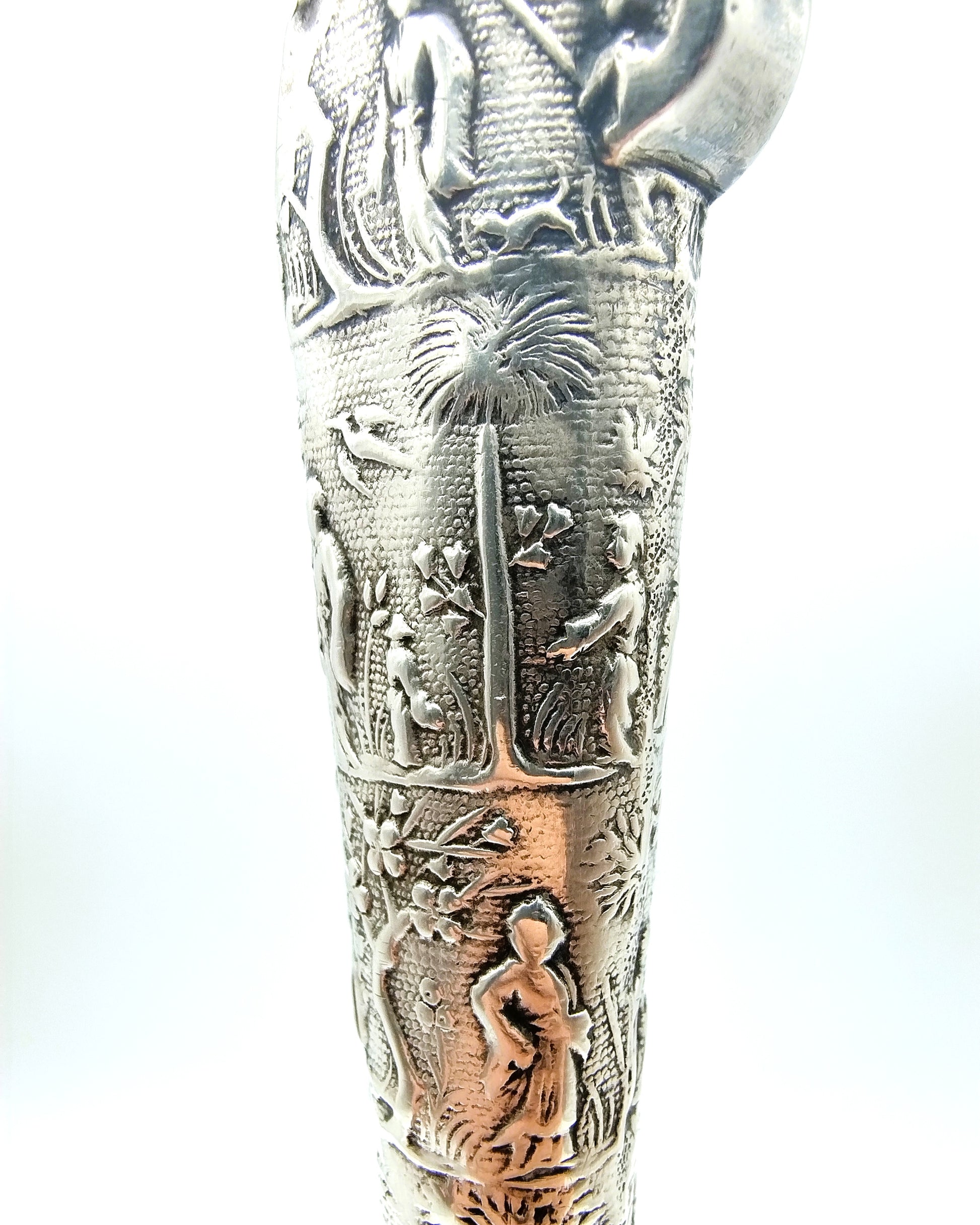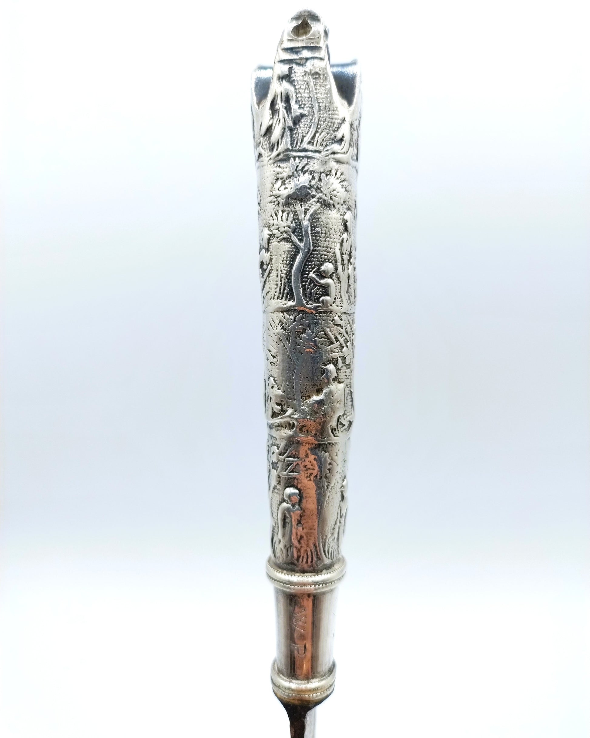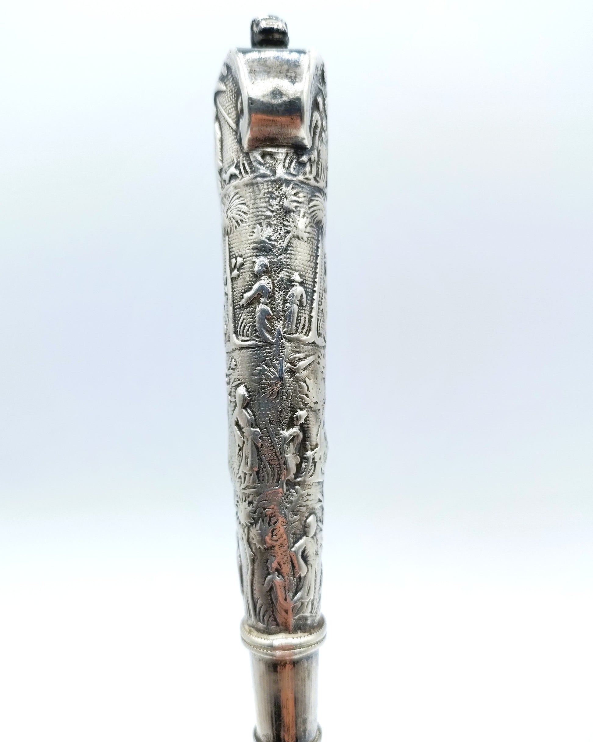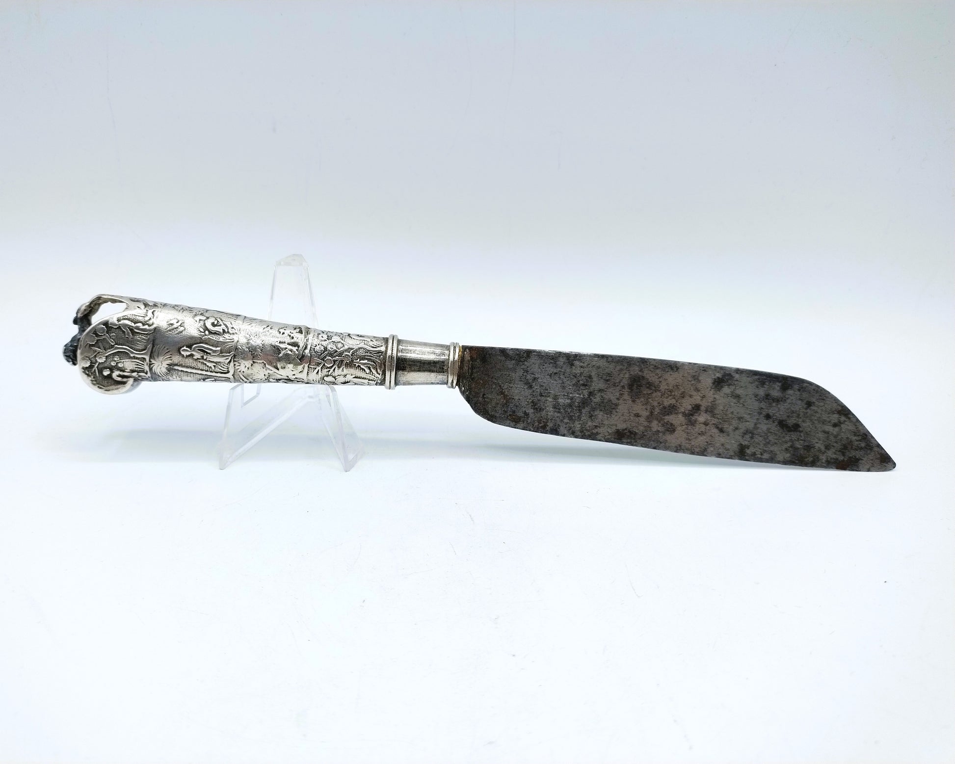 Het zilveren mesheft is voorzien van een banddecor met allegorische voorstelling.